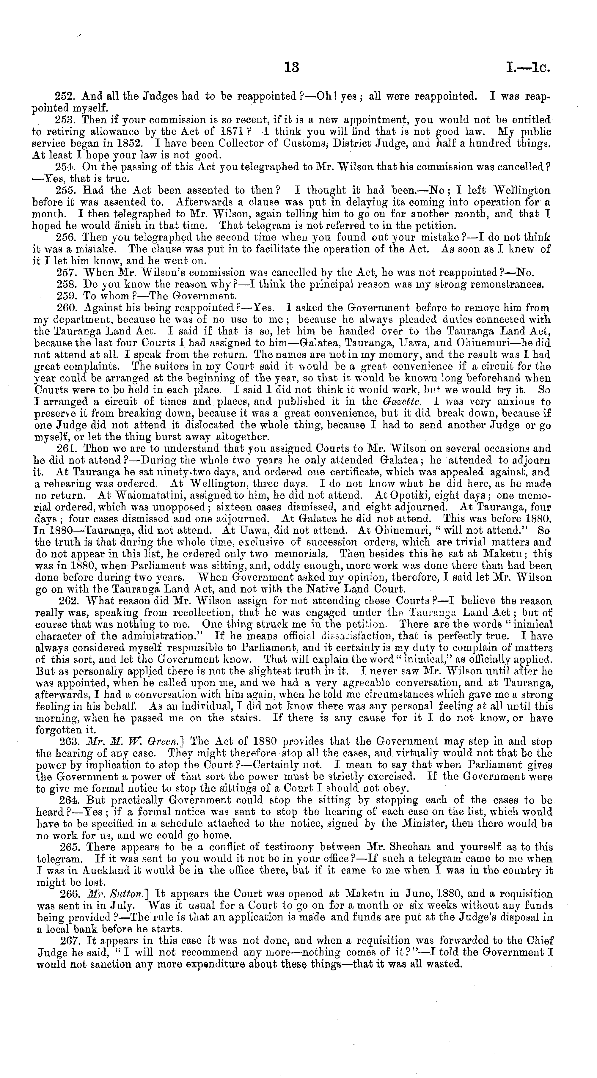 252. And all the Judges had to be reappointed ? —Oh! yes ; all were reappointed. I was reappointed myself. 253. Then if your commission is so recent, if it is a new appointment, you would not be entitled to retiring allowance by the Act of 1871 ? —I think you will find that is not good law. My public service began in 1852. I have been Collector of Customs, District Judge, and half a hundred things. At least I hope your law is not good. 254. On the passing of this Act you telegraphed to Mr. Wilson that his commission was cancelled ? —Tes, that is true. 255. Had the Act been assented to then ? I thought it had been. —No ; I left Wellington before it was assented to. Afterwards a clause was put in delaying its coming into operation for a month. I then telegraphed to Mr. Wilson, again telling him to go on for another month, and that I hoped he would finish in that time. That telegram is not referred to in the petition. 256. Then you telegraphed the second time when you found out your mistake ?—I do not think it was a mistake. The clause was put in to facilitate the operation of the Act. As soon as I knew of it I let him know, and he went on. 257. When Mr. Wilson's commission was cancelled by the Act, he was not reappointed ?—No. 258. Do you know the reason why ? —I think the principal reason was my strong remonstrances. 259. To whom ? —The Government. 260. Against his being reappointed?—Tes. I asked the Government before to remove him from my department, because he was of no use to me ; because he always pleaded duties connected with the Tauranga Land Act. I said if that is so, let him be handed over to the Tauranga Land Act, because the last four Courts I had assigned to him —Galatea, Tauranga, Uawa, and Ohinemuri —he did not attend at all. I speak from the return. The names are not in my memory, and the result was I had great complaints. The suitors in my Court said it would be a great convenience if a circuit for the year could be arranged at the beginning of the year, so that it would be known long beforehand when Courts were to be held in each place. I said I did not think it would work, but we would try it. So I arranged a circuit of times and places, and published it in the Gazette. 1 was very anxious to preserve it from breaking down, because it was a great convenience, but it did break down, because if one Judge did not attend it dislocated the whole thing, because I had to send another Judge or go myself, or let the thing burst away altogether. 261. Then we are to understand that you assigned Courts to Mr. Wilson on several occasions and he did not attend ? —During the whole two years he only attended Galatea; he attended to adjourn it. At Tauranga he sat ninety-two days, and ordered one certificate, which was appealed against, and a rehearing was ordered. At Wellington, three days. Ido not know what he did here, as he made no return. At Waiomatatini, assigned to him, he did not attend. At Opotiki, eight days; one memorial ordered, which was unopposed; sixteen cases dismissed, and eight adjourned. At Tauranga, four days ; four cases dismissed and one adjourned. At Galatea he did not attend. This was before 1880. In 1880—Tauranga, did not attend. At Uawa, did not attend. At Ohinemuri, " will not attend." So the truth is that during the whole time, exclusive of succession orders, which are trivial matters and do not appear in this list, he ordered only two memorials. Then besides this he sat at Maketu ; this was in 1880, when Parliament was sitting, and, oddly enough, more work was done there than had been done before during two years. When Government asked my opinion, therefore, I said let Mr. Wilson go on with the Tauranga Land Act, and not with the Native Land Court. 262. What reason did Mr. Wilson assign for not attending these Courts ?—I believe the reason really was, speaking from recollection, that he was engaged under tho Tauranga Land Act; but of course that was nothing to me. One thing struck me in the petition. There are the words "inimical character of the administration." If he means official dissatisfaction, that is perfectly true. I have always considered myself responsible to Parliament, and it certainly is my duty to complain of matters of this sort, and let the Government know. That will explain the word " inimical," as officially applied. But as personally applied there is not the slightest truth in it. I never saw Mr. Wilson until after he was appointed, when he called upon me, and we had a very agreeable conversation, and at Tauranga, afterwards, I had a conversation with him again, when he told me circumstances which gave me a strong feeling in his behalf. As an individual, I did not know there was any personal feeling at all until this morning, when he passed me on the stairs. If there is any cause for it I do not know, or have forgotten it. 263. Mr. M. W. Green.] The Act of 1880 provides that the Government may step in and stop the hearing of any case. They might therefore stop all the cases, and virtually would not that be the power by implication to stop the Court ? —Certainly not. I mean to say that when Parliament gives the Government a power of that sort the powrer must be strictly exercised. If the Government were to give me formal notice to stop the sittings of a Court I should not obey. 264. But practically Government could stop the sitting by stopping each of the cases to be heard ?■ —Tes ; if a formal notice was sent to stop the hearing of each case on the list, which would have to be specified in a schedule attached to the notice, signed by the Minister, then there would be no work for us, and we could go home. 265. There appears to be a conflict of testimony between Mr. Sheehan and yourself as to this telegram. If it was sent to you would it not be in your office? —If such a telegram came to me when I was in Auckland it would be in the office there, but if it came to me when I was in the country it might be lost.