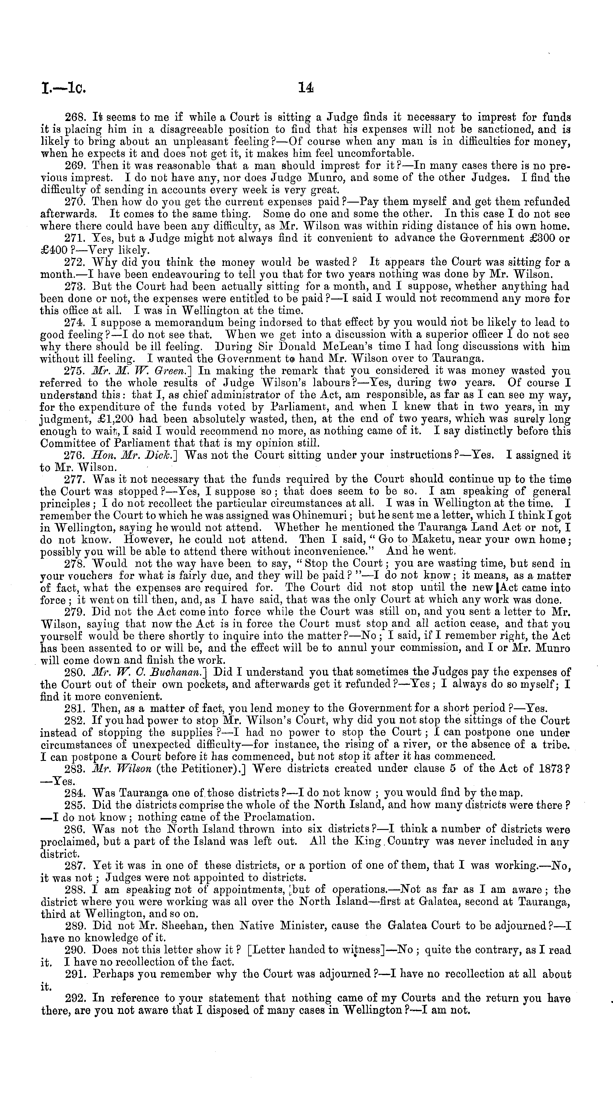 268. It seems to me if while a Court is sitting a Judge finds it necessary to imprest for funds it is placing him in a disagreeable position to find that his expenses will not be sanctioned, and is likely to bring about an unpleasant feeling ? —Of course when any man is in difficulties for money, when he expects it and does not get it, it makes him feel uncomfortable. 269. Then it was reasonable that a man should imprest for it? —In many cases there is no previous imprest. Ido not have any, nor does Judge Munro, and some of the other Judges. I find the difficulty of sending in accounts every week is very great. 270. Then how do you get the current expenses paid ? —Pay them myself and get them refunded afterwards. It comes to the same thing. Some do one and some the other. In this case Ido not see where there could have been any difficulty, as Mr. Wilson was within riding distance of his own home. 271. Tes, but a Judge might not always find it convenient to advance the Government £300 or £400 ?—Very likely. 272. Why did you think the money would be wasted ? It appears the Court was sitting for a month.—l have been endeavouring to tell you that for two years nothing was done by Mr. Wilson. 273. But the Court had been actually sitting for a month, and I suppose, whether anything had been done or not, the expenses were entitled to be paid ?—I said I would not recommend any more for this office at all. I was in Wellington at the time. 274. I suppose a memorandum being indorsed to that effect by you would not be likely to lead to good feeling? —I do not see that. When we get into a discussion with a superior officer Ido not see why there should be ill feeling. During Sir Donald McLean's time I had long discussions with him without ill feeling. I wanted the Government to hand Mr. Wilson over to Tauranga. 275. Mr. M. W. Green.] In making the remark that you considered it was money wasted you referred to the whole results of Judge Wilson's labours? —Tes, during two years. Of course I understand this: that I, as chief administrator of the Act, am responsible, as far as I can see my way, for the expenditure of the funds voted by Parliament, and when I knew that in two years, in my judgment, £1,200 had been absolutely wasted, then, at the end of two years, which was surely long enough to wait, I said I would recommend no more, as nothing came of it. I say distinctly before this Committee of Parliament that that is my opinion still. 276. Hon. Mr. Dick.] Was not the Court sitting under your instructions ? —Tes. I assigned it to Mr. Wilson. 277. Was it not necessary that the funds required by the Court should continue up to the time the Court was stopped ?—Tes, I suppose so; that does seem to be so. I am speaking of general principles ; Ido not recollect the particular circumstances at all. I was in Wellington at the time. I remember the Court to which he was assigned was Ohinemuri; but he sent me a letter, which I think I got in Wellington, saying he would not attend. Whether he mentioned the Tauranga Land Act or not, I do not know. However, he could not attend. Then I said, "Go to Maketu, near your own home; possibly you will be able to attend there without inconvenience." And he went, 278. Would not the way have been to say, " Stop the Court; you are wasting time, but send in your vouchers for what is fairly due, and they will be paid ? " —I do not know ;it means, as a matter of fact, what the expenses are required for. The Court did not stop until the new [Act came into force ; it went on till then, and, as I have said, that was the only Court at which any work was done. 279. Did not the Act come into force while the Court was still on, and you sent a letter to Mr. Wilson, saying that now the Act is in force the Court must stop and all action cease, and that you yourself would be there shortly to inquire into the matter? —No ; I said, if I remember right, the Act has been assented to or will be, and the effect will be to annul your commission, and I or Mr. Munro will come down and finish the work. 280. Mr. W. C. Buchanan.] Did I understand you that sometimes the Judges pay the expenses of the Court out of their own pockets, and afterwards get it refunded?—Tes ; I always do so myself; I find it more convenient. 281. Then, as a matter of fact, you lend money to the Government for a short period ?—Tes. 282. If you had power to stop Mr. Wilson's Court, why did you not stop the sittings of the Court instead of stopping the supplies ?—I had no power to stop the Court; I can postpone one under circumstances of unexpected difficulty —for instance, the rising of a river, or the absence of a tribe. I can postpone a Court before it has commenced, but not stop it after it has commenced. 283. Mr. Wilson (the Petitioner).] Were districts created under clause 5 of the Act of 1873? —Tes. 284. Was Tauranga one of those districts ?—I do not know ; you would find by the map. 285. Did the districts comprise the whole of the North Island, and how many districts were there ? —I do not know; nothing came of the Proclamation. 286. Was not the North Island thrown into six districts ? —I think a number of districts were proclaimed, but a part of the Island was left out. All the King.Country was never included in any district. 287. Tet it was in one of those districts, or a portion of one of them, that I was working.—No, it was not ; Judges were not appointed to districts. 288. I am speaking not of appointments, jbut of operations.—Not as far as I am aware ; the district where you were working was all over the North Island —first at Galatea, second at Tauranga, third at Wellington, and so on. 289. Did not Mr. Sheehan, then Native Minister, cause the Galatea Court to be adjourned?—l have no knowledge of it. 290. Does not this letter show it ? [Letter handed to witness] —No ; quite the contrary, as I read it. I have no recollection of the fact. 291. Perhaps you remember why 