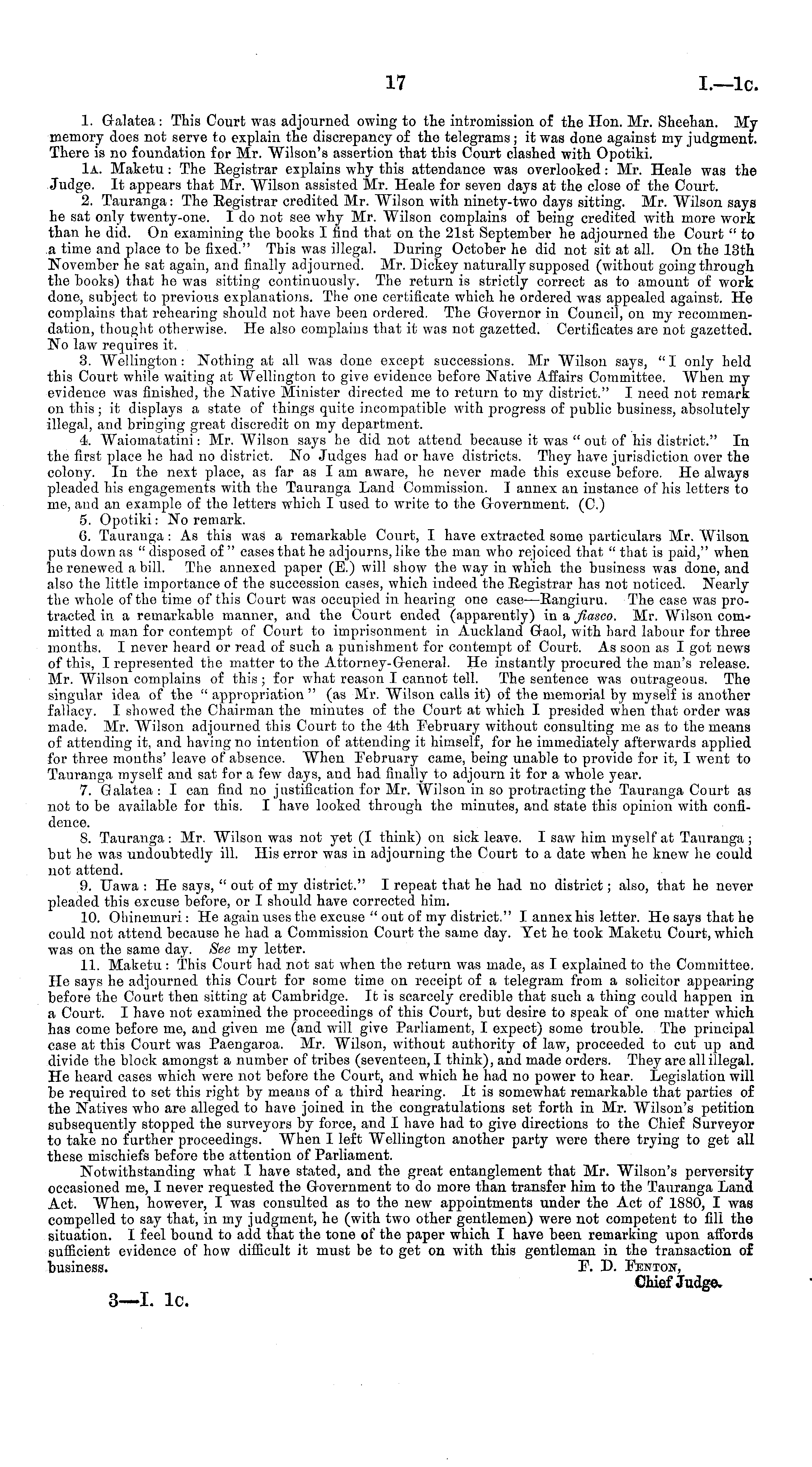 1. Galatea: This Court was adjourned owing to the intromission of the Hon. Mr. Sheehan. My memory does not serve to explain the discrepancy of the telegrams ; it was done against my judgment. There is no foundation for Mr. Wilson's assertion that this Court clashed with Opotiki. la. Maketu : The Eegistrar explains why this attendance was overlooked : Mr. Heale was the Judge. It appears that Mr. Wilson assisted Mr. Heale for seven days at the close of the Court. 2. Tauranga: The Eegistrar credited Mr. Wilson with ninety-two days sitting. Mr. Wilson says he sat only twenty-one. Ido not see why Mr. Wilson complains of being credited with more work than he did. On examining the books I find that on the 21st September he adjourned the Court "to a time and place to be fixed." This was illegal. During October he did not sit at all. On the 13th November he sat again, and finally adjourned. Mr. Dickey naturally supposed (without going through the books) that he was sitting continuously. The return is strictly correct as to amount of work done, subject to previous explanations. The one certificate which he ordered was appealed against. He complains that rehearing should not have been ordered. The Governor in Council, on my recommendation, thought otherwise. He also complains that it was not gazetted. Certificates are not gazetted. No law requires it. 3. Wellington: Nothing at all was done except successions. Mr Wilson says, " I only held this Court while waiting at Wellington to give evidence before Native Affairs Committee. When my evidence was finished, the Native Minister directed me to return to my district." I need not remark on this ; it displays a state of things quite incompatible with progress of public business, absolutely illegal, and bringing great discredit on my department. 4. Waiomatatini: Mr. Wilson says he did not attend because it was " out of his district." In the first place he had no district. No Judges had or have districts. They have jurisdiction over the colony. In the next place, as far as lam aware, he never made this excuse before. He always pleaded his engagements with the Tauranga Land Commission. I annex an instance of his letters to me, and an example of the letters which I used to write to the Government. (C.) 5. Opotiki: No remark. 6. Tauranga: As this was a remarkable Court, I have extracted some particulars Mr. Wilson puts down as " disposed of " cases that he adjourns, like the man who rejoiced that " that is paid," when he renewed a bill. The annexed paper (E.) will show the way in which the business was done, and also the little importance of the succession cases, which indeed the Eegistrar has not noticed. Nearly the whole of the time of this Court was occupied in hearing one case—Eangiuru. The case was protracted in a remarkable manner, and the Court ended (apparently) in a fiasco. Mr. Wilson com--mitted a man for contempt of Court to imprisonment in Auckland Gaol, with hard labour for three months. I never heard or read of such a punishment for contempt of Court. As soon as I got news of this, I represented the matter to the Attorney-General. He instantly procured the man's release. Mr. Wilson complains of this; for what reason I cannot tell. The sentence was outrageous. The singular idea of the " appropriation " (as Mr. Wilson calls it) of the memorial by myself is another fallacy. I showed the Chairman the minutes of the Court at which I presided when that order was made. Mr. Wilson adjourned this Court to the 4th February without consulting me as to the means of attending it, and having no intention of attending it himself, for he immediately afterwards applied for three months' leave of absence. When February came, being unable to provide for it, I went to Tauranga myself and sat for a few days, and had finally to adjourn it for a whole year. 7. Galatea : I can find no justification for Mr. Wilson in so protracting the Tauranga Court as not to be available for this. I have looked through the minutes, and state this opinion with confidence. 8. Tauranga : Mr. Wilson was not yet (I think) on sick leave. I saw him myself at Tauranga ; but he was undoubtedly ill. His error was in adjourning the Court to a date when he knew he could not attend. 9. Uawa :He says, " out of my district." I repeat that he had no district; also, that he never rileaded this excuse before, or I should have corrected him. 10. Ohinemuri: He again uses the excuse " out of my district." I annex his letter. Hesaysthathe could not attend because he had a Commission Court the same day. Tet he took Maketu Court, which was on the same day. Sec my letter. 11. Maketu : This Court had not sat when the return was made, as I explained to the Committee. He says he adjourned this Court for some time on receipt of a telegram from a solicitor appearing before the Court then sitting at Cambridge. It is scarcely credible that such a thing could happen in a Court. I have not examined the proceedings of this Court, but desire to speak of one matter which has come before me, and given me (and will give Parliament, I expect) some trouble. The principal case at this Court was Paengaroa. Mr. Wilson, without authority of law, proceeded to cut up and divide the block amongst a number of tribes (seventeen, I think), and made orders. They are all illegal. He heard cases which were not before the Court, and which he had no power to hear. Legislation will be required to set this right by means of a third hearing. It is somewhat remarkable that parties of the Natives who are alleged to have joined in the congratulations set forth in Mr. Wilson's petition subsequently stopped the surveyors by force, and I have had to give directions to the Chief Surveyor to take no further proceedings. When I left Wellington another party were there trying to get all these mischiefs before the attention of Parliament. Notwithstanding what I have stated, and the great entanglement that Mr. Wilson's perversity occasioned me, I never
