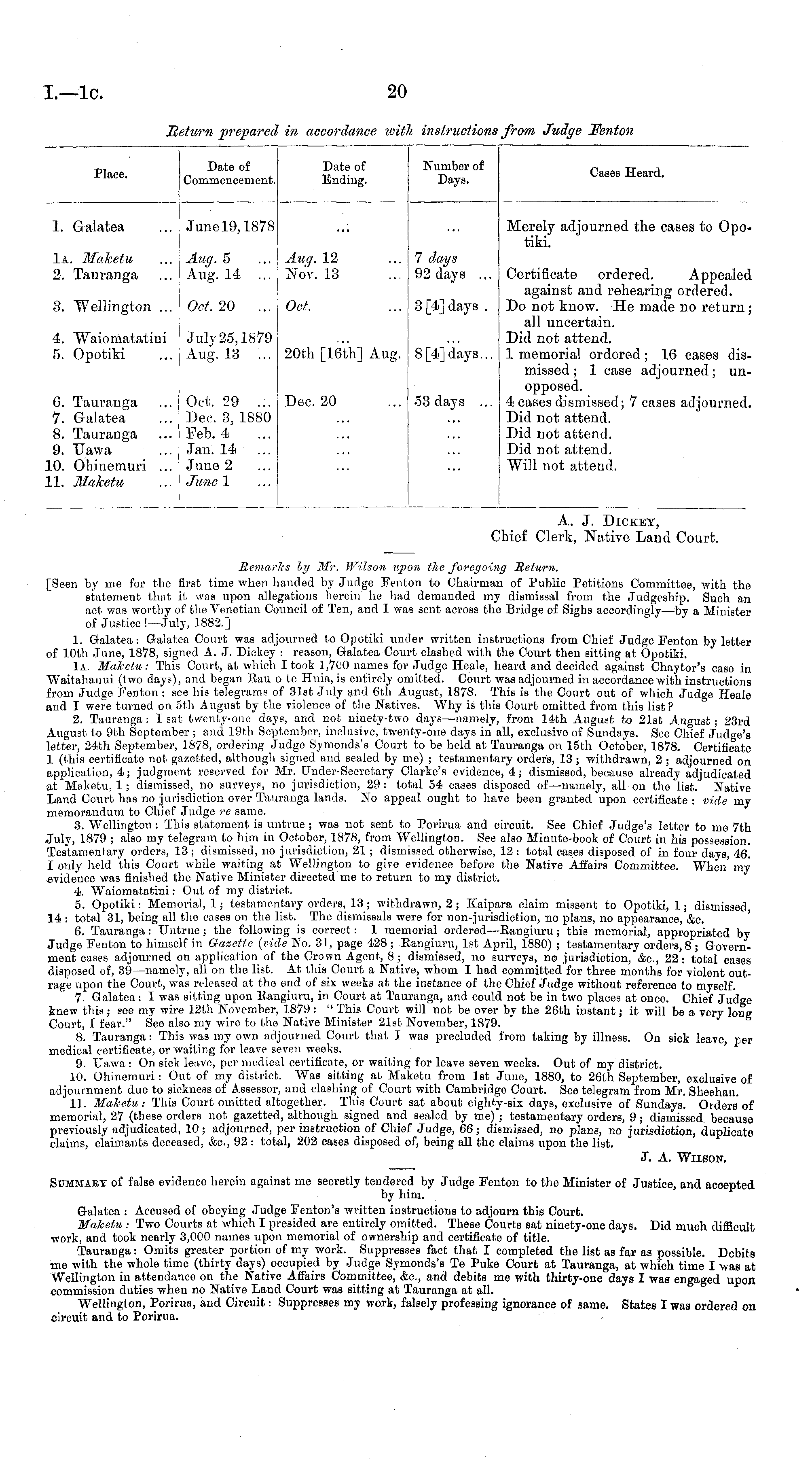 Remarks by Mr. Wilson upon the foregoing Return. [Seen by me for the first time when handed by Judge Fenton to Chairman of Public Petitions Committee, with the statement that it was upon allegations herein he had demanded my dismissal from the Judgeship. Such an act was worthy of the Venetian Council of Ten, and I was sent across the Bridge of Sighs accordingly—by a Minister of Justice !—July, 1882.] 1. Galatea: Galatea Court was adjourned to Opotiki under written instructions from Chief Judge Fenton by letter of 10th June, 1878, signed A. J. Dickey : reason, Galatea Court clashed with the Court then sitting at Opotiki. la. Maketu: This Court, at which I took 1,700 names for Judge Heale, heard and decided against Chaytor's case in Waitahanui (two days), and began Rau ote Huia, is entirely omitted. Court was adjourned in accordance with instructions from Judge Fenton : see his telegrams of 31st July and 6th August, 1878. This is the Court out of which Judge Heale and I were turned on sth August by the violence of the Natives. Why is this Court omitted from this list? 2. Tauranga: I sat twenty-one days, and not ninety-two days —namely, from 14th August to 21st August; 23rd August to 9th September; and 19th September, inclusive, twenty-one days in all, exclusive of Sundays. See Chief Judge's letter, 24th September, 1878, ordering Judge Symonds's Court to be held at Tauranga on 15th October, 1878. Certificate 1 (this certificate not gazetted, although signed and sealed by me) ; testamentary orders, 13 ; withdrawn, 2 ; adjourned on application, 4; judgment reserved for Mr. Under-Secretary Clarke's evidence, 4; dismissed, because already adjudicated at Maketu, 1 j dismissed, no surveys, no jurisdiction, 29 : total 54 cases disposed of —namely, all on the list. Native Land Court has no jurisdiction over Tauranga lands. No appeal ought to have been granted upon certificate : vide my memorandum to Chief Judge re same. 3. Wellington : This statement is untrue ; was not sent to Porirua and circuit. See Chief Judge's letter to me 7th July, 1879 ; also my telegram to him in October, 1878, from Wellington. See also Minute-book of Court in his possession. Testamenlary orders, 13 ; dismissed, no jurisdiction, 21 ; dismissed otherwise, 12 : total cases disposed of in four days, 46. I only held this Court while waiting at Wellington to give evidence before the Native Affairs Committee. When my evidence was finished the Native Minister directed me to return to my district. 4. Waiomatatini: Out of my district. 5. Opotiki: Memorial, 1; testamentary orders, 13; withdrawn, 2; Kaipara claim missent to Opotiki, 1; dismissed 14 : total 31, being all the cases on the list. The dismissals were for non-jurisdiction, no plans, no appearance, &c. 6. Tauranga: Untrue; the following is correct: 1 memorial ordered—Eangiuru; this memorial, appropriated by Judge Fenton to himself in Gazette (vide No. 31, page 428 ; Eangiuru, Ist April, 1880) ; testamentary orders, 8 ; Government cases adjourned on application of the Crown Agent, 8; dismissed, no surveys, no jurisdiction, <__~ 22: total cases disposed of, 39 —namely, all on the list. At this Court a Native, whom I had committed for three months for violent outrage upon the Court, was released at the end of six weeks at the instance of the Chief Judge without reference to myself. 7. Galatea: I was sitting upon Eangiuru, in Court at Tauranga, and eould not be in two places at once. Chief Judge knew this; see my wire 12th November, 1879 : " This Court will not be over by the 26th instant; it will be a very long Court, I fear." See also my wire to the Native Minister 21st November, 1879. 8. Tauranga: This was my own adjourned Court that I was precluded from taking by illness. On sick leave, per medical certificate, or waiting for leave seven weeks. 9. Uawa: On sick leave, per medical certificate, or waiting for leave seven weeks. Out of my district. 10. Ohinemuri: Out of my district. Was sitting at Maketu from Ist June, 1880, to 26th September, exclusive of adjournment due to sickness of Assessor, and clashing of Court with Cambridge Court. See telegram from Mr. Sheehan. 11. Maketu .- This Court omitted altogether. This Court sat about eighty-six days, exclusive of Sundays. Orders of memorial, 27 (these orders not gazetted, although signed and sealed by me) ; testamentary orders, 9; dismissed because previously adjudicated, 10; adjourned, per instruction of Chief Judge, 66; dismissed, no plans, no jurisdiction, duplicate claims, claimants deceased, &c, 92 -. total, 202 cases disposed of, being all the claims upon the list. J. A. Wilson.