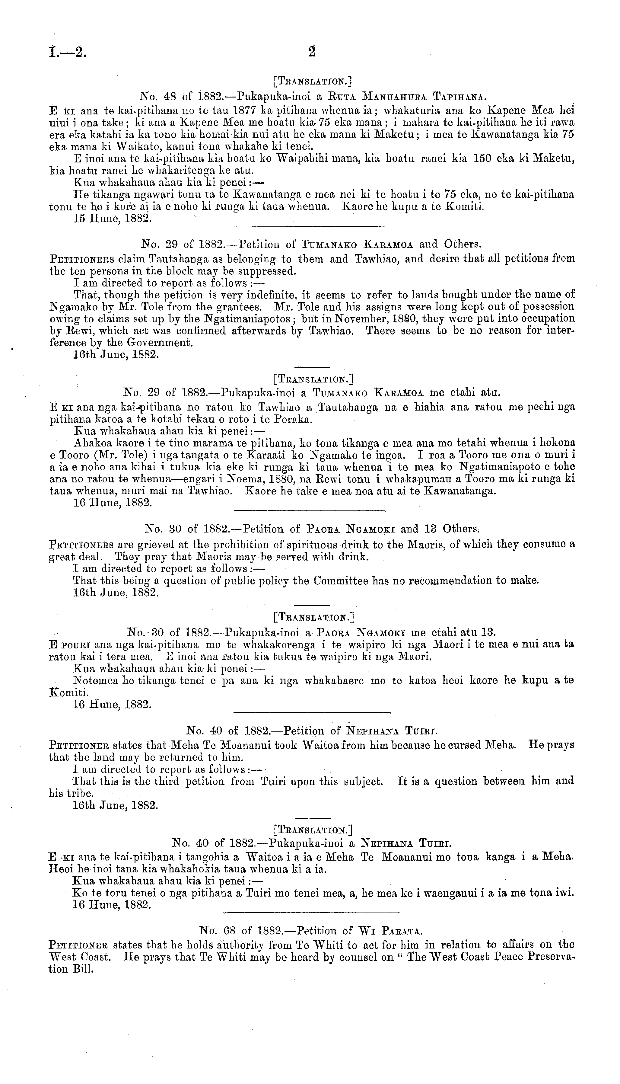 [Translation.] No. 30 of 1882.—Pukapuka-inoi a Paora Ngamoki me etahi atu 13. E Potjei ana nga kai-pitihana mo te whakakorenga i te waipiro ki nga Maori i te mea c nui ana ta ratou kai i tera mea. E inoi ana ratou kia tukua te waipiro ki nga Maori. Kua whakahaua ahau kia ki penei:— Notemea he tikanga tenei c pa ana ki nga whakahaere mo te katoa heoi kaore he kupu a te Komiti. 16 Hune, 1882.