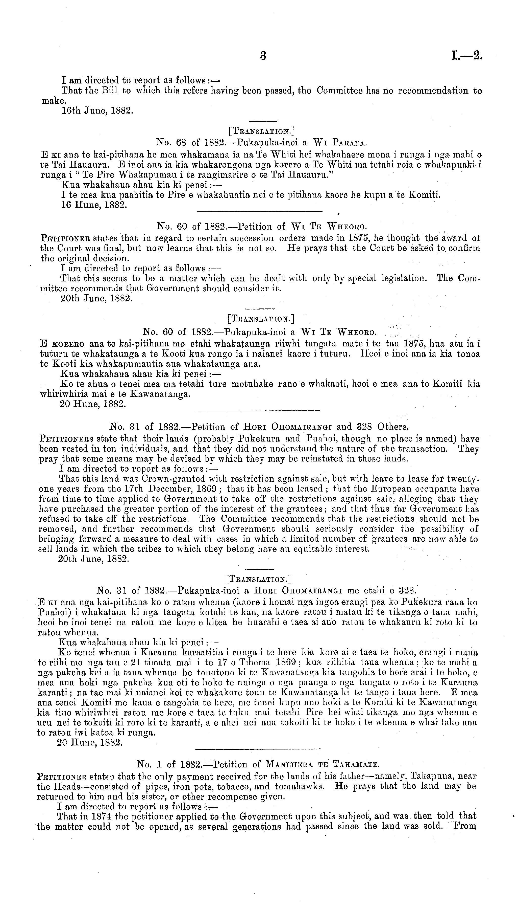 [Translation.] No. 68 of 1882.—Pukapuka-inoi a Wi Parata. E EI ana te kai-pitihana he mea whakamana ia na Te Whiti hei whakahaere mona i runga i nga mahi o te Tai Hauauru. E inoi ana ia kia whakarongona nga korero aTe Whiti ma tetahi roia c whakapuaki i runga i " Te Pire Whakapuinau i te rangimarire o te Tai Hauauru." Kua whakahaua ahau kia ki penei:—■ I te mea kua paahitia te Pire c whakahuatia nei c te pitihana kaore he kupu a te Komiti. 16 Hune, 1882,