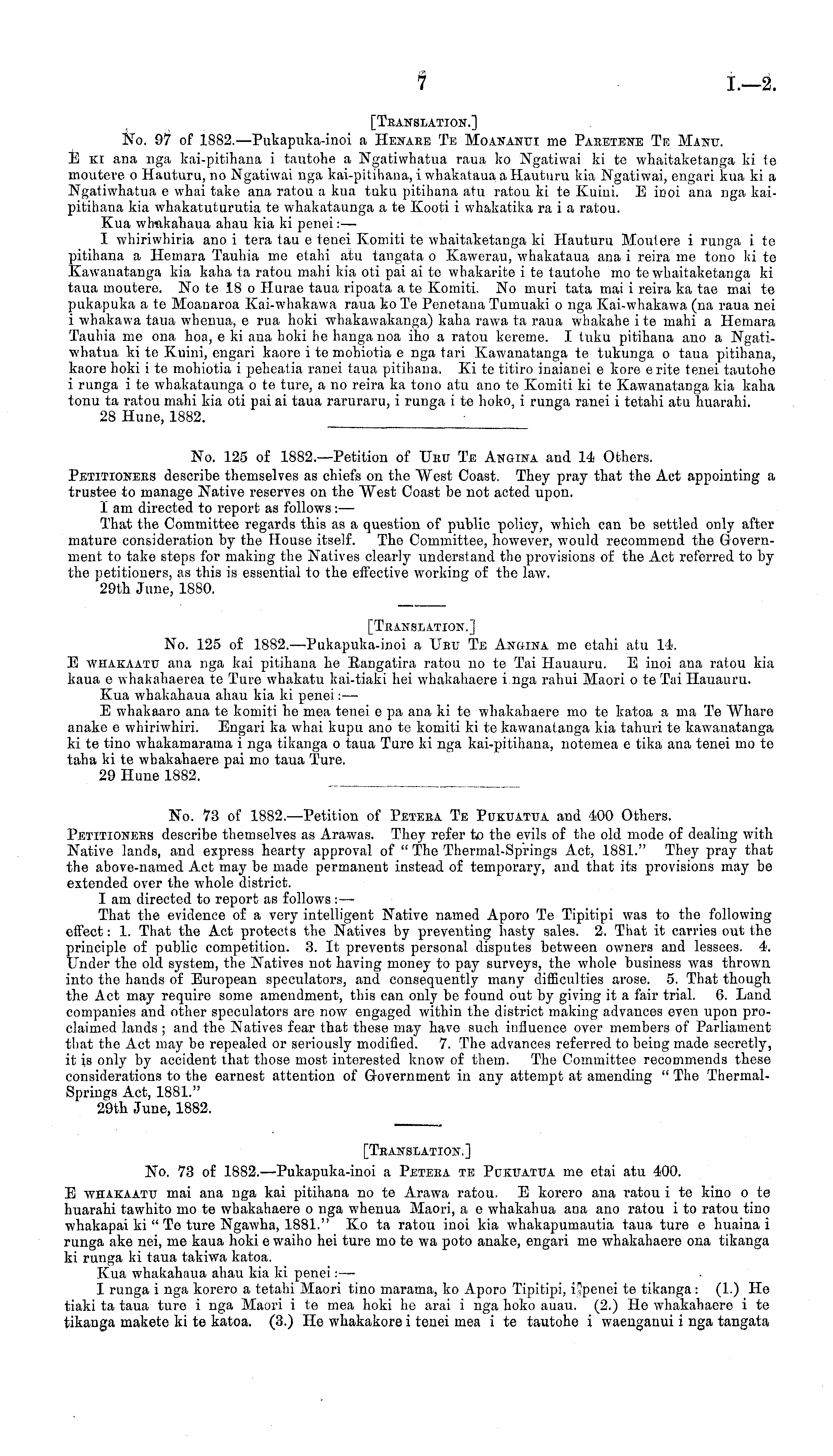 [Translation.] No, 97 of 1882. —Pukapuka-inoi a Henare Te Moananui me Paretene Te Manu. E ki ana nga kai-pitihana i tautohe a Ngatiwhatua raua ko Ngatiwai kite whaitaketanga ki ie moutere o Hauturu, no Ngatiwai nga kai-pitihana, i whakataua a Hauturu kia Ngatiwai, engari kua ki a Ngatiwhatua c whai take ana ratou a kua tuku pitihana atu ratou kite Kuini. E inoi ana nga kaipitihana kia whakatuturutia te whakataunga a te Kooti i whakatika ra i a ratou. Kua whakahaua ahau kia ki penei:— I whiriwhiria ano i tera tau c tenei Komiti te whaitaketanga ki Hauturu Moutere i runga i te pitihana a Hemara Tauhia me etahi atu tangata o Kawerau, whakataua ana i reira me tono kite Kawanatanga kia kaha ta ratou mahi kia oti pai ai to whakarite i te tautohe mo te whaitaketanga ki taua moutere. No te 18 o Hurae taua ripoata ate Komiti. No muri tata mai i reira ka tae mai te pukapuka a te Moanaroa Kai-whakawa raua ko Te Penetana Tumuaki o nga Kai-whakawa (na raua nei i whakawa taua whenua, c rua hoki whakawakanga) kaha rawa ta raua whakahe ite mahi a Hemara Tauhia me ona hoa, eki ana hoki he hanga noa iho a ratou kereme. I tuku pitihana ano a Ngatiwhatua kite Kuini, engari kaore i te mohiotia c nga tari Kawanatanga te tukunga o taua pitihana, kaore hoki ite mohiotia i peheatia ranei taua pitihana. Xi te titiro inaianei c kore c rite tenei tautohe i runga i te whakataunga o te ture, a no reira ka tono atu ano te Komiti kite Kawanatanga kia kaha tonu ta ratou mahi kia oti pai ai taua raruraru, i runga i te hoko, i runga ranei i tetahi atu huarahi. 28 Hune, 1882.