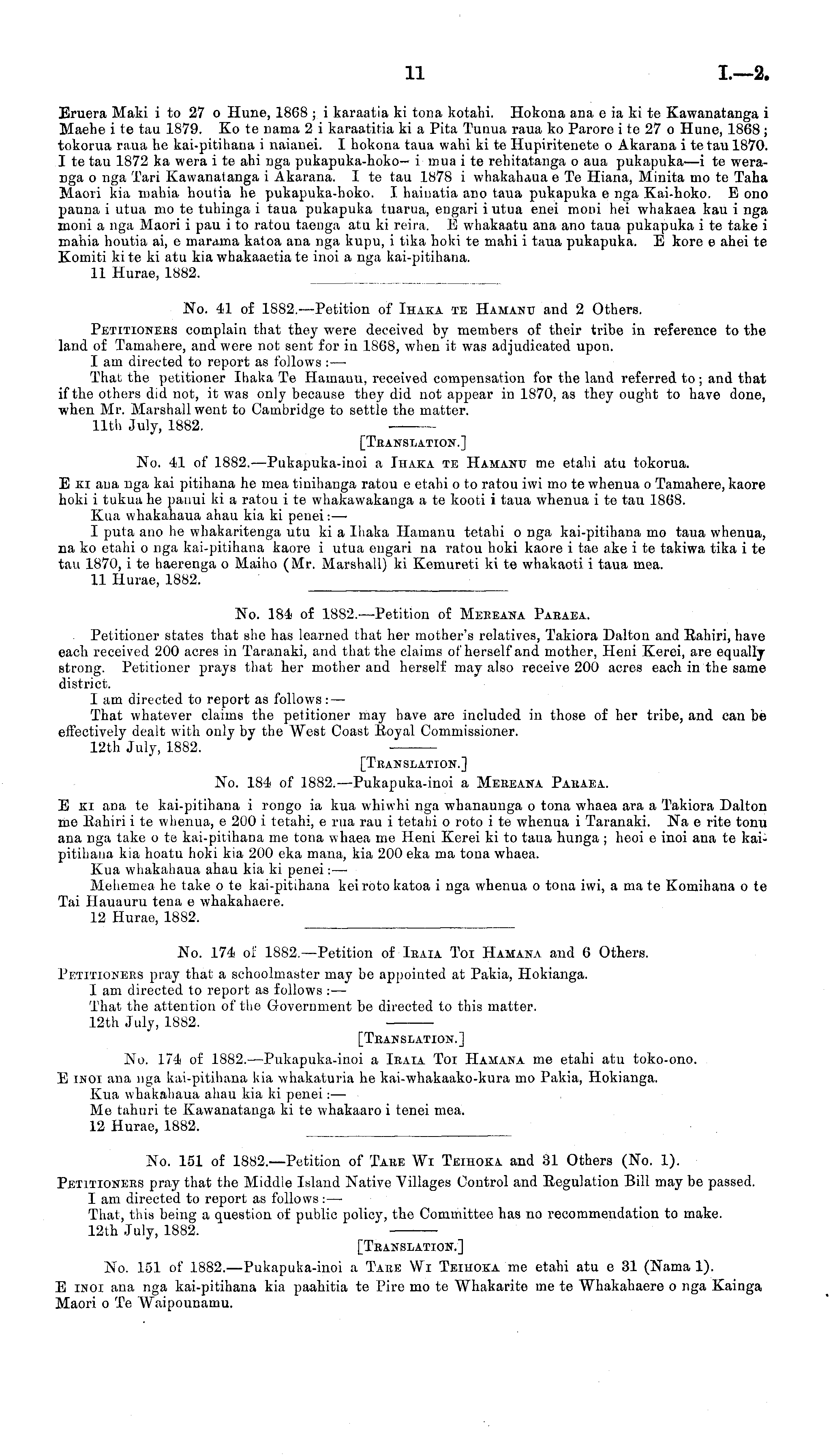 11th July, 1882. ■ [Translation.] No. 41 of 1882.—Pukapuka-inoi a Ihaka te Hamanu me etahi atu tokorua. E ci aua nga kai pitihana he mea tinihanga ratou c etahi o to ratou iwi mo te whenua o Tamahere, kaore hoki i tukua he pauui ki a ratou i te whakawakanga a te kooti i taua whenua i te tau 1868. Kua whakahaua ahau kia ki penei:— I puta ano he whakaritenga utu ki a Ihaka Hamanu tetahi o nga kai-pitihana mo taua whenua, na ko etahi o nga kai-pitihana kaore i utua engari na ratou hoki kaore i tae ake i te takiwa tika i te tau 1870, i te haerenga o Maiho (Mr. Marshall) ki Kemureti kite whakaoti i taua mea. II Hurae, 1882.