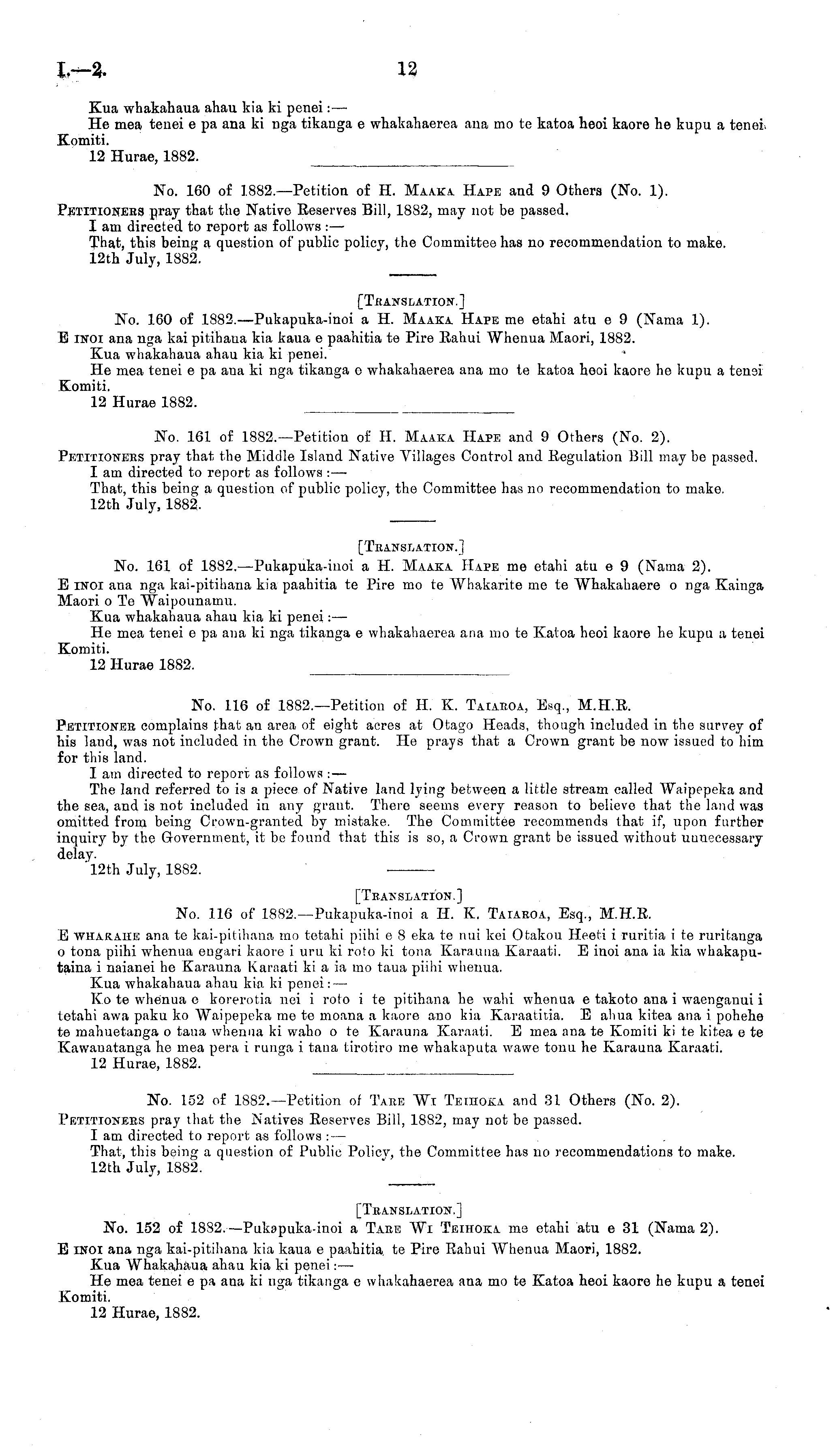 [Translation.] No. 161 of 1882. —Pukapuka-inoi a H. Maaka Hape me etahi atu c 9 (Nama 2). E inoi ana nga kai-pitihana kia paahitia te Pire mo te Whakarite me te Whakahaere o nga Kainga Maori o Te Waipounamu. Kua whakahaua ahau kia ki penei:— He mea tenei c pa ana ki nga tikanga c whakahaerea ana mo te Katoa heoi kaore he kupu a tenei Komiti. 12 Hurae 1882.