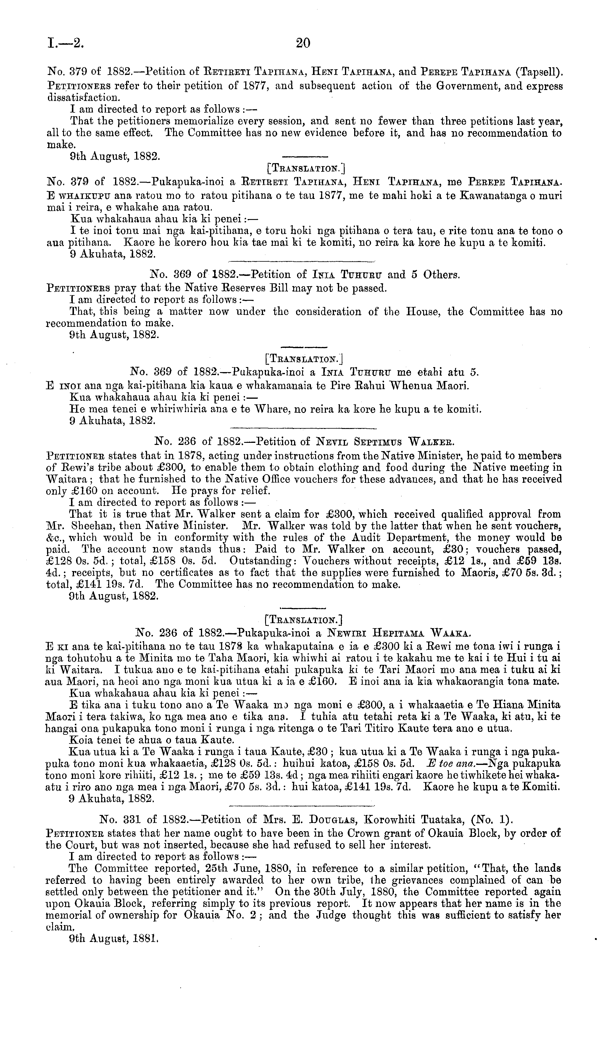 [Teanslation.] No. 236 of 1882.—Pukapuka-inoi a Newiei Hepitama Waaka. E ci ana te kai-pitihana no te tau 1878 ka whakaputaina c ia c £300 ki a Rewi me tona iwi i runga i nga tohutohu a te Minita mo te Taha Maori, kia whiwhi ai ratou i te kakahu me te kai i te Hui i tv ai ki Waitara. I tukua ano etc kai-pitihana etahi pukapuka kite Tari Maori mo ana mea i tuku ai ki aua Maori, na heoi ano nga moni kua utua ki aia c £160. E inoi ana ia kia whakaorangia tona mate. Kua whakahaua ahau kia ki penei : — E tika ana i tuku tono ano a Te Waaka mi nga moni c £300, a i whakaaetia c Te Hiana Minita Maori i tera takiwa, ko nga mea ano c tika ana. I tuhia atu tetahi reta ki aTe Waaka, ki atu, kite hangai ona pukapuka tono moni i runga i nga ritenga o te Tari Titiro Kaute tera ano c utua. Koia tenei te ahua o taua Kaute. Kua utua ki a Te Waaka i runga i taua Kaute, £30 ; kua utua ki a Te Waaka i runga i nga pukapuka tono moni kua whakaaetia, £128 os. 5d.: huihui katoa, £158 os. sd. E toe ana. —Nga pukapuka tono moni kore rihiiti, £12 Is. ; me te £59 13s. 4d ; nga mea rihiiti engari kaore he tiwhikete hei whakaatu i riro ano nga mea i nga Maori, £70 ss. 3d.: hui katoa, £141 19s. 7d. Kaore he kupu ate Komiti. 9 Akuhata, 1882.