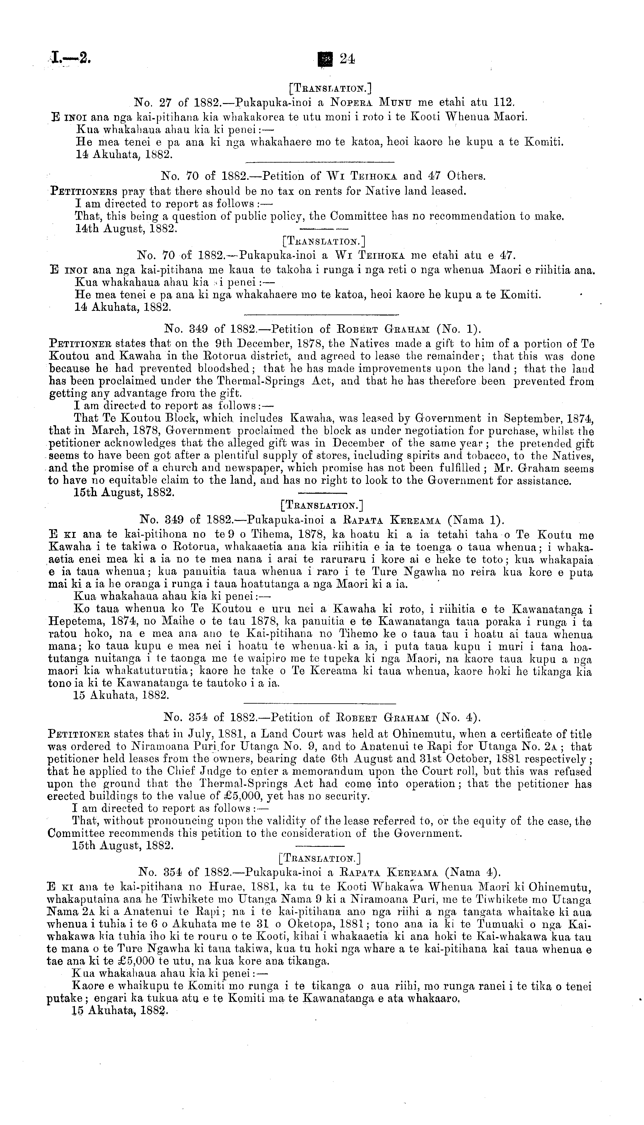 [Translation.] No. 354 of 1882. —Pukapuka-inoi a Rapata Kereama (Nama 4). E ki ana te kai-pitihana no Hurae, 1881, ka tv te Kooti Whakawa Whenua Maori ki Ohinemutu, whakaputaina ana he Tiwhikete mo Utanga Nama 9 ki a Niramoana Puri, me te Tiwhikete mo Utanga Nama 2a ki a Anatenui te Rapi; na i te kai-pitihana ano nga riihi a nga tangata whaitake ki aua whenua i tuhia ite 6 o Akuhata me to 31 o Oketopa, 1881; tono ana ia kite Tumuaki o nga Kaiwhakawa kia tuhia iho kite rouru o te Kooti, kihai i whakaaetia ki ana hoki te Kai-whakawa kua tau te mana o te Ture Ngawha ki taua takiwa, kua tv hoki nga whare a te kai-pitihana kai taua whenua c tae ana kite £5,000 te utu, na kua kore ana tikanga, Kua whakahaua ahau kia ki penei: — Kaore c whaikupu te Komiti mo runga i te tikanga o aua riihi, mo runga ranei i te tika o tenei putake ; engari ka tukua atu c te Komiti ma te Kawanatanga c ata whakaaro. 15 Akuhata, 1882.