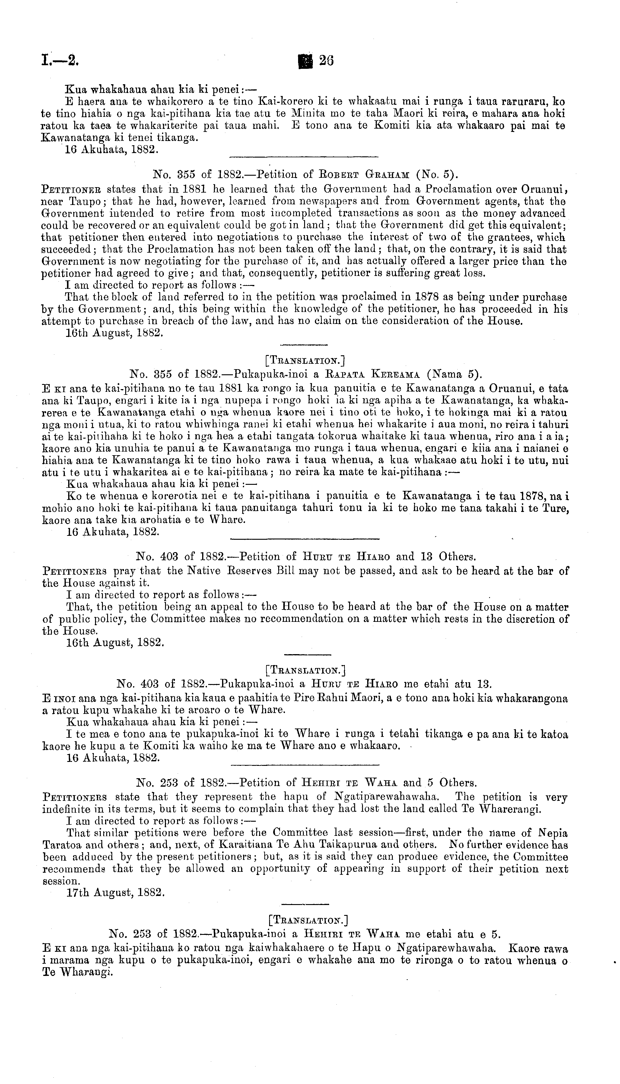 [Translation.] No. 355 of 1882. —Pukapuka-inoi a Rapata Kereama (Nama 5). E ki ana te kai-pitihana no te tau 1881 ka rongo ia kua panuitia c te Kawanatanga a Oruanui, c tata ana ki Taupo, engari i kite ia i nga nupepa i rongo hoki ia ki nga apiha a te Kawanatanga, ka whakarerea c te Kawanatanga etahi o nga whenua kaore nei i tino oti te hoko, i te hokinga mai ki a ratou nga moni i utua, ki to ratou whiwhinga ranei ki etahi whenua hei whakarite i aua moni, no reira i tahuri ai te kai-piiihaha kite hoko i nga hea a etahi tangata tokorua whaitake ki taua whenua, riro ana i a ia; kaore ano kia unuhia te panui a te Kawanatanga mo runga i taua whenua, engari c kiia ana i naianei c hiahia ana te Kawanatanga kite tino hoko rawa i taua whenua, a kua whakaae atu hoki i te utu, nui atu i te utu i whakaritea ai c te kai-pitihana ; no reira ka mate te kai-pitihana : — Kua whakahaua ahau kia ki penei:— Ko te whenua c korerotia nei c te kai-pitihana i panuitia c te Kawanatanga i te tau 1878, na i mohio ano hoki te kai-pitihana ki taua panuitanga tahuri tonu ia kite hoko me tana takahi i te Ture, kaore ana take kia arohatia c te Whare. 16 Akuhata, 1882.