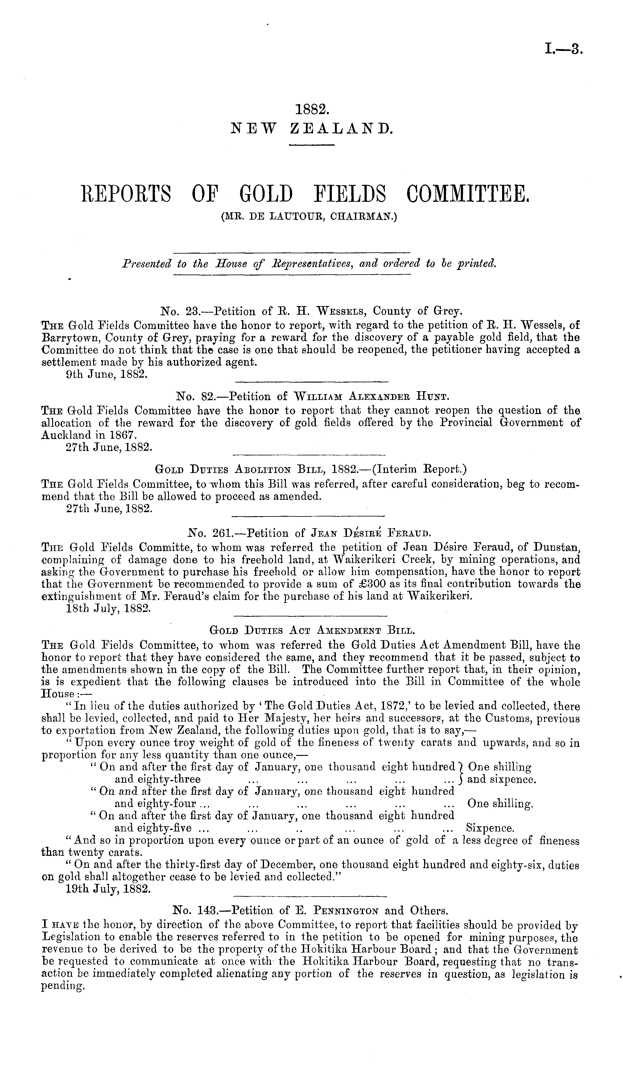 No. 82.—Petition of "William Alexandee Hunt. The Gold Fields Committee have the honor to report that they cannot reopen the question of the allocation of the reward for the discovery of gold fields offered by the Provincial Government of Auckland in 1867. 27th June, 1882.
