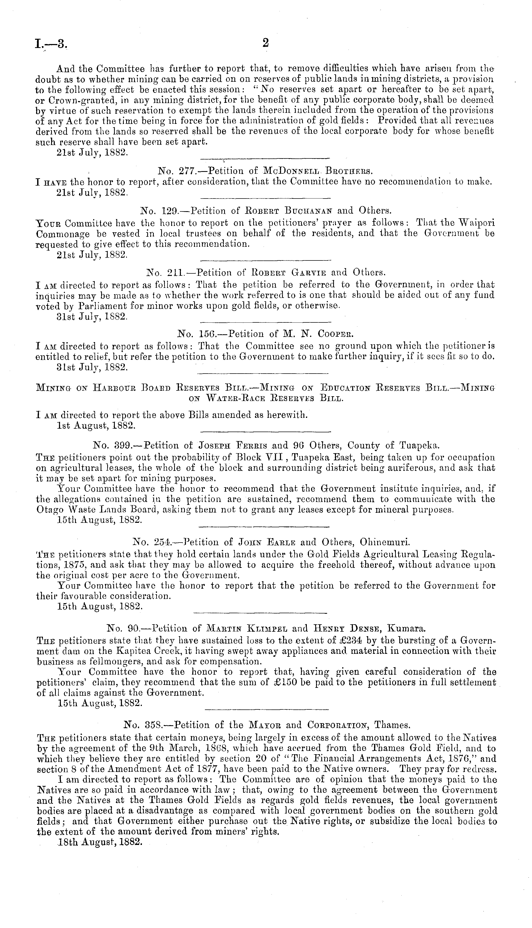 Mmm& on Harbour Board Eesertes Bill.—Mining on Education Eesertes Bill.—Minings on Water-Race Eesebves Bill. I am directed to report the above Bills amended as herewith. Ist August, 1882.