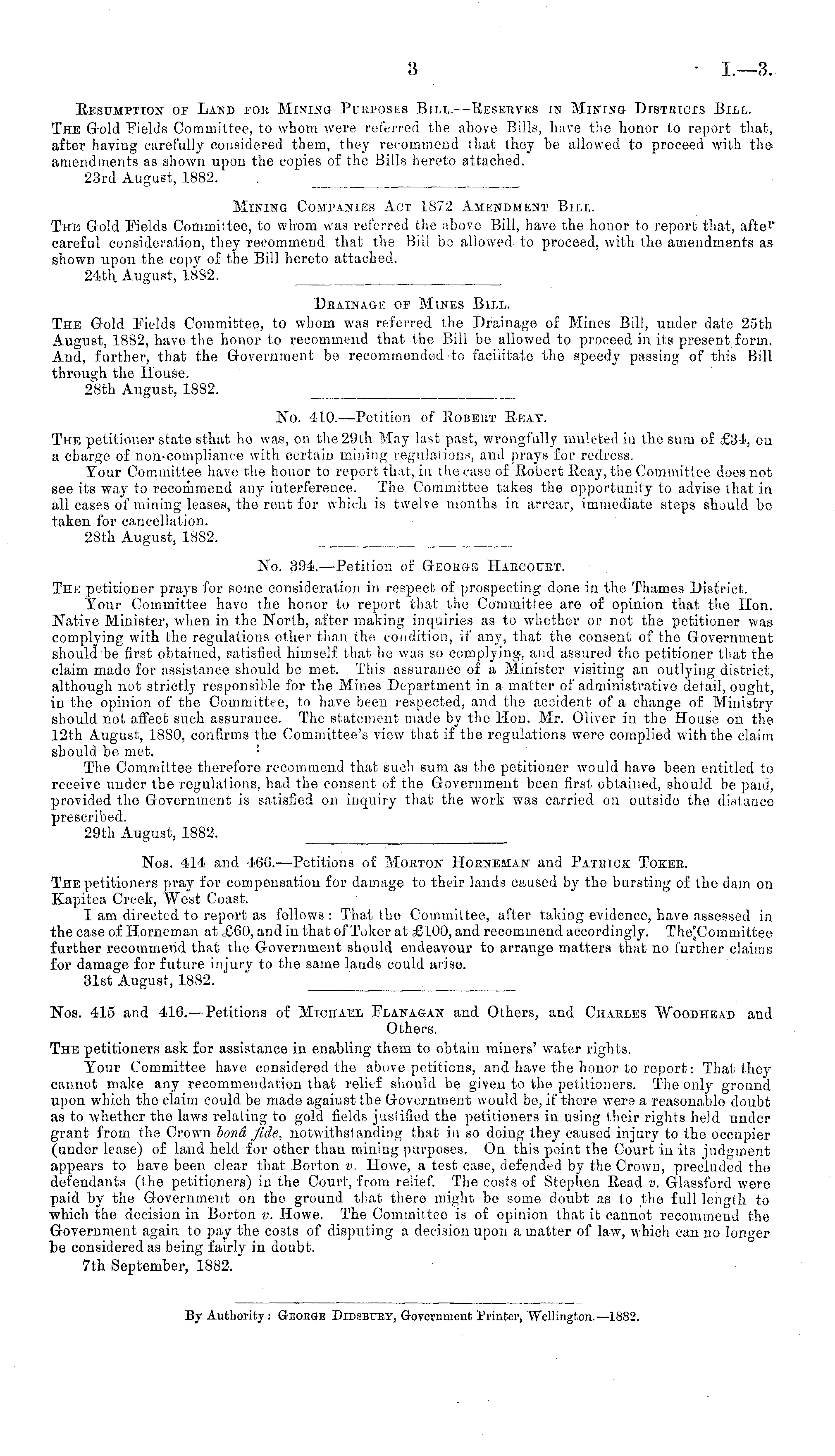Noa. 415 and 416.—Petitions of Michael Flanagan and Others, and Charles Woodiiead and Others. The petitioners ask for assistance in enabling them to obtain miners' water rights. Your Committee have considered the above petitions, and have the honor to report: That they cannot make any recommendation that relief should be given to the petitioners. The only ground upon which the claim could be made agaiust the Government would bo, if there were a reasonable doubt as to whether the laws relating to gold fields justified the petitioners in using their rights held under grant from the Crown bond fide, notwithstanding that in so doing they caused injury to the occupier (under lease) of land held for other than mining purposes. On this point the Court in its judgment appears to have been clear that Borton v. Howe, a test case, defended by the Crown, precluded tho defendants (the petitioners) in the Court, from relief. The costs of Stephen Read v. Glassford were paid by the Government on the ground that there might be some doubt as to the full length to which the decision in Borton v. Howe. The Committee is of opinion that it cannot recommend the Government again to pay the costs of disputing a decision upon a matter of law, which can no longer be considered as being fairly in doubt. 7th September, 1882.
