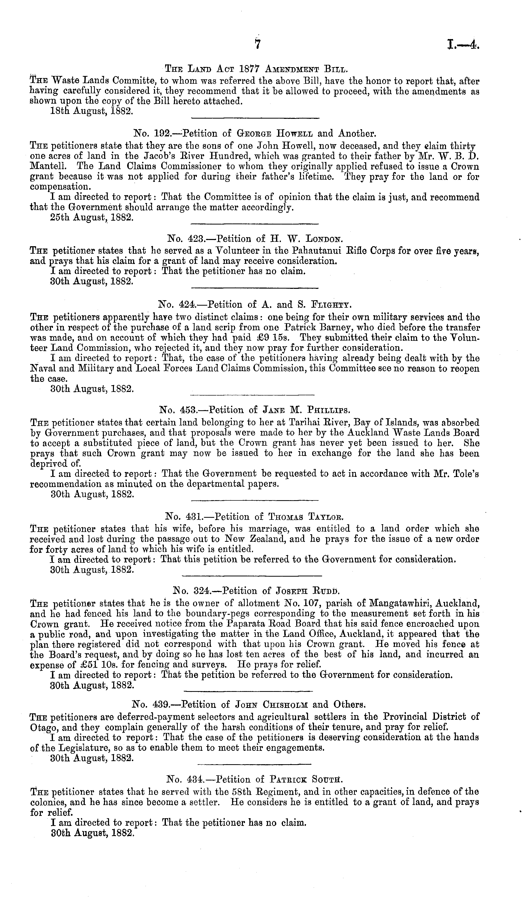 No. 423.—Petition of H. W. London. The petitioner states that he served as a Volunteer in the Pahautanui Rifle Corps for over five years, and prays that his claim for a grant of land may receive consideration. lam directed to report: That the petitioner has no claim. 30th August, 1882.