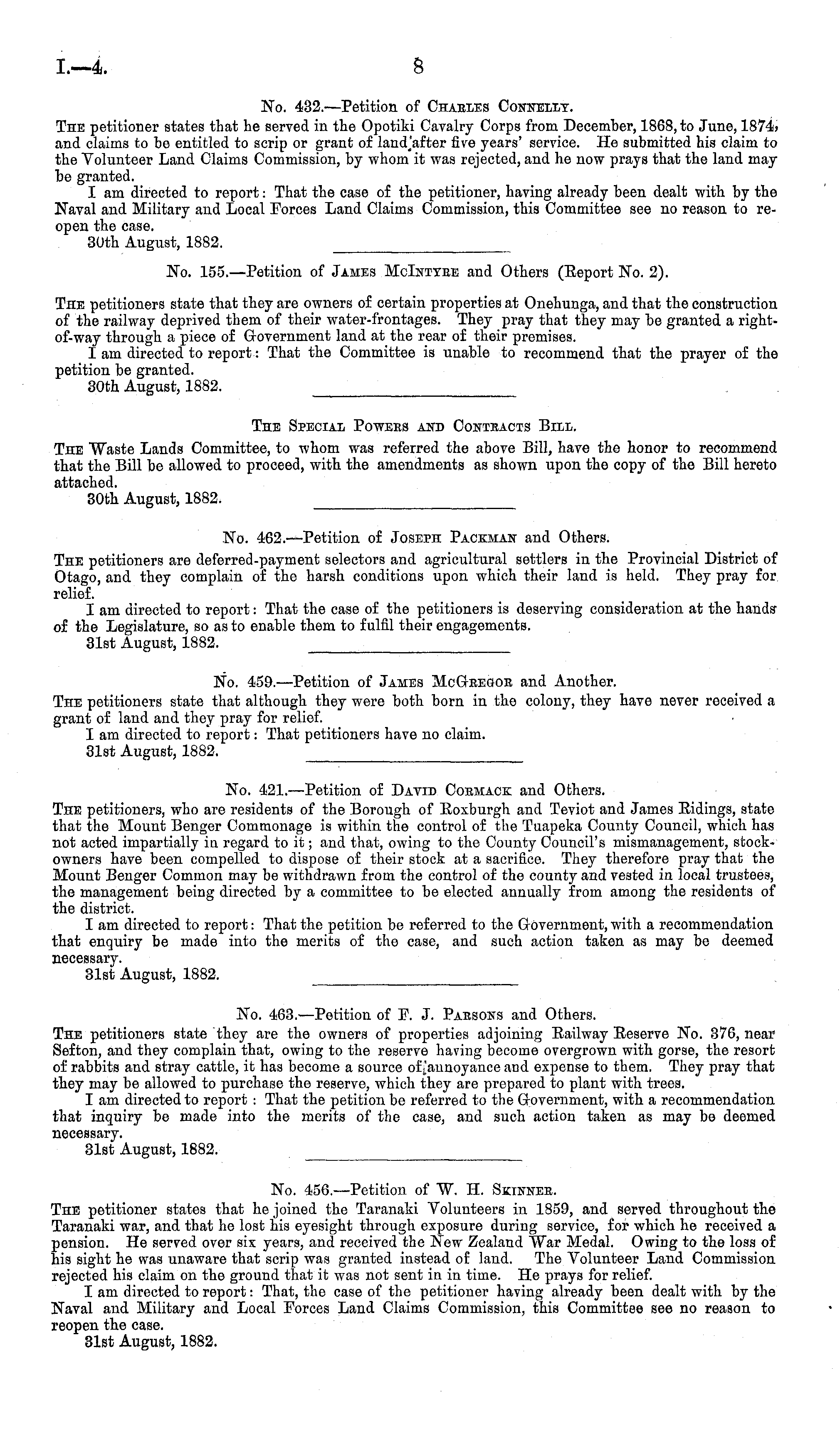 No. 462.—Petition of Joseph Packman and Others. The petitioners are deferred-payment selectors and agricultural settlers in the Provincial District of Otago, and they complain of the harsh conditions upon which their land is held. They pray for relief. lam directed to report: That the case of the petitioners is deserving consideration at the hands of the Legislature, so as to enable them to fulfil their engagements. 31st August, 1882.