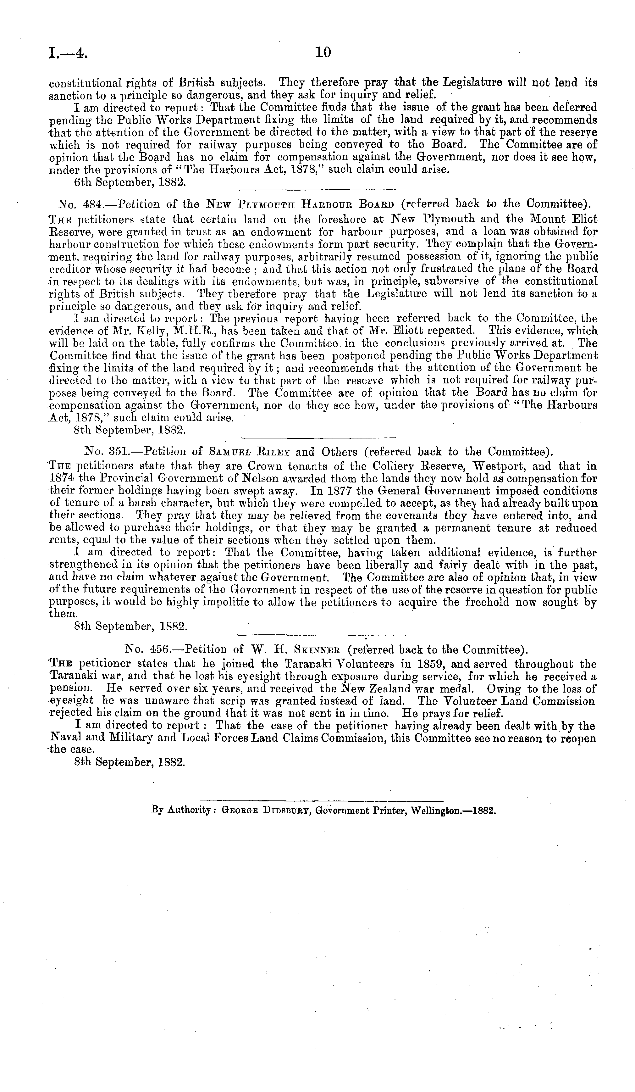 No. 351.—Petition of Samuel Eiley and Others (referred back to the Committee). The petitioners state that they are Crown tenants of the Colliery Eeserve, Westport, and that in 1874 the Provincial Government of Nelson awarded them the lands they now hold as compensation for their former holdings having been sw rept away. In 1877 the General Government imposed conditions of tenure of a harsh character, but which they were compelled to accept, as they had already built upon their sections. They pray that they may be relieved from the covenants they have entered into, and be allowed to purchase their holdings, or that they may be granted a permanent tenure at reduced rents, equal to the value of their sections when they settled upon them. I am directed to report: That the Committee, having taken additional evidence, is further strengthened in its opinion that the petitioners have been liberally and fairly dealt with in the past, and have no claim whatever against the Government. The Committee are also of opinion that, in view of the future requirements of the Government in respect of the use of the reserve in question for public purposes, it would be highly impolitic to allow the petitioners to acquire the freehold now sought by them. Bth September, 1882.