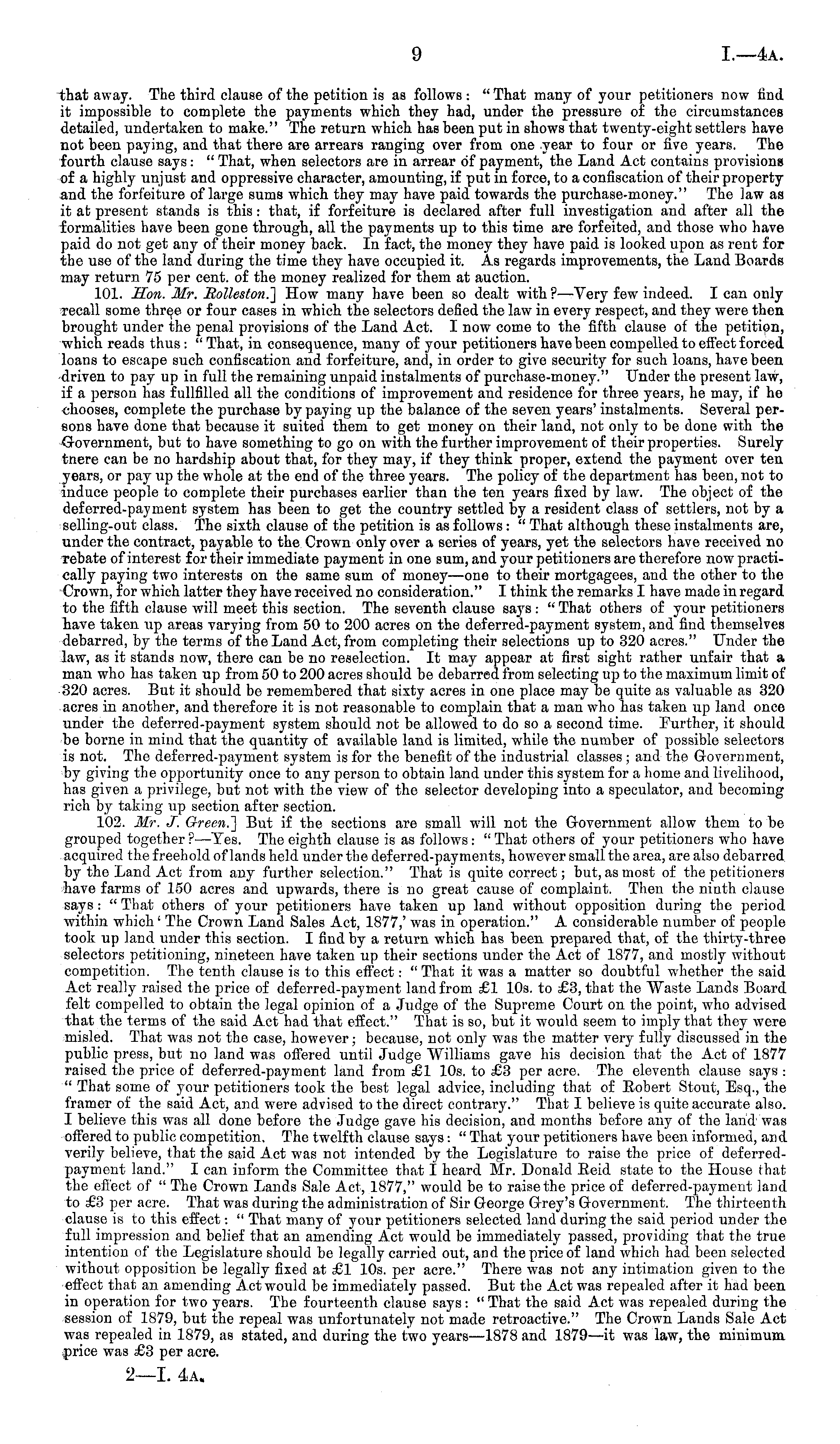 that away. The third clause of the petition is as follows : " That many of your petitioners now find it impossible to complete the payments which they had, under the pressure of the circumstances detailed, undertaken to make." The return which has been put in shows that twenty-eight settlers have not been paying, and that there are arrears ranging over from one year to four or five years. The fourth clause says : " That, when selectors are in arrear of payment, the Land Act contains provisions of a highly unjust and oppressive character, amounting, if put in force, to a confiscation of their property and the forfeiture of large sums which they may have paid towards the purchase-money." The law as it at present stands is this: that, if forfeiture is declared after full investigation and after all the formalities have been gone through, all the payments up to this time are forfeited, and those who have paid do not get any of their money back. In "fact, the money they have paid is looked upon as rent for the use of the land during the time they have occupied it. As regards improvements, the Land Boards may return 75 per cent, of the money realized for them at auction. 101. Son. Mr. Molleston.~\ How many have been so dealt with ?—Very few indeed. I can only recall some thre^e or four cases in which the selectors defied the law in every respect, and they were then brought under the penal provisions of the Land Act. I now come to the fifth clause of the petition, which reads thus : " That, in consequence, many of your petitioners have been compelled to effect forced loans to escape such confiscation and forfeiture, and, in order to give security for such loans, have been driven to pay up in full the remaining unpaid instalments of purchase-money." Under the present law, if a person has fullfilled all the conditions of improvement and residence for three years, he may, if he chooses, complete the purchase by paying up the balance of the seven years' instalments. Several persons have done that because it suited them to get money on their land, not only to be done with the Government, but to have something to go on with the further improvement of their properties. Surely tnere can be no hardship about that, for they may, if they think proper, extend the payment over ten years, or pay up the whole at the end of the three years. The policy of the department has been, not to induce people to complete their purchases earlier than the ten years fixed by law. The object of the deferred-payment system has been to get the country settled by a resident class of settlers, not by a selling-out class, the sixth clause of the petition is as follows: " That although these instalments are, under the contract, payable to the Crown only over a series of years, yet the selectors have received no rebate of interest for their immediate payment in one sum, and your petitioners are therefore now practically paying two interests on the same sum of money —one to their mortgagees, and the other to the Crown, for which latter they have received no consideration." I think the remarks I have made in regard to the fifth clause will meet this section. The seventh clause saj's : " That others of your petitioners have taken up areas varying from 50 to 200 acres on the deferred-payment system, and find themselves debarred, by the terms of the Land Act, from completing their selections up to 320 acres." Under the law, as it stands now, there can be no reselection. It may appear at first sight rather unfair that a man who has taken up from 50 to 200 acres should be debarred from selecting up to the maximum limit of 320 acres. But it should be remembered that sixty acres in one place may be quite as valuable as 320 acres in another, and therefore it is not reasonable to complain that a man who has taken up land once under the deferred-payment system should not be allowed to do so a second time. Further, it should be borne in mind that the quantity of available land is limited, while the number of possible selectors is not. The deferred-payment system is for the benefit of the industrial classes ; and the Government, by giving the opportunity once to any person to obtain land under this system for a home and livelihood, has given a privilege, but not with the view of the selector developing into a speculator, and becoming rich by taking up section after section. 102. Mr. J. Green.'] But if the sections are small will not the Government allow them to be grouped together ? —Yes. The eighth clause is as follows : " That others of your petitioners who have acquired the freehold of lands held under the deferred-payments, however small the area, are also debarred by the Land Act from any further selection." That is quite correct; but, as most of the petitioners have farms of 150 acres and upwards, there is no great cause of complaint. Then the ninth clause says : " That others of your petitioners have taken up land without opposition during the period within which' The Crown Land Sales Act, 1877,' was in operation." A considerable number of people took up land under this section. I find by a return which has been prepared that, of the thirty-three selectors petitioning, nineteen have taken up their sections under the Act of 1877, and mostly without competition. The tenth clause is to this effect: " That it was a matter so doubtful whether the said Act really raised the price of deferred-payment land from £1 10s. to £3, that the "Waste Lands Board felt compelled to obtain the legal opinion of a Judge of the Supreme Court on the point, who advised that the terms of the said Act had that effect." That is so, but it would seem to imply that they were misled. That was not the case, however; because, not only was the matter very fully discussed in the public press, but no land was offered until Judge "Williams gave his decision that the Act of 1877 raised the price of deferred-payment land from £1 10s. to £3 per acre. The eleventh cla