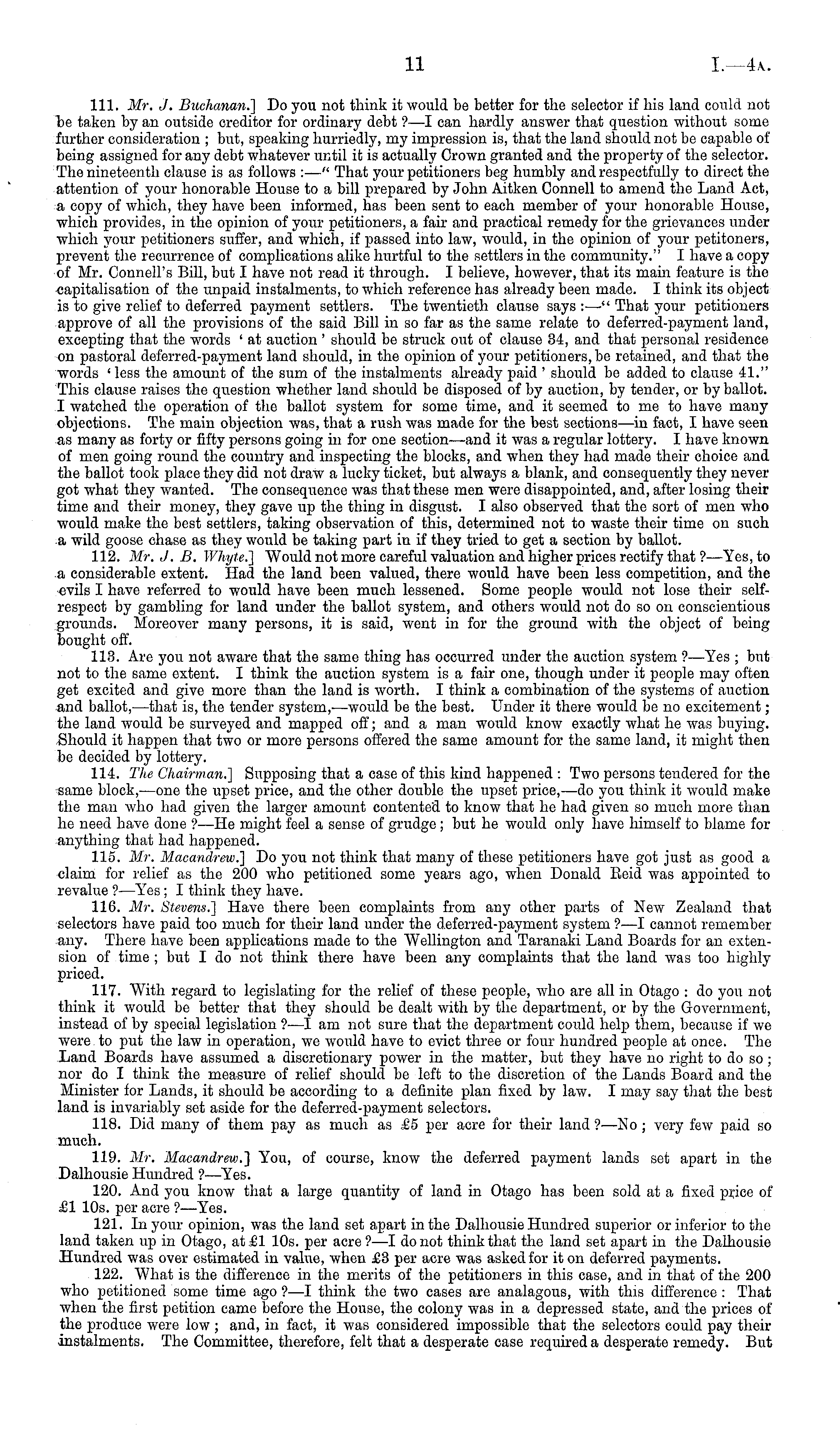 111. Mr. J. Buchanan.] Do you not think it would be better for the selector if his land could not be taken by an outside creditor for ordinary debt ?—I can hardly answer that question without some further consideration ; but, speaking hurriedly, my impression is, that the land should not be capable of being assigned for any debt whatever until it is actually Crown granted and the property of the selector. The nineteenth clause is as follows :—" That your petitioners beg humbly and respectfully to direct the attention of your honorable House to a bill prepared by John Aitken Connell to amend the Land Act, a copy of which, they have been informed, has been sent to each member of your honorable House, which provides, in the opinion of your petitioners, a fair and practical remedy for the grievances under which your petitioners suffer, and which, if passed into law, would, in the opinion of your petitoners, prevent the recurrence of complications alike hurtful to the settlers in the community." I have a copy of Mr. Connell's Bill, but I have not read it through. I believe, however, that its main feature is the capitalisation of the unpaid instalments, to which reference has already been made. I think its object is to give relief to deferred payment settlers. The twentieth clause says:—" That your petitioners approve of all the provisions of the said Bill in so far as the same relate to deferred-payment land, excepting that the words ' at auction ' should be struck out of clause 34, and that personal residence on pastoral deferred-payment land should, in the opinion of your petitioners, be retained, and that the "words ' less the amount of the sum of the instalments already paid ' should be added to clause 41." This clause raises the question whether land should be disposed of by auction, by tender, or by ballot. I watched the operation of the ballot system for some time, and it seemed to me to have many objections. The main objection was, that a rush was made for the best sections—in fact, I have seen as many as forty or fifty persons going in for one section—and it was a regular lottery. I have known of men going round the country and inspecting the blocks, and when they had made their choice and the ballot took place they did not draw a lucky ticket, but always a blank, and consequently they never got what they wanted. The consequence was that these men were disappointed, and, after losing their time and their money, they gave up the thing in disgust. I also observed that the sort of men who would make the best settlers, taking observation of this, determined not to waste their time on such a wild goose chase as they would be taking part in if they tried to get a section by ballot. 112. Mr.J.B. Whyte.] Would not more careful valuation and higher prices rectify that ?—Tes, to a considerable extent. Had the land been valued, there would have been less competition, and the evils I have referred to would have been much lessened. Some people would not lose their selfrespect by gambling for land under the ballot system, and others would not do so on conscientious grounds. Moreover many persons, it is said, went in for the ground with the object of being bought off. 113. Are you not aware that the same thing has occurred under the auction system ?—Tes ; but not to the same extent. I think the auction system is a fair one, though under it people may often get excited and give more than the land is worth. I think a combination of the systems of auction and ballot, —that is, the tender system,-—would be the best. Under it there would be no excitement; the land would be surveyed and mapped off; and a man would know exactly what he was buying. Should it happen that two or more persons offered the same amount for the same land, it might then be decided by lottery. 114. The Chairman.] Supposing that a case of this kind happened : Two persons tendered for the same block, —one the upset price, and the other double the upset price,—do you think it would make the man who had given the larger amount contented to know that he had given so much more than he need have done ?—He might feel a sense of grudge; but he would only have himself to blame for anything that had happened. 115. Mr. Macandrew.] Do you not think that many of these petitioners have got just as good a claim for relief as the 200 who petitioned some years ago, when Donald Beid was appointed to revalue ? —Yes; I think they have. 116. Mr. Stevens.] Have there been complaints from any other parts of New Zealand that selectors have paid too much for their land under the deferred-payment system ?■—l cannot remember any. There have been applications made to the Wellington and Taranaki Land Boards for an extension of time ; but I do not think there have been any complaints that the land was too highly priced. 117. With regard to legislating for the relief of these people, who are all in Otago : do you not think it would be better that they should be dealt with by the department, or by the Government, instead of by special legislation ?• —I am not sure that the department could help them, because if we were to put the law in operation, we would have to evict three or four hundred people at once. The Land Boards have assumed a discretionary power in the matter, but they have no right to do so; nor do I think the measure of relief should be left to the discretion of the Lands Board and the Minister for Lands, it should be according to a definite plan fixed by law. I may say that the best land is invariably set aside for the deferred-payment selectors. 118. Did many of them pay as much as £5 per acre for their land ? —No ; very few paid so much. 119. Mr. Macandrew.] You, of course, know the deferred payment lands set apart in the Dalhousie Hundred ?—Yes. 120. And you know that a large quantity of land in Otago has been sold at a fixed price of £1 10s. per acre ?—Yes. 121. In your opinion, was the land set apart in