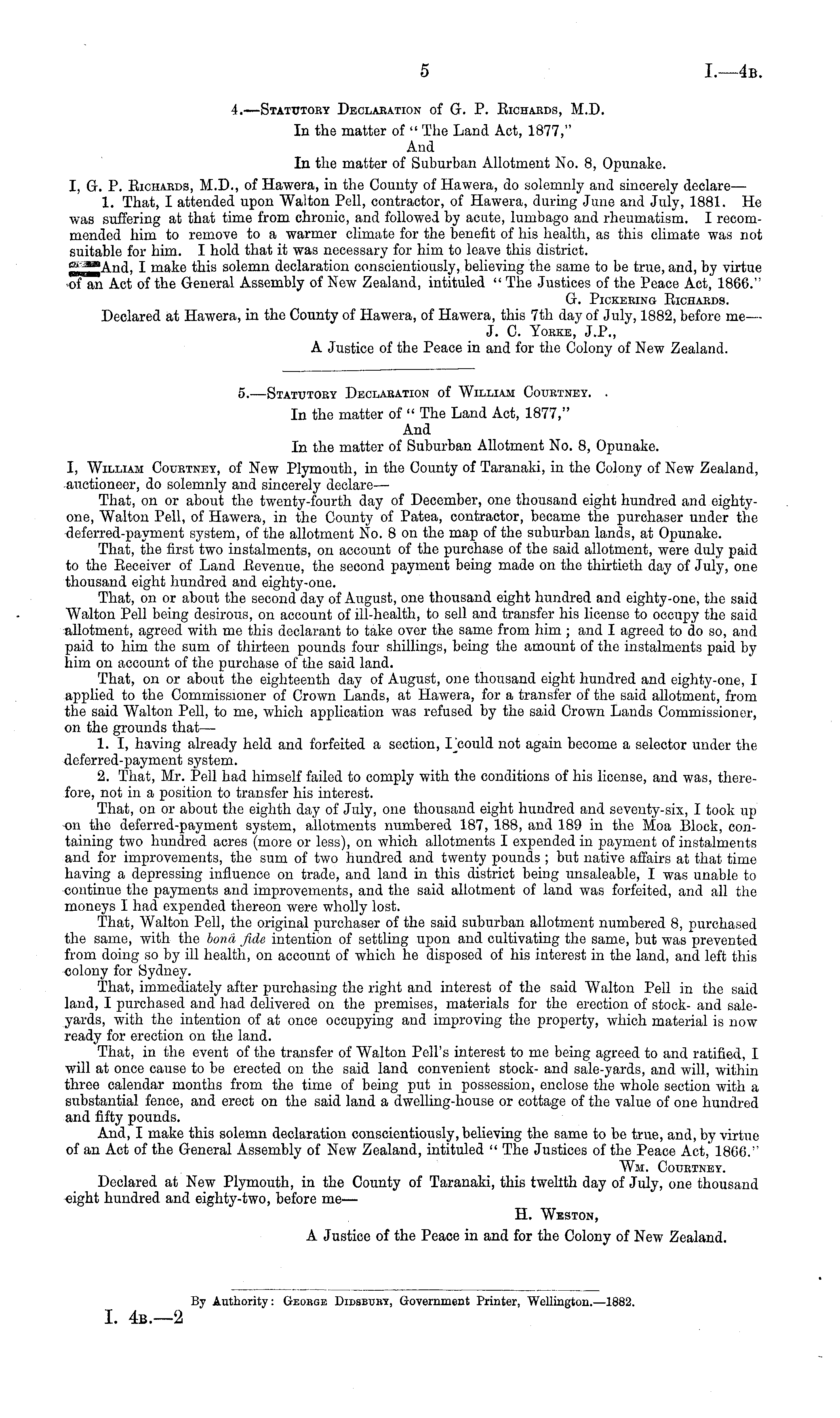 4.—Statutory Declaration of G. P. Richards, M.D. In the matter of " The Land Act, 1877," And In the matter of Suburban Allotment No. 8, Opunake. I, G. P. Richards, M.D., of Hawera, in the County of Hawera, do solemnly and sincerely declare— 1. That, I attended upon Walton Pell, contractor, of Hawera, during June and July, 1881. He was suffering at that time from chronic, and followed by acute, lumbago and rheumatism. I recommended him to remove to a warmer climate for the benefit of his health, as this climate was not suitable for him. I hold that it was necessary for him to leave this district. S^^fSAnd, I make this solemn declaration conscientiously, believing the same to be true, and, by virtue of an Act of the General Assembly of New Zealand, intituled " The Justices of the Peace Act, 1866." G. Pickering Richards. Declared at Hawera, in the County of Hawera, of Hawera, this 7th day of July, 1882, before me — J. C. Yorke, J.P., A Justice of the Peace in and for the Colony of New Zealand.