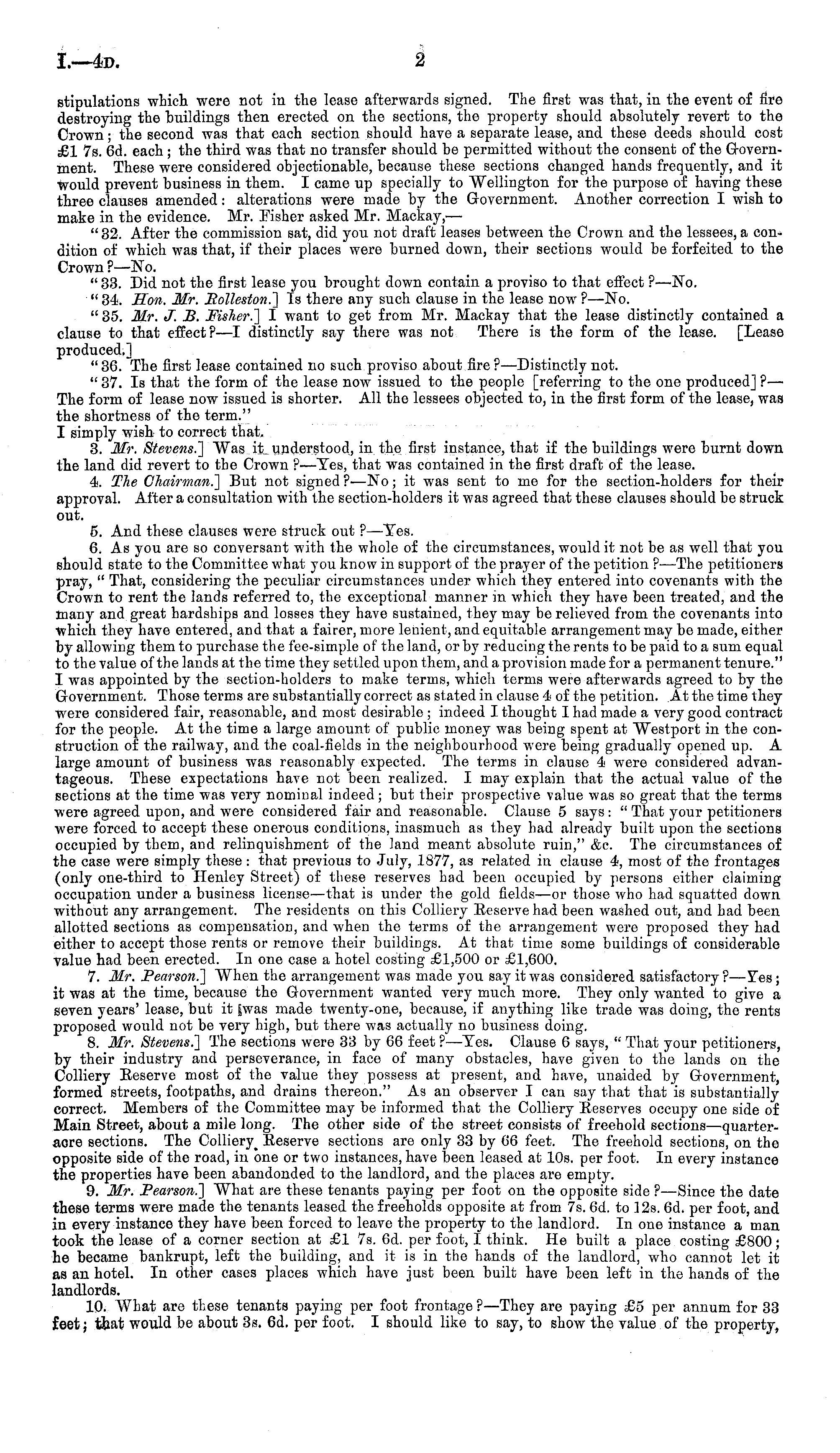 stipulations which were not in the lease afterwards signed. The first was that, in the event of fire destroying the buildings then erected on the sections, the property should absolutely revert to the Crown; the second was that each section should have a separate lease, and these deeds should cost £1 7s. 6d. each; the third was that no transfer should be permitted without the consent of the Government. These were considered objectionable, because these sections changed hands frequently, and it would prevent business in them. I came up specially to Wellington for the purpose of having these three clauses amended: alterations were made by the Government. Another correction I wish to make in the evidence. Mr. Fisher asked Mr. Mackay,— " 32. After the commission sat, did you not draft ieases between the Crown and the lessees, a condition of which was that, if their places were burned down, their sections would be forfeited to the Crown ?—No. " 33. Did not the first lease you brought down contain a proviso to that effect ?—No. " 34. Hon. Mr. Rolleston.] Is there any such clause in the lease now ? —No. " 35. Mr. J. B. Fisher.] I want to get from Mr. Mackay that the lease distinctly contained a clause to that effect? —I distinctly say there was not There is the form of the lease. [Lease produced.] "36. The first lease contained no such proviso about fire? —Distinctly not. " 37. Is that the form of the lease now issued to the people [referring to the one produced] ?— The form of lease now issued is shorter. All the lessees objected to, in the first form of the lease, was the shortness of the term." I simply wish to correct that. 3. Mr. Stevens.] Was it understood, in the first instance, that if the buildings were burnt down the land did revert to the Crown ?—Tes, that was contained in the first draft of the lease. 4. The Chairman.] But not signed ?—No; it was sent to me for the section-holders for their approval. After a consultation with the section-holders it was agreed that these clauses should be struck out. 5. And these clauses were struck out ? —Tes. 6. As you are so conversant with the whole of the circumstances, would it not be as well that you should state to the Committee what you know in support of the prayer of the petition ? —The petitioners pray, " That, considering the peculiar circumstances under which they entered into covenants with the Crown to rent the lands referred to, the exceptional manner in which they have been treated, and the many and great hardships and losses they have sustained, they may be relieved from the covenants into which they have entered, and that a fairer, more lenient, and equitable arrangement may be made, either by allowing them to purchase the fee-simple of the land, or by reducing the rents to be paid to a sum equal to the value of the lands at the time they settled upon them, and a provision made for a permanent tenure." I was appointed by the section-holders to make terms, which terms were afterwards agreed to by the Government. Those terms are substantially correct as stated in clause 4of the petition. At the time they were considered fair, reasonable, and most desirable ; indeed I thought I had made a very good contract for the people. At the time a large amount of public money was being spent at Westport in the construction of the railway, and the coal-fields in the neighbourhood were being gradually opened up. A large amount of business was reasonably expected. The terms in clause 4 were considered advantageous. These expectations have not been realized. I may explain that the actual value of the sections at the time was very nominal indeed; but their prospective value was so great that the terms were agreed upon, and were considered fair and reasonable. Clause 5 says : " That your petitioners were forced to accept these onerous conditions, inasmuch as they had already built upon the sections occupied by them, and relinquishment of the land meant absolute ruin," &c. The circumstances of the case were simply these : that previous to July, 1877, as related in clause 4, most of the frontages (only one-third to Henley Street) of these reserves had been occupied by persons either claiming occupation under a business license—that is under the gold fields—or those who had squatted down without any arrangement. The residents on this Colliery Eeserve had been washed out, and had been allotted sections as compensation, and when the terms of the arrangement were proposed they had either to accept those rents or remove their buildings. At that time some buildings of considerable Value had been erected. In one case a hotel costing £1,500 or £1,600. 7. Mr. Pearson.] When the arrangement was made you say it was considered satisfactory?—Yes; it was at the time, because the Government wanted very much more. They only wanted to give a seven years' lease, but it |was made twenty-one, because, if anything like trade was doing, the rents proposed would not be very high, but there was actually no business doing. 8. Mr. Stevens.] The sections were 33 by 66 feet ? —Tes. Clause 6 says, " That your petitioners, by their industry and perseverance, in face of many obstacles, have given to the lands on the Colliery Eeserve most of the value they possess at present, and have, unaided by Government, formed streets, footpaths, and drains thereon." As an observer I can say that that is substantially correct. Members of the Committee may be informed that the Colliery Eeserves occupy one side of Main Street, about a mile long. The other side of the street consists of freehold sections—quarteracre sections. The Colliery _ Eeserve sections are only 33 by 66 feet. The freehold sections, on the opposite side of the road, in one or two instances, have been leased at 10s. per foot. In every instance the properties have been abandonded to the landlord, and the places are empty. 9. Mr. Pearson.] What are these tenants paying per foot on the opposite si