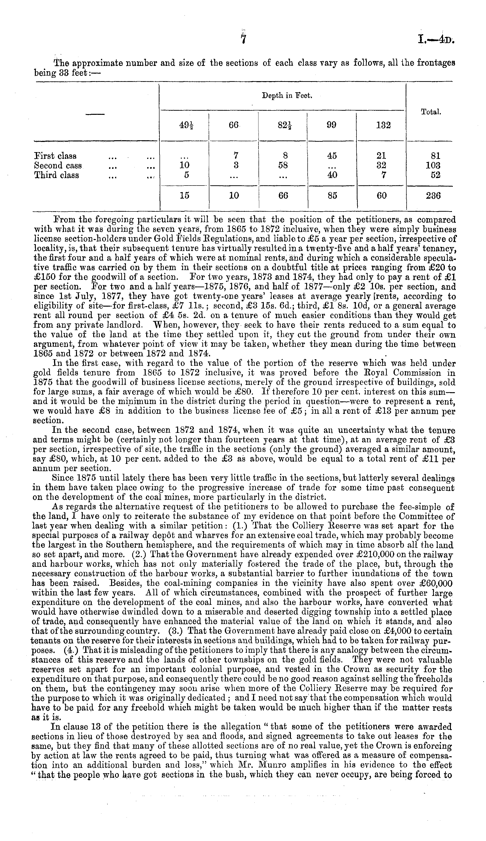 From the foregoing particulars it will be seen that the position of the petitioners, as compared with what it was during the seven years, from 1865 to 1872 inclusive, when they were simply business license section-holders under Gold Pields Eegulations, and liable to £5 a year per section, irrespective of locality, is, that their subsequent tenure has virtually resulted in a twenty-five and a half years' tenancy, the first four and a half years of which were at nominal rents, and during which a considerable speculative traffic was carried on by them in their sections on a doubtful title at prices ranging from £20 to £150 for the goodwill of a section. For two years, 1873 and 1874, they had only to pay a rent of £1 per section. For two and a half years—lß7s, 1876, and half of 1877—only £2 10s. per section, and since Ist July, 1877, they have got twenty-one years' leases at average yearly [rents, according to eligibility of site—for first-class, £7 lis.; second, £3 15s. 6d.; third, £1 Bs. lOd, or a general average rent all round per section of £4 ss. 2d. on a tenure of much easier conditions than they would get from any private landlord. When, however, they seek to have their rents reduced to a sum equal to the value of the land at the time they settled upon it, they cut the ground from under their own argument, from whatever point of view it may be taken, whether they mean during the time between 1865 and 1872 or between 1872 and 1874. In the first case, with regard to the value of the portion of the reserve which was held under gold fields tenure from 1865 to 1872 inclusive, it was proved before the Eoyal Commission in 1875 that the goodwill of business license sections, merely of the ground irrespective of buildings, sold for large sums, a fair average of which would be £80. If therefore 10 per cent, interest on this sum— and it would be the minimum in the district during the period in question—were to represent a rent, we would have £8 in addition to the business license fee of £5 ; in all a rent of £13 per annum per section. In the second case, between 1872 and 1874, when it was quite an uncertainty what the tenure and terms might be (certainly not longer than fourteen years at that time), at an average rent of £3 per section, irrespective of site, the traffic in the sections (only the ground) averaged a similar amount, say £80, which, at 10 per cent, added to the £3 as above, would be equal to a total rent of £11 per annum per section. Since 1875 until lately there has been very little traffic in the sections, but latterly several dealings in them have taken place owing to the progressive increase of trade for some time past consequent on the development of the coal mines, more particularly in the district. As regards the alternative request of the petitioners to be allowed to purchase the fee-simple of the land, I have only to reiterate the substance of my evidence on that point before the Committee of last year when dealing with a similar petition: (1.) That the Colliery Eeserve was set apart for the special purposes of a railway depot and wharves for an extensive coal trade, which may probably become the largest in the Southern hemisphere, and the requirements of which may in time absorb all the land so set apart, and more. (2.) That the Government have already expended over £210,000 on the railway and harbour works, which has not only materially fostered the trade of the place, but, through the necessary construction of the harbour works, a substantial barrier to further inundations of the town has been raised. Besides, the coal-mining companies in the vicinity have also spent over £60,000 within the last few years. All of which circumstances, combined with the prospect of further large expenditure on the development of the coal mines, and also the harbour works, have converted what would have otherwise dwindled down to a miserable and deserted digging township into a settled place of trade, and consequently have enhanced the material value of the land on which it stands, and also that of the surrounding country. (3.) That the Government have already paid close on £4,000 to certain tenants on the reserve for their interests in sections and buildings, which had to be taken for railway purposes. (4.) That it is misleading of the petitioners to imply that there is any analogy between the circumstances of this reserve and the lands of other townships on the gold fields. They were not valuable reserves set apart for an important colonial purpose, and vested in the Crown as security for the expenditure on that purpose, and consequently there could be no good reason against selling the freeholds on them, but the contingency may soon arise when more of the Colliery Eeserve may be required for the purpose to which it was originally dedicated ; and I need not say that the compensation which would have to be paid for any freehold which might be taken would be much higher than if the matter rests as it is. In clause 13 of the petition there is the allegation " that some of the petitioners were awarded sections in lieu of those destroyed by sea and floods, and signed agreements to take out leases for the same, but they find that many of these allotted sections are of no real value, yet the Crown is enforcing by action at law the rents agreed to be paid, thus turning what was offered as a measure of compensation into an additional burden and loss," which Mr. Munro amplifies in his evidence to the effect " that the people who have got sections in the bush, which they can never occupy, are being forced to