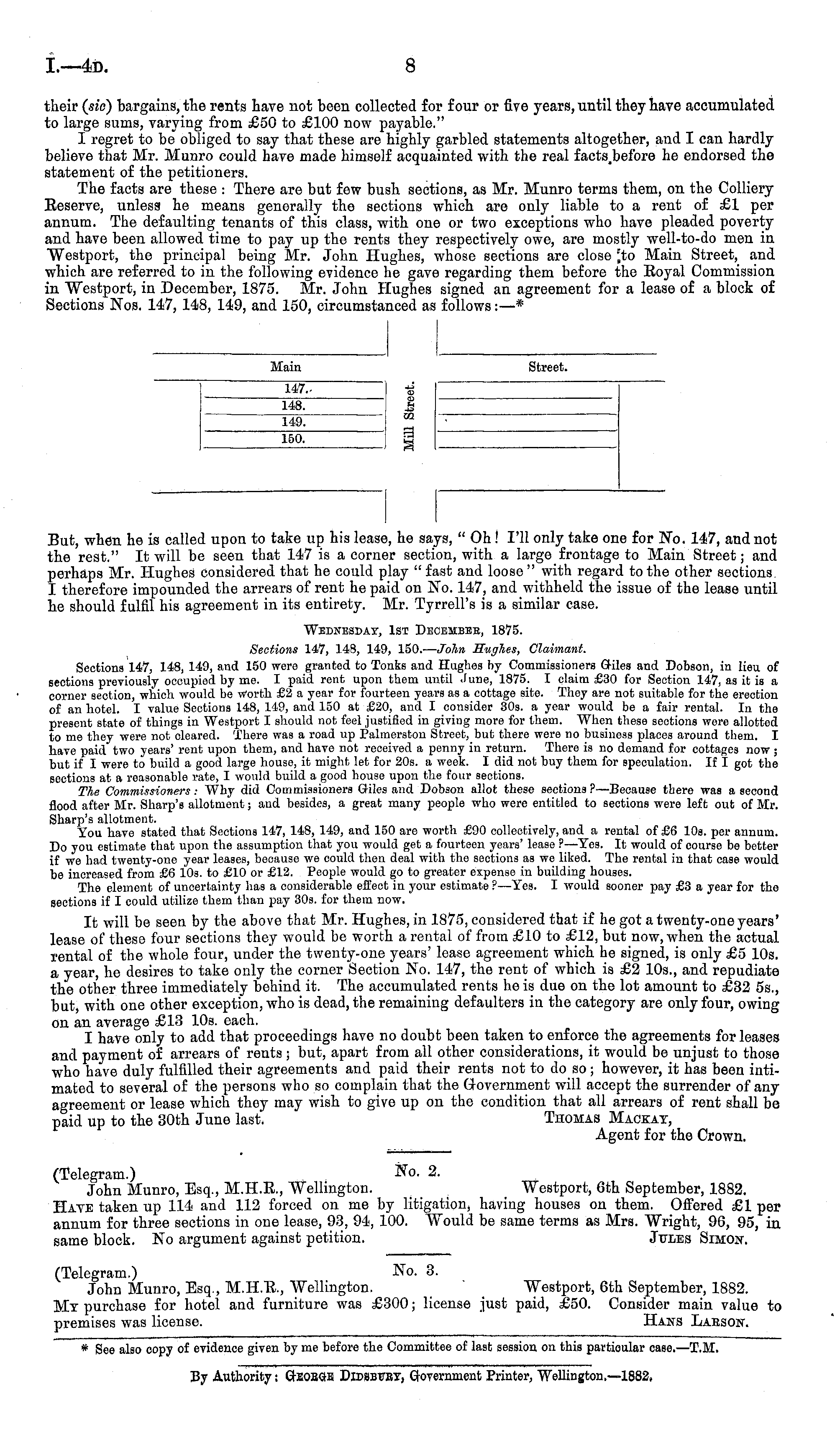 But, when he is called upon to take up his lease, he says, " Oh ! I'll only take one for No. 147, and not the rest." It will be seen that 147 is a corner section, with a large frontage to Main Street; and perhaps Mr. Hughes considered that he could play " fast and loose " with regard to the other sections. I therefore impounded the arrears of rent he paid on No. 147, and withheld the issue of the lease until he should fulfil his agreement in its entirety. Mr. Tyrrell's is a similar case. Wednesday, Ist Decembeb, 1875. Sections 147, 148, 149, 150.' — John Hughes, Claimant. Sections 147, 148, 149, and 150 were granted to Tonks and Hughes by Commissioners Giles and Dobson, in lieu of sections previously occupied, by me. I paid rent upon them until June, 1875. I claim £30 for Section 147, as it is a corner section, which would be Worth £2 a year for fourteen years as a cottage site. They are not suitable for the erection of an hotel. I value Sections 148, 149, and 150 at £20, and I consider 30s. a year would be a fair rental. In the present state of things in Westport I should not feel justified in giving more for them. When these sections were allotted to me they were not cleared. There was a road up Palmerston Street, but there were no business places around them. I have paid two years' rent upon them, and have not received a penny in return. There is no demand for cottages now; but if I were to build a good large house, it might let for 20s. a week. I did not buy them for speculation. If I got the sections at a reasonable rate, I would build a good house upon the four sections. The Commissioners: Why did Commissioners Giles and Dobson allot these sections ? —Because there was a second flood after Mr. Sharp's allotment; and besides, a great many people who were entitled to sections were left out of Mr. Sharp's allotment. You have stated that Sections 147, 148, 149, and 150 are worth £90 collectively, and a rental of £6 10s. per annum. Do you estimate that upon the assumption that you would get a fourteen years' lease ?—Yes. It would of course be better if we had twenty-one year leases, because we could then deal with the sections as we liked. The rental in that ease would be increased from £6 10s. to £10 or £12. People would go to greater expense in building houses. The element of uncertainty has a considerable effect in your estimate ?—Yes. I would sooner pay £3 a year for the sections if I could utilize them than pay 30s. for them now. It will be seen by the above that Mr. Hughes, in 1875, considered that if he got a twenty-one years' lease of these four sections they would be worth a rental of from £10 to £12, but now, when the actual rental of the whole four, under the twenty-one years' lease agreement which he signed, is only £5 10s. a year, he desires to take only the corner Section No. 147, the rent of which is £2 10s., and repudiate the other three immediately behind it. The accumulated rents he is due on the lot amount to £32 55., but, with one other exception, who is dead, the remaining defaulters in the category are only four, owing on an average £13 10s. each. I have only to add that proceedings have no doubt been taken to enforce the agreements for leases and payment of arrears of rents; but, apart from all other considerations, it would be unjust to those who have duly fulfilled their agreements and paid their rents not to do so; however, it has been intimated to several of the persons who so complain that the Government will accept the surrender of any agreement or lease which they may wish to give up on the condition that all arrears of rent shall be paid up to the 30th June last. Thomas Mackay, Agent for the Crown.