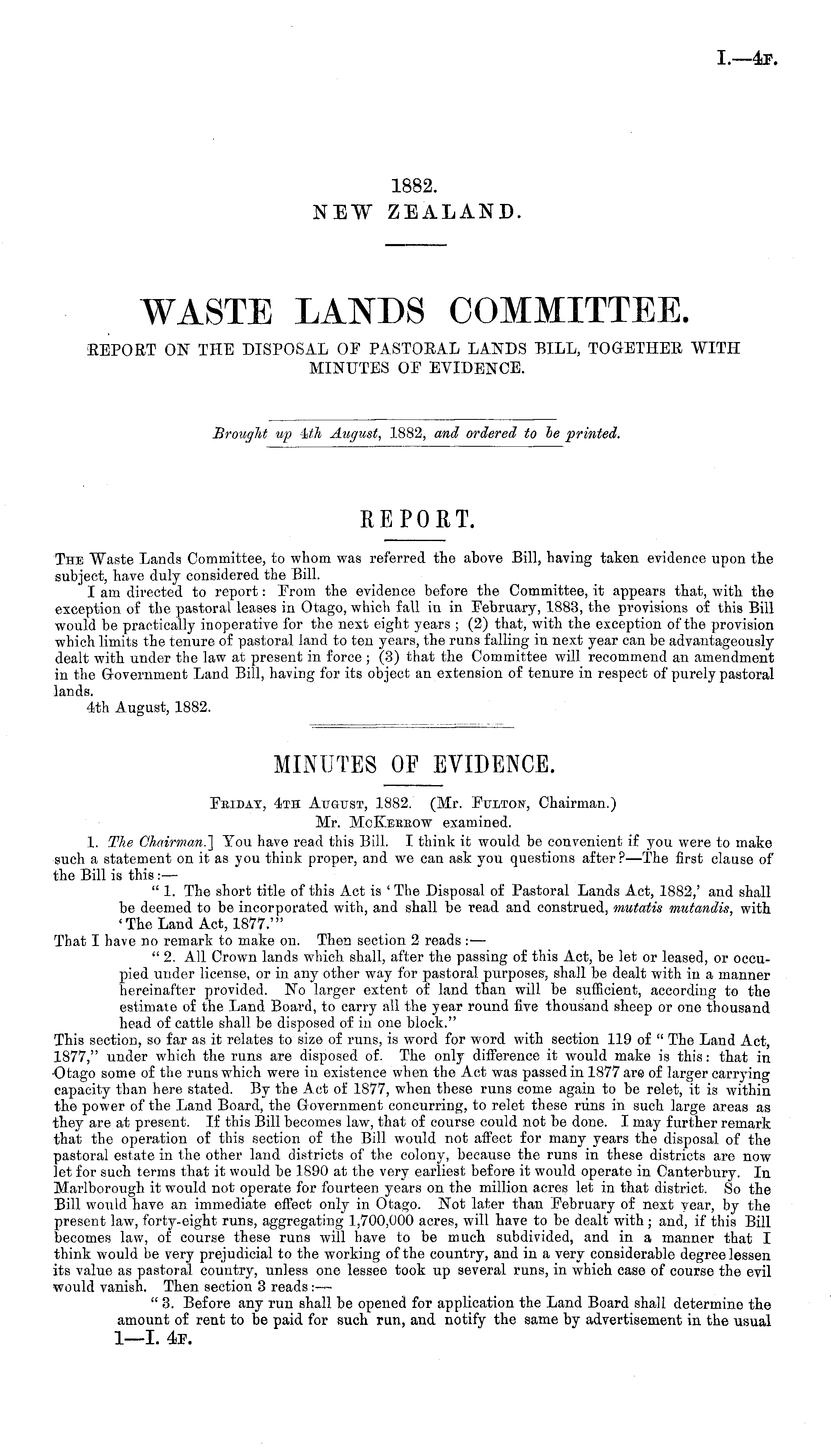 The Waste Lands Committee, to whom was referred the above Bill, having taken evidence upon the subject, have duly considered the Bill. lam directed to report: From the evidence before the Committee, it appears that, with the exception of the pastoral leases in Otago, which fall in in February, 1883, the provisions of this Bill would be practically inoperative for the next eight years ; (2) that, with the exception of the provision which limits the tenure of pastoral land to ten years, the runs falling in next year can be advantageously dealt with under the law at present in force ; (3) that the Committee will recommend an amendment in the Government Land Bill, having for its object an extension of tenure in respect of purely pastoral lands. 4th August, 1882.