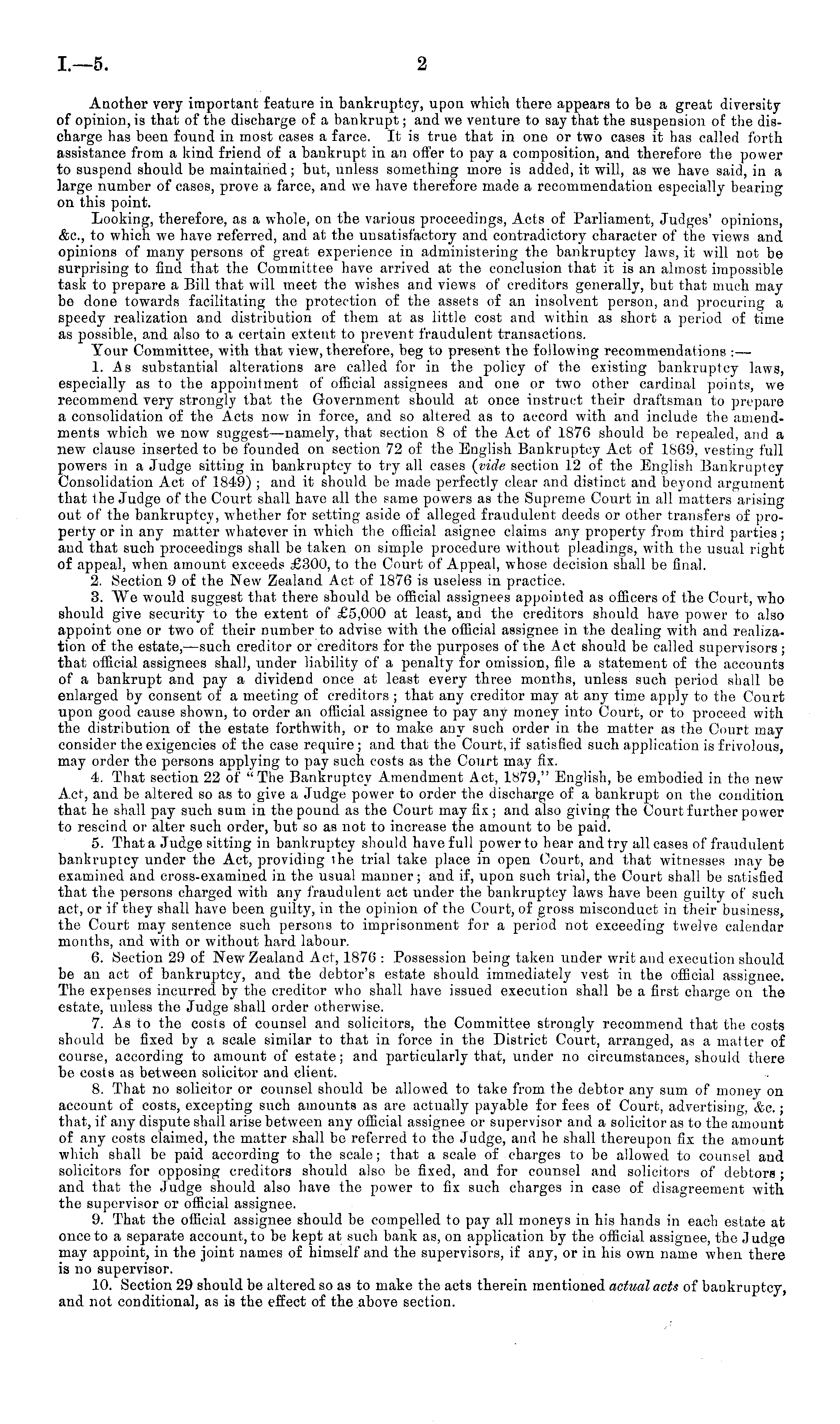 Another very important feature in bankruptcy, upon which there appears to be a great diversity of opinion, is that of the discharge of a bankrupt; and we venture to say that the suspension of the discharge has been found in most cases a farce. It is true that in one or two cases it has called forth assistance from a kind friend of a bankrupt in an offer to pay a composition, and therefore the power to suspend should be maintained; but, unless something more is added, it will, as we have said, in a large number of cases, prove a farce, and we have therefore made a recommendation especially bearing on this point. Looking, therefore, as a whole, on the various proceedings, Acts of Parliament, Judges' opinions, &c, to which we have referred, and at the unsatisfactory and contradictory character of the views and opinions of many persons of great experience in administering the bankruptcy laws, it will not be surprising to find that the Committee have arrived at the conclusion that it is an almost impossible task to prepare a Bill that will meet the wishes and views of creditors generally, but that much may be done towards facilitating the protection of the assets of an insolvent person, and procuring a speedy realization and distribution of them at as little cost and within as short a period of time as possible, and also to a certain extent to prevent fraudulent transactions. Your Committee, with that view, therefore, beg to present the following recommendations :— 1. .As substantial alterations are called for in the policy of the existing bankruptcy laws, especially as to the appointment of official assignees and one or two other cardinal points, we recommend very strongly that the Government should at once instruct their draftsman to prepare a consolidation of the Acts now in force, and so altered as to accord with and include the amendments which we now suggest —namely, that section 8 of the Act of 1876 should be repealed, and a new clause inserted to be founded on section 72 of the English Bankruptcy Act of 1869, vesting full powers in a Judge sitting in bankruptcy to try all cases (vide section 12 of the English Bankruptcy Consolidation Act of 1849) ; and it should be made perfectly clear and distinct and beyond argument that Ihe Judge of the Court shall have all the same powers as the Supreme Court in all matters arising out of the bankruptcy, whether for setting aside of alleged fraudulent deeds or other transfers of property or in any matter whatever in which the official asignee claims any property from third parties; and that such proceedings shall be taken on simple procedure without pleadings, with the usual right of appeal, when amount exceeds £300, to the Court of Appeal, whose decision shall be final. 2. Section 9 of the New Zealand Act of 1876 is useless in practice. 3. We would suggest that there should be official assignees appointed as officers of the Court, who should give security to the extent of £5,000 at least, and the creditors should have power to also appoint one or two of their number to advise with the official assignee in the dealing with and realization of the estate, —such creditor or creditors for the purposes of the Act should be called supervisors ; that official assignees shall, under liability of a penalty for omission, file a statement of the accounts of a bankrupt and pay a dividend once at least every three months, unless such period shall be enlarged by consent of a meeting of creditors ; that any creditor may at any time apply to the Court upon good cause shown, to order an official assignee to pay any money into Court, or to proceed with the distribution of the estate forthwith, or to make any such order in the matter as the Court may consider the exigencies of the case require ; and that the Court, if satisfied such application is frivolous, may order the persons applying to pay such costs as the Court may fix. 4. That section 22 of "The Bankruptcy Amendment Act, 1879," English, be embodied in the new Act, and be altered so as to give a Judge power to order the discharge of a bankrupt on the condition that he shall pay such sum in the pound as the Court may fix; and also giving the Court further power to rescind or alter such order, but so as not to increase the amount to be paid. 5. That a Judge sitting in bankruptcy should have full power to hear and try all cases of fraudulent bankruptcy under the Act, providing the trial take place in open Court, and that witnesses may be examined and cross-examined in the usual manner; and if, upon such trial, the Court shall be satisfied that the persons charged with any fraudulent act under the bankruptcy laws have been guilty of such act, or if they shall have been guilty, in the opinion of the Court, of gross misconduct in their business, the Court may sentence such persons to imprisonment for a period not exceeding twelve calendar months, and with or without hard labour. 6. Section 29 of New Zealand Act, 1876 : Possession being taken under writ and execution should be an act of bankruptcy, and the debtor's estate should immediately vest in the official assignee. The expenses incurred by the creditor who shall have issued execution shall be a first charge on the estate, unless the Judge shall order otherwise. 7. As to the costs of counsel and solicitors, the Committee strongly recommend that the costs should be fixed by a scale similar to that in force in the District Court, arranged, as a matter of course, according to amount of estate; and particularly that, under no circumstances, should there be costs as between solicitor and client. 8. That no solicitor or counsel should be allowed to take from the debtor any sum of money on account of costs, excepting such amounts as are actually payable for fees of Court, advertising, &c.; that, if any dispute shall arise between any official assignee or supervisor and a solicitor as to the amount of any costs claimed, the matter shall bo referred to the Judg