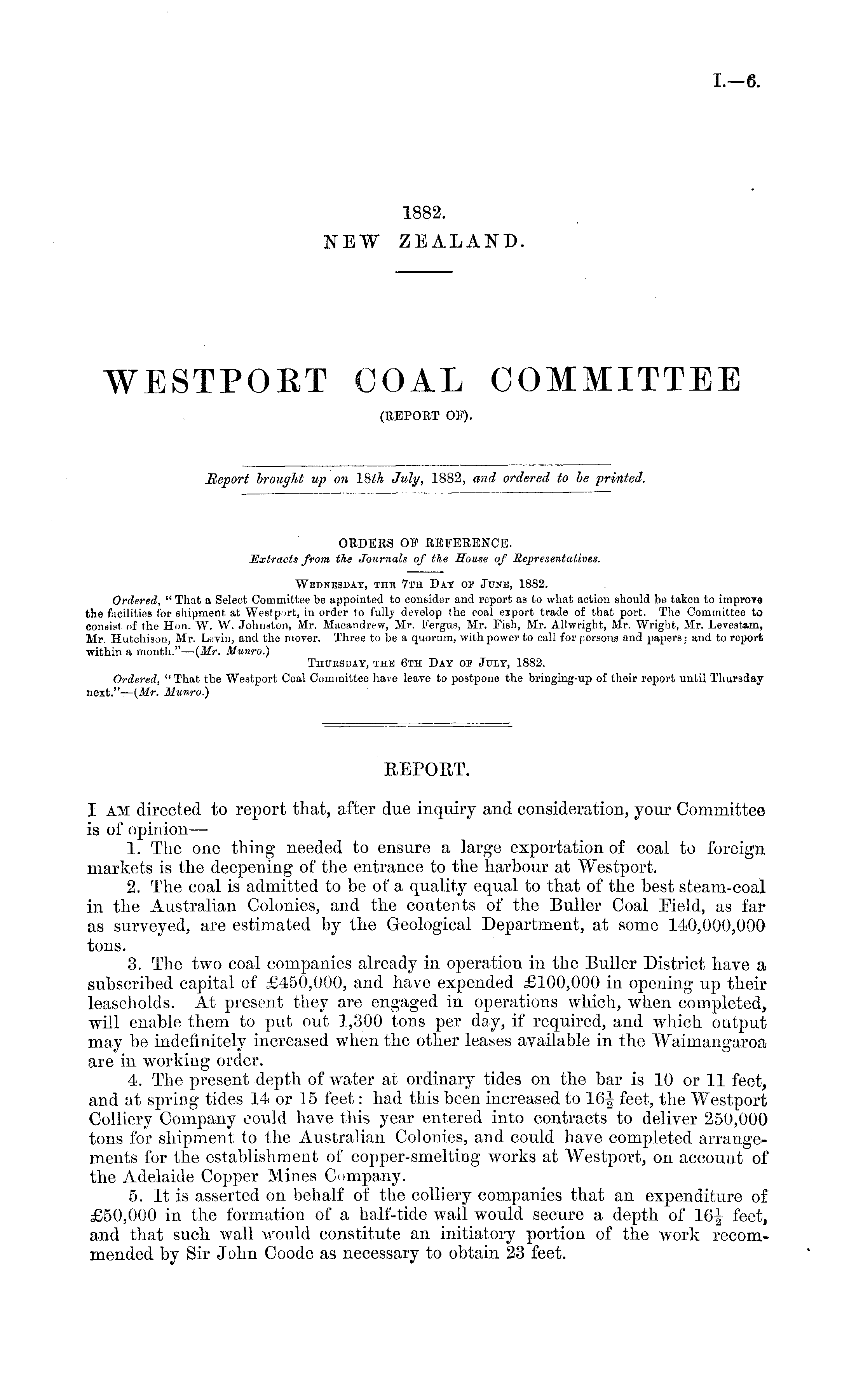 Wednesday, the 7th Day or June, 1882. Ordered, " That a Select Committee be appointed to consider and report as to what action should be taken to improve the facilities for shipment, at Westport, in order to fullv develop the coal export trade of that port. The Committee to consist of the Hon. W. W. Johnston, Mr. Macandrew, Mr. Fergus, Mr. Fish, Mr. Allwright, Mr. Wright, Mr. Levestam, Mr. Hutchison, Mr. Levin, and the mover. Three to be a quorum, with power to call for persons and papers; and to report within a month." — (Mr. Munro.) Thursday, the 6th Day oe July, 1882.
