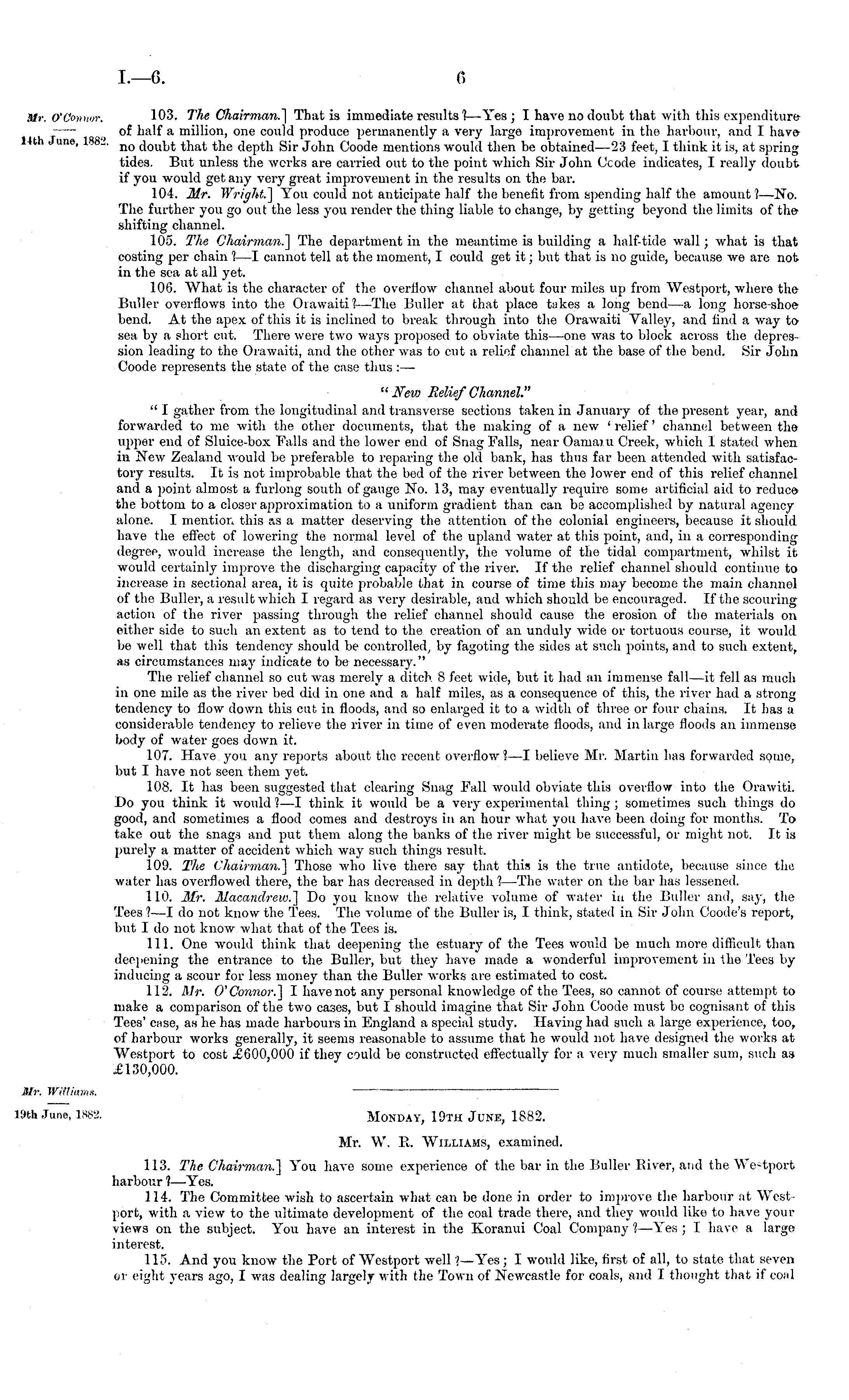 Monday, 19th June, 1882. Mr. W. E, Williams, examined. 113. The Chairman.] You have some experience of the bar in the Buller Biver, and the We-tport harbour ?—Yes. 114. The Committee wish to ascertain what can be clone in order to improve the harbour at Westport, with a view to the ultimate development of the coal trade there, and they would like to have your views on the subject. You have an interest in the Koranui Coal Company ?—Yes ; I have a large interest. 115. And you know the Port of Westport well ? —Yes; I would like, first of all, to state that seven or eight years ago, I was dealing largely with the Town of Newcastle for coals, and I thought that if coal