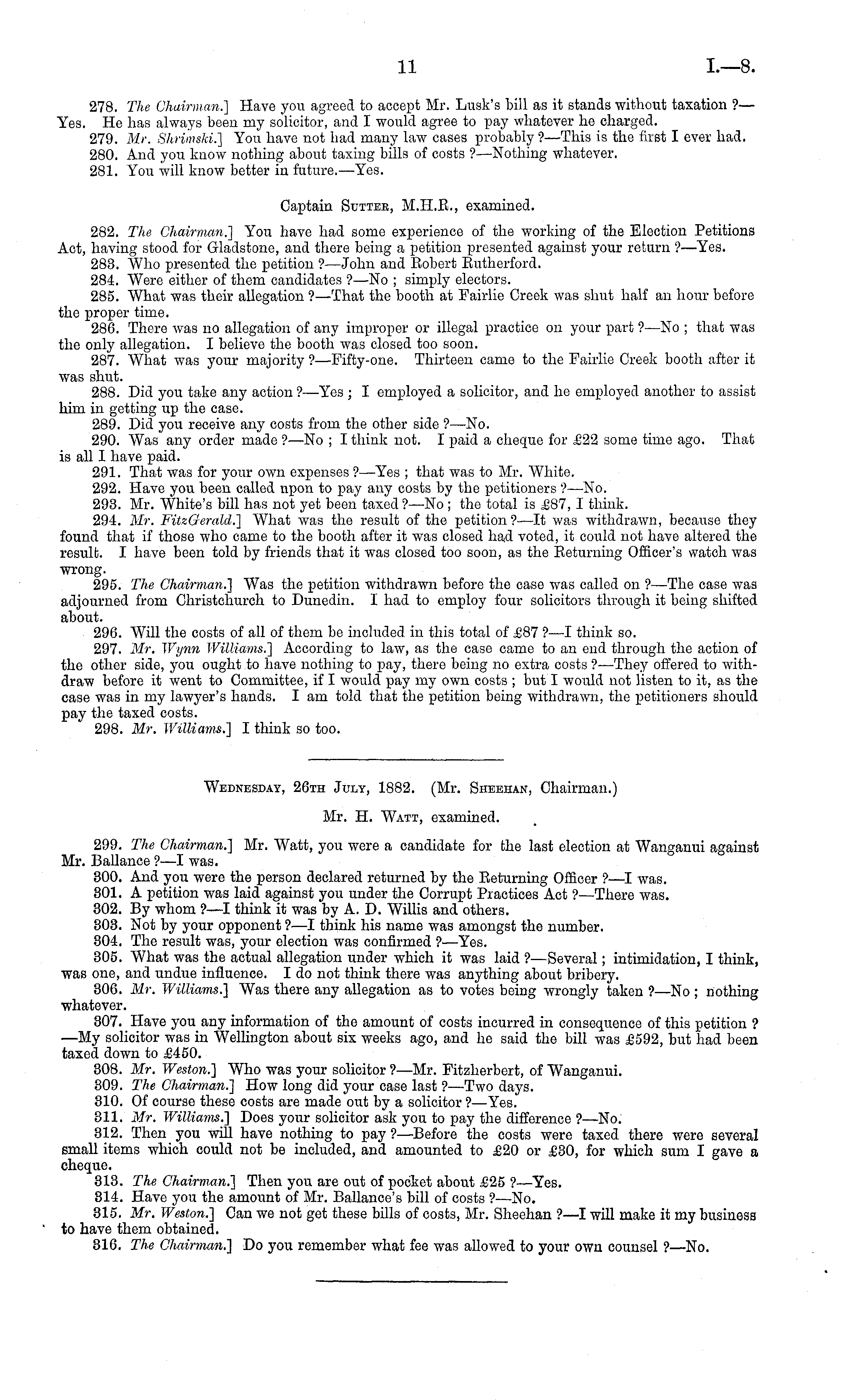 Wednesday, 26th July, 1882. (Mr. Sheehan, Chairman.) Mr. H. Watt, examined. 299. The Chairman.] Mr. Watt, you were a candidate for the last election at Wanganui against Mr. Ballance ? —I was. 300. And you were the person declared returned by the Eeturning Officer ?—I was. 301. A petition was laid against you under the Corrupt Practices Act ?—There was. 302. By whom ?—I think it was by A. D. Willis and others. 303. Not by your opponent ?—I think his name was amongst the number. 304. The result was, your election was confirmed ?—Yes. 305. What was the actual allegation under which it was laid ?—Several; intimidation, I think, was one, and undue influence. Ido not think there was anything about bribery. 306. Mr. Williams.] Was there any allegation as to votes being wrongly taken ?—No ; nothing whatever. 307. Have you any information of the amount of costs incurred in consequence of this petition ? —My solicitor was in Wellington about six weeks ago, and he said the bill was £592, hut had been taxed down to £450. 308. Mr. Weston.] Who was your solicitor ?—Mr. Fitzherbert, of Wanganui. 309. The Chairman.] How long did your case last ?—Two days. 310. Of course these costs are made out by a solicitor ?—Yes. 311. Mr. Williams.] Does your solicitor ask you to pay the difference ?—No. 312. Then you will have nothing to pay ?—Before the costs were taxed there were several small items which could not be included, and amounted to £20 or £30, for which sum I gave a cheque. 313. The Chairman.] Then you are out of pocket about £25 ?—Yes. 314. Have you the amount of Mr. Ballance's bill of costs ?—No. 315. Mr. Weston.] Can we not get these bills of costs, Mr. Sheehan ?—I will make it my business to have them obtained. 816. The Chairman.] Do you remember what fee was allowed to your own counsel ? —No.
