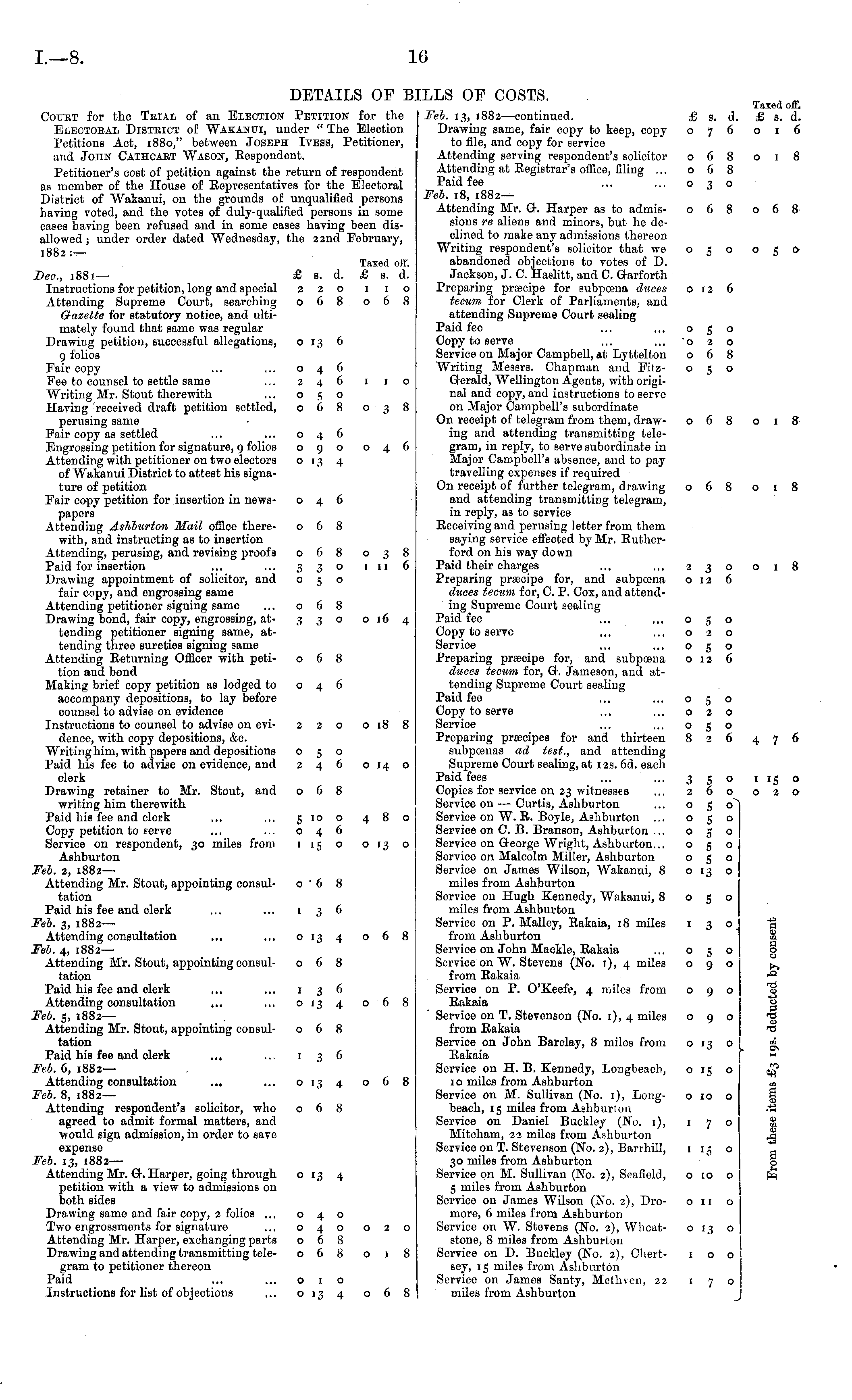 DETAILS OF BILLS OF COSTS. Taxed off. Court for the Trial of an Election Petition for the Feb. 13, 1882 —continued. £ s. d. £s. d. Electoral District of Wakanui, under " The Election Drawing same, fair copy to keep, copy 076 016 Petitions Act, 1880," between Joseph Ivess, Petitioner, to file, and copy for service and John Cathcart Wason, Bespondent. Attending serving respondent's solicitor 068 018 Petitioner's cOBt of petition against the return of respondent Attending at Eegistrar's office, filing ... 068 as member of the House of Eepresentatives for the Electoral Paid fee ... ... 030 District of Wakanui, on the grounds of unqualified persons -Feb. 18, 1882 having voted, and the votes of duly-qualified persons in some Attending Mr. Q. Harper as to admis- 068 068 cases having been refused and in some cases having been dis- sions re aliens and minors, but he deallowed ; under order dated Wednesday, the 22nd February, elmed to make any admissions thereon ,gg 2 . Writing respondent's solicitor that we 050 050 Taxed off. abandoned objections to votes of D. Dec, 1881 — £ s. d. £ s. d. Jackson, J. C. Haslitt, and C. Q-arforth Instructions for petition, long and special 220 1 1 o Preparing praecipe for subpoena duces 012 6 Attending Supreme Court, searching 068 068 tecum for Clerk of Parliaments, and Gazette for statutory notice, and ulti- attending Supreme Court sealing mately found that same was regular Paid fee ... ... 050 Drawing petition, successful allegations, 013 6 Copy to serve ... ... "020 9 folios Service on Major Campbell, at Lyttelton 068 Eair copy ... ... 046 Writing Messrs. Chapman and Eitz- o 5 o Pee to counsel to settle same ... 246 1 1 o Grerald, Wellington Agents, with origiWriting Mr. Stout therewith ... o 5 o nal and copy, and instructions to serve Having received draft petition settled, 068038 on Major Campbell's subordinate perusing same ■ On receipt of telegram from them, draw- 068 018 Eair copy as settled ... ... 046 ing and attending transmitting teleEngrossing petition for signature, 9 folios 090 046 gram, in reply, to serve subordinate in Attending with petitioner on two electors 013 4 Major Campbell's absence, and to pay of Wakanui District to attest his signa- travelling expenses if required ture of petition On receipt of further telegram, drawing 068 018 Eair copy petition for insertion in news- 046 and attending transmitting telegram, papers in reply, as to service Attending Ashburton Mail office there- o' 6 8 Eeceiving and perusing letter from them with, and instructing as to insertion saying service effected by Mr. ButherAttending, perusing, and revising proofs 068 038 ford on his way down Paid for insertion ... ... 330 111 6 Paid their charges ... ...230018 Drawing appointment of solicitor, and 050 Preparing praecipe for, and subpoena 012 6 fair copy, and engrossing same duces tecum for, C. P. Cox, and attendAttending petitioner signing same ... o 6 8 ing Supreme Court sealing Drawing bond, fair copy, engrossing, at- 3 3° 016 4 Paid fee ... ... 050 tending petitioner signing same, at- Copy to serve ... ... 020 tending three sureties signing same Service ~. ... 050 Attending Eeturning Officer with peti- 068 Preparing priecipe for, and subpoena 012 6 tion and bond duces tecum for, Q. Jameson, and atMaking brief copy petition as lodged to 046 tending Supreme Court sealing accompany depositions, to lay before Paid fee ... ... 050 counsel to advise on evidence Copy to serve ... ... 020 Instructions to counsel to advise on cvi- 220 018 8 Service ... ... 050 dence, with copy depositions, &c. Preparing praecipes for and thirteen 826 476 Writing him, with papers and depositions 050 subpoenas ad test., and attending Paid his fee to advise on evidence, and 246 014 o Supreme Court sealing, at 12s. 6d. each clerk Paid fees ... ... 350 115 o Drawing retainer to Mr. Stout, and 068 Copies for service on 23 witnesses ... 260 020 writing him therewith Service on — Curtis, Ashburton ... o 5 o^ Paid his fee and clerk ... ... 5100 480 Service on W. E. Boyle, Ashburton ... o 5 o Copy petition to serve ... ... 046 Service on C. B. Branson, Ashburton ... 050 Service on respondent, 30 miles from 115 o 013 o Service on G-eorge Wright, Ashburton... 050 Ashburton Service on Malcolm Miller, Ashburton 050 Feb. 2, 1882 — Service on James Wilson, Wakanui, 8 013 o Attending Mr. Stout, appointing consul- 06 8 miles from Ashburton tation Service on Hugh Kennedy, Wakanui, 8 050 Paid his fee and clerk ... ... 136 miles from Ashburton Feb. 3, 1882 — Service on P. Malley, Eakaia, 18 miles 1 3 o "a Attending consultation ... ... 013 4 068 from Ashburton _ Feb. 4, 1882—■ Service on John Mackle, Eakaia ... 050 Attending Mr. Stout, appointing consul- 068 Service on W. Stevens (No. 1), 4 miles 090 >, tation from Eakaia Paid his fee and clerk ... ... 136 Service on P. O'Keefe, 4 miles from 090 '_ Attending consultation ... ... 0134 068 Eakaia Feb. 5, 1882— ' Service on T. Stevenson (No. 1), 4 miles 090 t3 Attending Mr. Stout, appointing consul- 068 from Eakaia ■- tation Service on John Barclay, 8 miles from 013 o I g, Paid his fee and clerk ... ... 1 36 Eakaia ' Feb. 6, 1882 — Service on H. B. Kennedy, Longbeach, 015 o <^ Attending consultation ... ... 013 4 068 10 miles from Ashburton _ Feb. 8, 1882— Service on M. Sullivan (No. 1), Long- 010 o § Attending respondent's solicitor, who 068 beach, 15 miles from Ashburton .'S agreed to admit formal matters, and Service on Daniel Buckley (No. 1), 1 7 o § would sign admission, in order to save Mitcham, 22 miles from Ashburton ja expense Service on T. Stevenson (No. 2), Barrhill, 115 o a Feb. 13, 1882—■ 30 miles from Ashburton o Attending Mr. Or. Harper, going through 013 4 Service on M. Sullivan (No. 2), Seafield, 010 o fx. petition with a view to admissions on 5 miles from Ashburton both sides Service on James Wilson (No. 2), Dro- on o Drawing same and fair copy, 2 folios ... o 4 o more, 6 miles from Ashburton Two engrossmen