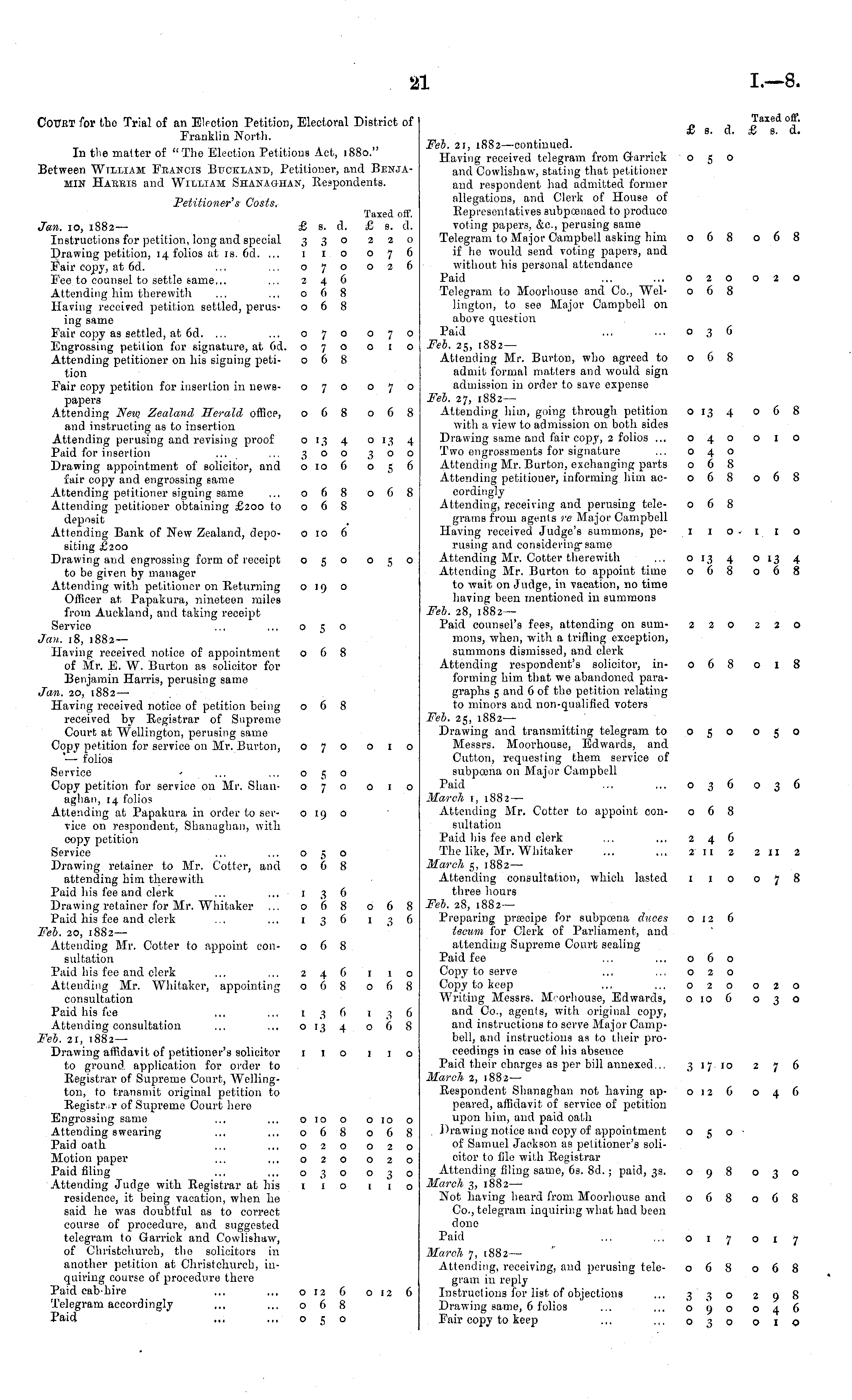 Court for the Trial of an Election Petition, Electoral District of Franklin North. In the matter of "The Election Petitions Act, 1880." Between William Francis Buckland, Petitioner, and Benjamin Harris and William Shanaohan, Respondents. Petitioner's Costs. Taxed off. Jan. 10, 1882—■ £ s. d. £ s. d. Instructions for petition, long and special 330 220 Drawing petition, 14 folios at is. 6d. ... 1 1 o o 7 6 Fair copy, at 6d. ... ... 070 026 Fee to counsel to settle same... ... 246 Attending him therewith ... ... 068 Having received petition settled, perus- 068 ing same Fair copy as settled, at 6d. ... ... 070 070 Engrossing petition for signature, at 6d. 070 010 Attending petitioner on his signing peti- 068 tion Eair copy petition for insertion in news- 070 070 papers Attending Neio Zealand Herald office, 068 068 and instructing as to insertion Attending perusing and revising proof 013 4 013 4 Paid for insertion ... ... 300 300 Drawing appointment of solicitor, and 010 6 056 fair copy and engrossing same Attending petitioner signing same ... 068 068 Attending petitioner obtaining £200 to 068 deposit Attending Bank of New Zealand, depo- 0106 siting £200 Drawing and engrossing form of receipt 050 050 to be given by manager Attending with petitioner on Returning oig o Officer at Papakura, nineteen miles from Auckland, and taking receipt Service ... ... 050 Jan. 18, 1882— Having received notice of appointment 068 of Mr. E. W. Burton as solicitor for Benjamin Harris, perusing same Jan. 20, 1882 — Having received notice of petition being 068 received by Registrar of Supremo Court at Wellington, perusing same Copy petition for service on Mr. Burton, 070 010 ' — folios Service ... ... 050 Copy petition for service on Mr. Shan- 070 010 aghan, 14 folios Attending at Papakura in order to ser- oig o vice on respondent, Shanoghan, with copy petition Service ... ... o^o Drawing retainer to Mr. Cotter, and 068 attending him therewith Paid his fee amd clerk ... ... 1 36 Drawing retainer for Mr. Whitaker ... o (1 8 068 Paid his fee and clerk ... ..,136136 Feb. 20, 1882— Attending Mr. Cotter to appoint con- 068 sulfation Paid his fee and clerk ... ... 246 1 1 o Attending Mr. Whitaker, appointing 068 068 consultation Paid his fee ... ...136136 Attending consultation ... ... 013 4 068 Feb. 21, 1882— Drawing affidavit of petitioner's solicitor 1 1 o 1 1 o to ground, application for order to Registrar of Supreme Court, Wellington, to transmit original petition to Registrar of Supreme Court here Engrossing same ... ... 0100 o_o o Attending swearing ... ~,068068 Paid oath ... ~,020020 Motion paper ... ~. 020 020 Paid filing ... ... 030 030 Attending Judge with Eegistrar at his 1 1 o 1 i o residence, it being vacation, when he said he was doubtful as to correct course of procedure, and suggested telegram to Garrick and Cowlishaw, of Christchurch, the solicitors in another petition at Christchurch, inquiring course of procedure there Paid cab-hire ... ... 012 6 012 6 Telegram accordingly ... ... 068 Paid ... ... 050