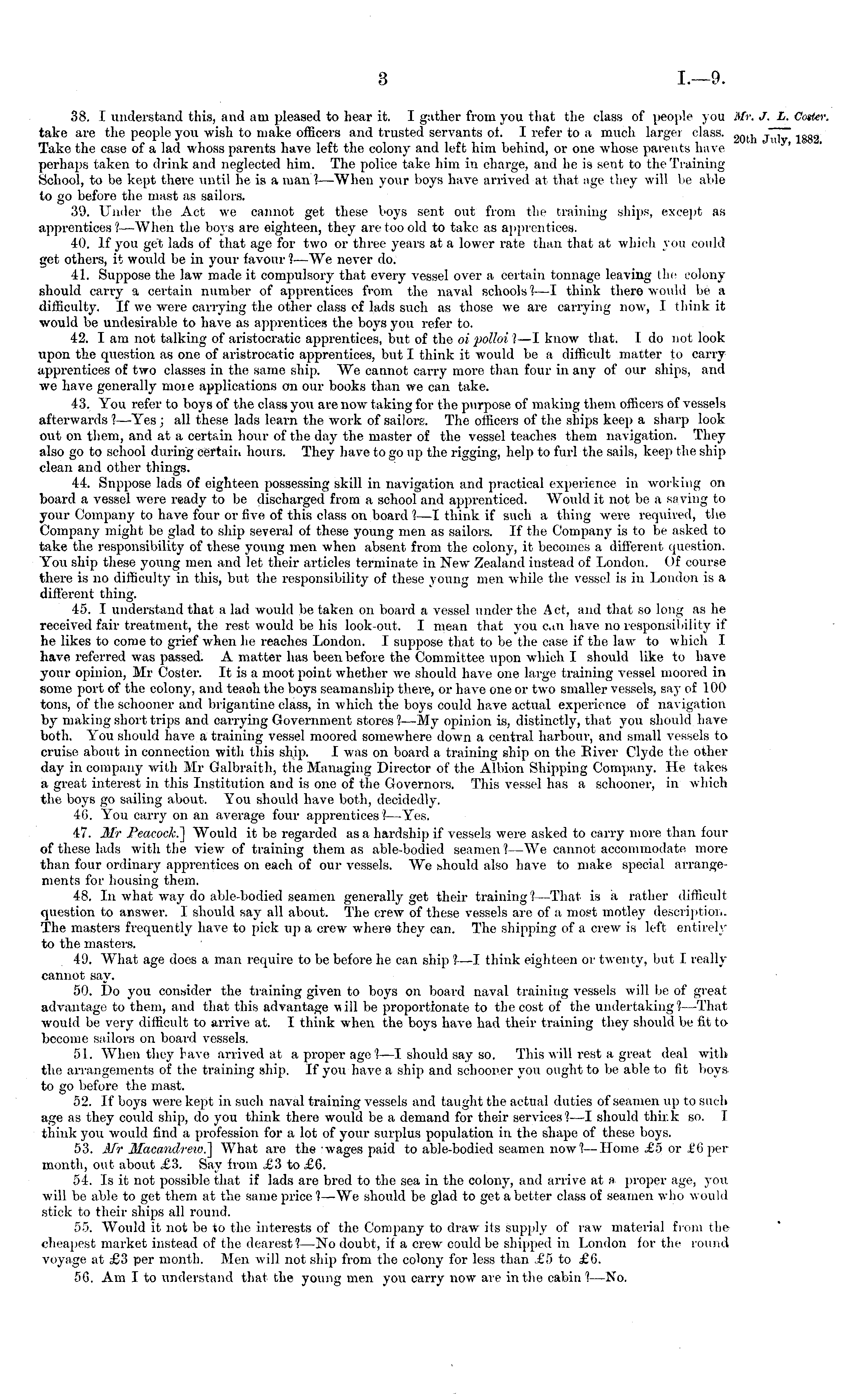 38. I understand this, and am pleased to hear it. I gather from you that the class of people you take are the people you wish to make officers and trusted servants oi. I refer to a much larger class. Take the case of a lad whoss parents have left the colony and left him behind, or one whose parents have perhaps taken to drink and neglected him. The police take him in charge, and he is sent to the Training School, to be kept there until he is a man ?—When your boys have arrived at that nge they will be able to go before the mast as sailors. 39. Under the Act we cannot get these boys sent out from the training ships, except as apprentices ?—When the boys are eighteen, they are too old to take as apprentices. 40. If you get lads of that age for two or three years at a lower rate than that at which you could get others, it would be in your favour ?—We never do. 41. Suppose the law made it compulsory that every vessel over a certain tonnage leaving thfj uolony should carry a certain number of apprentices from the naval schools ?—I think there would be a difficulty. If we were carrying the other class of lads such as those we are carrying now, I think it would be undesirable to have as apprentices the boys you refer to. 42. lam not talking of aristocratic apprentices, but of the oi polloi ] —I know that. Ido not look upon the question as one of aristrocatic apprentices, but I think it would be a difficult matter to carry apprentices of two classes in the same ship. We cannot carry more than four in any of our ships, and we have generally moie applications on our books than we can take. 43. You refer to boys of the class you are now taking for the purpose of making them officers of vessels afterwards ?—Yes ; all these lads learn the work of sailors. The officers of the ships keep a sharp look out on them, and at a certain hour of the day the master of the vessel teaches them navigation. They also go to school during certain hours. They have to go up the rigging, help to furl the sails, keep the ship clean and other things. 44. Snppose lads of eighteen possessing skill in navigation and practical experience in working on board a vessel were ready to be discharged from a school and apprenticed. Woulc| it not be a saving to your Company to have four or five of this class on board ?—I think if such a thing were required, the Company might be glad to ship several of these young men as sailors. If the Company is to be asked to take the responsibility of these young men when absent from the colony, it becomes a different question. You ship these young men and let their articles terminate in New Zealand instead of London. Of course there is no difficulty in this, but the responsibility of these young men while the vessel is in London is a different thing. 45. I understand that a lad would betaken on board a vessel under the Act, and that so long as he received fair treatment, the rest would be his look-out. I mean that you cm have no responsibility if he likes to come to grief when he reaches London. I suppose that to be the case if the law to which I have referred was passed. A matter has been before the Committee upon which I should like to have your opinion, Mr Coster. It is a moot point whether we should have one largo training vessel moored in some port of the colony, and teaoh the boys seamanship there, or have one or two smaller vessels, say of 100 tons, of the schooner and brigantine class, in which the boys could have actual experience of navigation by making short trips and carrying Government stores?—My opinion is, distinctly, that you should hare both. You should have a training vessel moored somewhere down a central harbour, and small vessels to cruise about in connection with this ship. I was on board a training ship on the Eiver Clyde the other day in company with Mr Galbraith, the Managing Director of the Albion Shipping Company. He takes a great interest in this Institution and is one of the Governors. This vessel has a schooner, in which the boys go sailing about. You should have both, decidedly. 46. You carry on an average four apprentices?— Yes. 47. Mr Peacock.} Would it be regarded as a hardship if vessels were asked to carry more than four of these lads with the view of training them as able-bodied seamen ?—We cannot accommodate more than four ordinary apprentices on each of our vessels. We should also have to make special arrangements for housing them. 48. In what way do able-bodied seamen generally get their training?— That is a rather difficult question to answer. I should say all about. The crew of these vessels are of a most motley description. The masters frequently have to pick up a crew where they can. The shipping of a crew is left entirely to the masters. 49. What age does a man require to be before he can ship I —l think eighteen or twenty, but I really cannot say. 50. Do you consider the training given to boys on board naval training vessels will be of great advantage to them, and that this advantage ■will be proportionate to the cost of the undertaking?— That would be very difficult to arrive at. I think when the boys have had their training they should be fit to become sailors on board vessels. 51. When they have arrived at a proper age ?—I should say so. This will rest a great deal with the arrangements of the training ship. If you have a ship and schooner you ought to be able to fit boys to go before the mast. 52. If boys were kept in such naval training vessels and taught the actual duties of seamen up to such age as they could ship, do you think there would be a demand for their services?—l should thir.k so. T think you would find a profession for a lot of your surplus population in the shape of these boys. 53. Mr Macandrew.} What are the wages paid to able-bodied seamen now?— Home £5 or £6 per month, out about £3. Say from £3 to £6. 54. Is it not possible that if lads are bred to the sea in the colony, and arrive at a prope