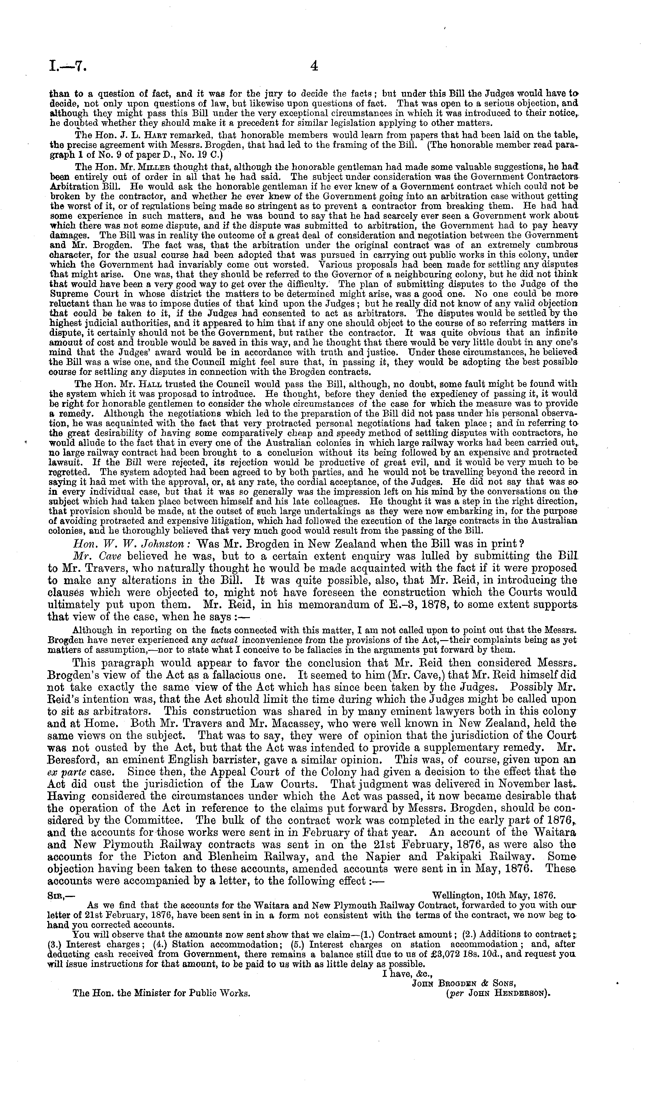 than to a question of fact, and it was for the jury to decide the facts ; but under this Bill the Judges would have to decide, not only upon questions of law, but likewise upon questions of fact. That was open to a serious objection, and although they might pass this Bill under the very exceptional circumstances in which it was introduced to their notice,, he doubted whether they should make it a precedent for similar legislation applying to other matters. The Hon. J. L. Hart remarked, that honorable members would learn from papers that had been laid on the table, the precise agreement with Messrs. Brogden, that had led to the framing of the Bill. (The honorable member read paragraph 1 of No. 9 of paper D., No. 19 C.) The Hon. Mr. Miller thought that, although the honorable gentleman had made some valuable suggestions, he had been entirely out of order in all that he had said. The subject under consideration was the Government Contractors Arbitration Bill. He would ask the honorable gentleman if he ever knew of a Government contract which could not be broken by the contractor, and whether he ever knew of the Government going into an arbitration case without getting the worst of it, or of regulations being made so stringent as to prevent a contractor from breaking them. He had had some experience in such matters, and he was bound to say that he had scarcely ever seen a Government work about which there was not some dispute, and if the dispute was submitted to arbitration, the Government had to pay heavy damages. The Bill was in reality the outcome of a great deal of consideration and negotiation between the Government and Mr. Brogden. The fact was, that the arbitration under the original contract was of an extremely cumbrous oharacter, for the usual course had been adopted that was pursued in carrying out public works in this colony, under which the Government had invariably come out worsted. Various proposals had been made for settling any disputes that might arise. One was, that they should be referred to the Governor of a neighbouring colony, but he did not think that would have been a very good way to get over the difficulty. The plan of submitting disputes to the Judge of the Supreme Court in whose district the matters to be determined might arise, was a good one. No one could be more reluctant than he was to impose duties of that kind upon the Judges ; but he really did not know of any valid objection that could be taken to it, if the Judges had consented to act as arbitrators. The disputes would be settled by the highest judicial authorities, and it appeared to him that if any one should object to the course of so referring matters in dispute, it certainly should not be the Government, but rather the contractor. It was quite obvious that an infinite amount of cost and trouble would be saved in this way, and he thought that there would be very little doubt in any one's mind that the Judges' award would be in accordance with truth and justice. Under these circumstances, he believed the Bill was a wise one, and the Council might feel sure that, in passing it, they would be adopting the best possible course for settling any disputes in connection with the Brogden contracts. The Hon. Mr. Hall trusted the Council would pass the Bill, although, no doubt, some fault might be found with the system which it was proposad to introduce. He thought, before they denied the expediency of passing it, it would be right for honorable gentlemen to consider the whole circumstances of the case for which the measure was to provide a remedy. Although the negotiations which led to the preparation of the Bill did not pass under his personal observation, he was acquainted with the fact that very protracted personal negotiations had taken place; and in referring tothe great desirability of having some comparatively cheap and speedy method of settling disputes with contractors, he would allude to the fact that in every one of the Australian colonies in which large railway works had been carried out,, no large railway contract had been brought to a conclusion without its being followed by an expensive and protracted lawsuit. If the Bill were rejected, its rejection would be productive of great evil, and it would be very much to be regretted. The system adopted had been agreed to by both parties, and he would not be travelling beyond the record in saying it had met with the approval, or, at any rate, the cordial acceptance, of the Judges. He did not say that was so» in every individual case, but that it was so generally was the impression left on his mind by the conversations on th» subject which had taken place between himself and his late colleagues. He thought it was a step in the right direction, that provision should be made, at the outset of such large undertakings as they were now embarking in, for the purpose of avoiding protracted and expensive litigation, which had followed the execution of the large contracts in the Australian colonies, and he thoroughly believed that very much good would result from the passing of the Bill. Hon. W. W. Johnston : Was Mr. Brogden in New Zealand when the Bill was in print? Mr. Cave believed he was, but to a certain extent enquiry was lulled by submitting the Bill to Mr. Travers, who naturally thought he would be made acquainted with the fact if it were proposed to make any alterations in the Bill. It was quite possible, also, that Mr. Eeid, in introducing the clauses which were objected to, might not have foreseen the construction which the Courts would ultimately put upon them. Mr. Eeid, in his memorandum of E.-3, 1878, to some extent supportsthat view of the case, when he says :— Although in reporting on the facts connected with this matter, I am not called upon to point out that the Messrs. Brogden have never experienced any actual inconvenience from the provisions of the Act, —their complaints being as yet matters of assumption,—nor to state what I conceive 