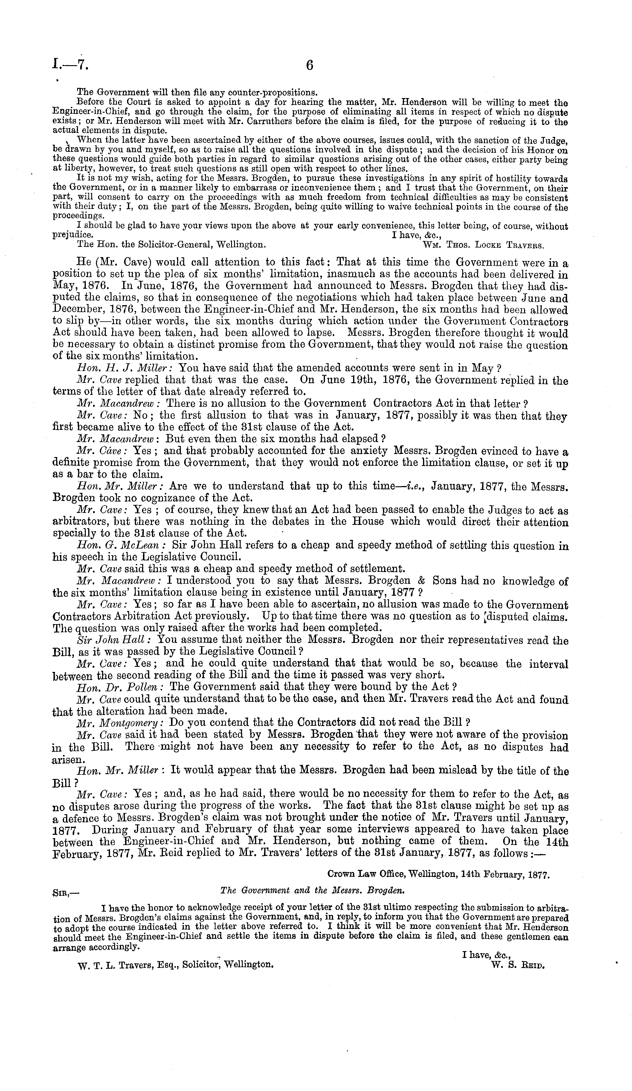 The Government will then file any counter-propositions. Before the Court is asked to appoint a day for hearing the matter, Mr. Henderson will be willing to meet the Engineer-in-Chief, and go through the claim, for the purpose of eliminating all items in respect of which no dispute exists ; or Mr. Henderson will meet with Mr. Carruthers before the claim is filed, for the purpose of reducing it to the actual elements in dispute. , "When the latter have been ascertained by either of the above courses, issues could, with the sanction of the Judge, be drawn by you and myself, so as to raise all the questions involved in the dispute ; and the decision of his Honor on these questions would guide both parties in regard to similar questions arising out of the other cases, either party being at liberty, however, to treat such questions as still open with respect to other lines. It is not my wish, acting for the Messrs. Brogden, to pursue these investigations in any spirit of hostility towards the Government, or in a manner likely to embarrass or inconvenience them ; and I trust that the Government, on their part, will consent to carry on the proceedings with as much freedom from technical difficulties as may be consistent with their duty ; I, on the part of the Messrs. Brogden, being quite willing to waive technical points in the course of the proceedings. I should be glad to have your views upon the above at your early convenience, this letter being, of course, without prejudice. I have, &c, The Hon. the Solicitor-General, Wellington. Wm. Thos. Locke Tbavebs. He (Mr. Cave) would call attention to this fact: That at this time the Government were in a position to set up the plea of six months' limitation, inasmuch as the accounts had been delivered in May, 1876. In June, 1876, the Government had announced to Messrs. Brogden that they had disputed the claims, so that in consequence of the negotiations which had taken place between June and December, 1876, between the Engineer-in-Chief and Mr. Henderson, the six months had been allowed to slip by—in other words, the six months during which action under the Government Contractors Act should have been taken, had been allowed to lapse. Messrs. Brogden therefore thought it would be necessary to obtain a distinct promise from the Government, that they would not raise the question of the six months' limitation. Hon. H. J. Miller: You have said that the amended accounts were sent in in May ? Mr. Cave replied that that was the case. On June 19th, 1876, the Government replied in the terms of the letter of that date already referred to. Mr. Macandrew : There is no allusion to the Government Contractors Act in that letter ? Mr. Gave: No; the first allusion to that was in January, 1877, possibly it was then that they first became alive to the effect of the 31st clause of the Act. Mr. Macandrew : But even then the six months had elapsed ? Mr. Cave: Yes ; and that probably accounted for the anxiety Messrs. Brogden evinced to have a definite promise from the Government, that they would not enforce the limitation clause, or set it up as a bar to the claim. Hon. Mr. Miller: Are we to understand that up to this time— i.e., January, 1877, the Messrs. Brogden took no cognizance of the Act. Mr. Cave: Yes ; of course, they knew that an Act had been passed to enable the Judges to act as arbitrators, but there was nothing in the debates in the House which would direct their attention specially to the 31st clause of the Act. Hon. O. McLean : Sir John Hall refers to a cheap and speedy method of settling this question in his speech in the Legislative Council. Mr. Cave said this was a cheap and speedy method of settlement. Mr. Macandrew : I understood you to say that Messrs. Brogden & Sons had no knowledge of the six months' limitation clause being in existence until January, 1877 ? Mr. Cave: Yes ;so far as I have been able to ascertain, no allusion was made to the Government Contractors Arbitration Act previously. Up to that time there was no question as to [disputed claims. The question was only raised after the works had been completed. Sir John Hall: You assume that neither the Messrs. Brogden nor their representatives read the Bill, as it was passed by the Legislative Council ? Mr. Cave: Yes; and he could quite understand that that would be so, because the interval between the second reading of the Bill and the time it passed was very short. Hon. Dr. Pollen : The Government said that they were bound by the Act ? Mr. Cave could quite understand that to be the case, and then Mr. Travers read the Act and found that the alteration had been made. Mr. Montgomery: Do you contend that the Contractors did not read the Bill ? Mr. Cave said it had been stated by Messrs. Brogden that they were not aware of the provision in the Bill. There might not have been any necessity to refer to the Act, as no disputes had arisen. Hon. Mr. Miller : It would appear that the Messrs. Brogden had been mislead by the title of the Bill ? Mr. Cave: Yes ; and, as he had said, there would be no necessity for them to refer to the Act, as no disputes arose during the progress of the works. The fact that the 31st clause might be set up as a defence to Messrs. Brogden's claim was not brought under the notice of Mr. Travers until January, 1877. During January and February of that year some interviews appeared to have taken place between the Engineer-in-Chief and Mr. Henderson, but nothing came of them. On the 14th February, 1877, Mr. Eeid replied to Mr. Travers' letters of the 31st January, 1877, as follows:— Crown Law Office, WeUington, 14th February, 1877. g IE] The Government and the Messrs. Brogden. I have the honor to acknowledge receipt of your letter of the 31st ultimo respecting the submission to arbitration of Messrs. Brogden's claims against the Government, and, in reply, to inform you that the Government are prepared to adopt the course indicated in the letter above referred to. I think it wil