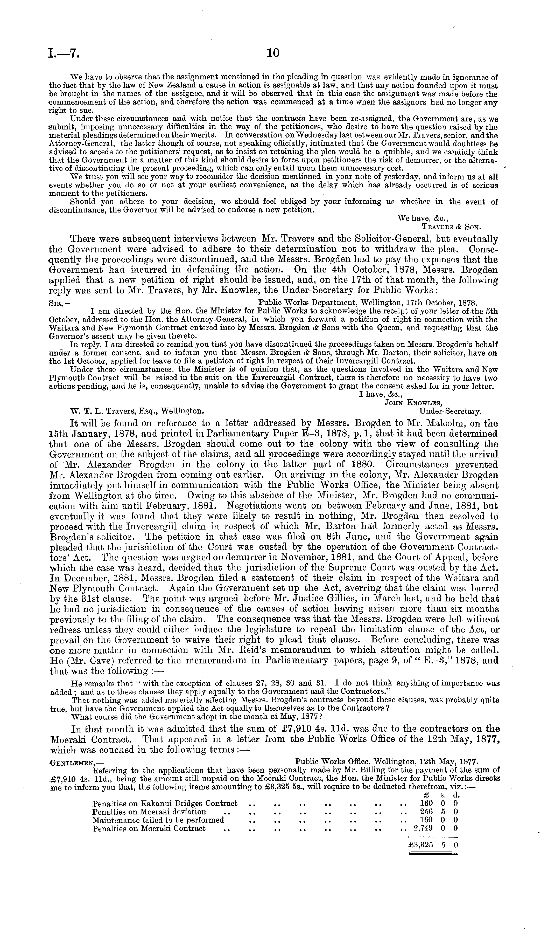 We have to observe that the assignment mentioned in the pleading in question was evidently made in ignorance of the fact that by the law of New Zealand a cause in action is assignable at law, and that any action founded upon it must be brought in the names of the assignee, and it will be observed that in this case the assignment was" made before the commencement of the action, and therefore the action was commenced at a time when the assignors had no longer any right to sue. Under these circumstances and with notice that the contracts have been re-assigned, the Government are, as we submit, imposing unnecessary difficulties in the way of the petitioners, who desire to have the question raised by the material pleadings determined on their merits. In conversation on Wednesday last between our Mr. Travers, senior, and the Attorney-General, the latter though of course, not speaking officially, intimated that the Government would doubtless be advised to accede to the petitioners' request, as to insist on retaining the plea would be a quibble, and we candidly think that the Government in a matter of this kind should desire to force upon petitioners the risk of demurrer, or the alternative of discontinuing the present proceeding, which can only entail upon them unnecessary cost. We trust you will see your way to reconsider the decision mentioned in your note of yesterday, and inform us at all events whether you do so or not at your earliest convenience, as the delay which has already occurred is of serious moment to the petitioners. Should you adhere to your decision, we should feel obliged by your informing us whether in the event of discontinuance, the Governor will be advised to endorse a new petition. We have, &a., Tbaveks & Son. There were subsequent interviews between Mr. Travers and the Solicitor-General, but eventually the Government were advised to adhere to their determination not to withdraw the plea. Consequently the proceedings were discontinued, and the Messrs. Brogden had to pay the expenses that the Government had incurred in defending the action. On the 4th October, 1878, Messrs. Brogden applied that a new petition of right should be issued, and, on the 17th of that month, the following reply was sent to Mr. Travers, by Mr. Knowles, the Under-Secretary for Public Works:— Sib, - Public Works Department, Wellington, 17th October, 1878. I am directed by the Hon. the Minister for Public Works to acknowledge the receipt of your letter of the sth October, addressed to the Hon. the Attorney-General, in which you forward a petition of right in connection with the Waitara and New Plymouth Contract entered into by Messrs. Brogden & Sons with the Queen, and requesting that the Governor's assent may be given thereto. In reply, I am directed to remind you that you have discontinued the proceedings taken on Messrs. Brogden's behalf under a former consent, and to inform you that Messrs. Brogden & Sons, through Mr. Barton, their solicitor, have on the Ist October, applied for leave to file a petition of right in respect of their Invercargill Contract. Under these circumstances, the Minister is of opinion that, as the questions involved in the Waitara and New Plymouth Contract will be raised in the suit on the Invercargill Contract, there is therefore no necessity to have two actions pending, and he is, consequently, unable to advise the Government to grant the consent asked for in your letter. I have, &c, John Knowles, W. T. L. Travers, Esq., Wellington. Under-Secretary. It will be found on reference to a letter addressed by Messrs. Brogden to Mr. Malcolm, on the 15th January, 1878, and printed in Parliamentary Paper E-3, 1878, p. 1, that it had been determined that one of the Messrs. Brogden should come out to the colony with the view of consulting the Government on the subject of the claims, and all proceedings were accordingly stayed until the arrival of Mr. Alexander Brogden in the colony in the latter part of 1880. Circumstances prevented Mr. Alexander Brogden from coming out earlier. On arriving in the colony, Mr. Alexander Brogden immediately put himself in communication with the Public Works Office, the Minister being absent from Wellington at the time. Owing to this absence of the Minister, Mr. Brogden had no communication with him until February, 1881. Negotiations went on between February and June, 1881, but eventually it was found that they were likely to result in nothing, Mr. Brogden then resolved to proceed with the Invercargill claim in respect of which Mr. Barton had formerly acted as Messrs. Brogden's solicitor. The petition in that case was filed on Bth June, and the Government again pleaded that the jurisdiction of the Court was ousted by the operation of the Government Contracttors' Act. The question was argued on demurrer in November, 1881, and the Court of Appeal, before which the case was heard, decided that the jurisdiction of the Supreme Court was ousted by the Act. In December, 1881, Messrs. Brogden filed a statement of their claim in respect of the Waitara and New Plymouth Contract. Again the Government set up the Act, averring that the claim was barred by the 31st clause. The point was argued before Mr. Justice Gillies, in March last, and he held that lie had no jurisdiction in consequence of the causes of action having arisen more than six months previously to the filing of the claim. The consequence was that the Messrs. Brogden were left without redress unless they could either induce the legislature to repeal the limitation clause of the Act, or prevail on the Government to waive their right to plead that clause. Before concluding, there was one more matter in connection with Mr. Eeid's memorandum to which attention might be called. He (Mr. Cave) referred to the memorandum in Parliamentary papers, page 9, of " E.-3," 1878, and that was the following : — He remarks that " with the exception of clauses 27, 28, 30 and 31. I do not think anything of importance w