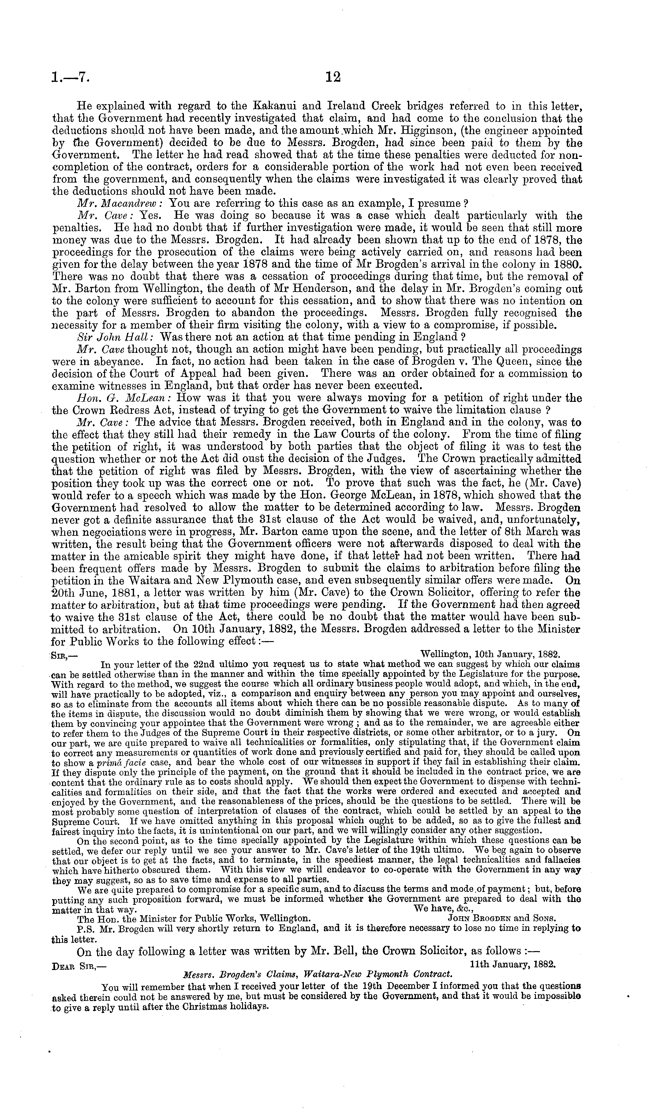 He explained with regard to the Kakanui and Ireland Creek bridges referred to in tins letter, that the Government had recently investigated that claim, and had come to the conclusion that the deductions should not have been made, and the amount which Mr. Higginson, (the engineer appointed by {he Government) decided to be due to Messrs. Brogden, had since been paid to them by the Government. The letter he had read showed that at the time these penalties were deducted for noncompletion of the contract, orders for a considerable portion of the work had not even been received from the government, and consequently when the claims were investigated it was clearly proved that the deductions should not have been made. Mr. Macandrew : You are referring to this case as an example, I presume ? Mr. Cave: Yes. He was doing so because it was a case which dealt particularly with the penalties. He had no doubt that if further investigation were made, it would be seen that still more money was due to the Messrs. Brogden. It had already been shown that up to the end of 1878, the proceedings for the prosecution of the claims were being actively carried on, and reasons had been given for the delay between the year 1878 and the time of Mr Brogden's arrival in the colony in 1880. There was no doubt that there was a cessation of proceedings during that time, but the removal of Mr. Barton from Wellington, the death of Mr Henderson, and the delay in Mr. Brogden's coming out to the colony were sufficient to account for this cessation, and to show that there was no intention on the part of Messrs. Brogden to abandon the proceedings. Messrs. Brogden fully recognised the necessity for a member of their firm visiting the colony, with a view to a compromise, if possible. Sir John Hall: Was there not an action at that time pending in England ? Mr. Cave thought not, though an action might have been pending, but practically all proceedings were in abeyance. In fact, no action had been taken in the case of Brogden v. The Queen, since the decision of the Court of Appeal had been given. There was an order obtained for a commission to examine witnesses in England, but that order has never been executed. Hon. G. McLean: How was it that you were always moving for a petition of right under the the Crown Eedress Act, instead of trying to get the Government to waive the limitation clause ? Mr. Cave: The advice that Messrs. Brogden received, both in England and in the colony, was to the effect that they still had their remedy in the Law Courts of the colony. From the time of filing the petition of right, it was understood by both parties that the object of filing it was to test the question whether or not the Act did oust the decision of the Judges. The Crown practically admitted that the petition of right was filed by Messrs. Brogden, with the view of ascertaining whether the position they took up was the correct one or not. To prove that such was the fact, he (Mr. Cave) would refer to a speech which was made by the Hon. George McLean, in 1878, which showed that the Government had resolved to allow the matter to be determined according to law. Messrs. Brogden never got a definite assurance that the 31st clause of the Act would be waived, and, unfortunately, when negociations were in progress, Mr. Barton came upon the scene, and the letter of Bth March was written, the result being that the Government officers were not afterwards disposed to deal with the matter in the amicable spirit they might have done, if that letter had not been written. There had been frequent offers made by Messrs. Brogden to submit the claims to arbitration before filing the petition in the Waitara and New Plymouth case, and even subsequently similar offers were made. On 20th June, 1881, a letter was written by him (Mr. Cave) to the Crown Solicitor, offering to refer the matter to arbitration, but at that time proceedings were pending. If the Government had then agreed to waive the 31st clause of the Act, there could be no doubt that the matter would have been submitted to arbitration. On 10th January, 1882, the Messrs. Brogden addressed a letter to the Minister for Public Works to the following effect: — g IB) Wellington, 10th January, 1882. In your letter of the 22nd ultimo you request us to state what method we can suggest by which our claims can be settled otherwise than in the manner and within the time specially appointed by the Legislature for the purpose. With regard to the method, we suggest the course which all ordinary business people would adopt, and which, in the end, will have practically to be adopted, viz., a comparison and enquiry between any person you may appoint and ourselves, so as to eliminate from the accounts all items about which there can be no possible reasonable dispute. As to many of the items in dispute, the discussion would no doubt diminish them by showing that we were wrong, or would establish them by convincing your appointee that the Government were wrong ; and as to the remainder, we are agreeable either to refer them to the Judges of the Supreme Court in their respective districts, or some other arbitrator, or to a jury. On our part, we are quite prepared to waive all technicalities or formalities, only stipulating that, if the Government claim to correct any measurements or quantities of work done and previously certified and paid for, they should be called upon to show a primd facie case, and bear the whole cost of our witnesses in support if they fail in establishing their claim. If they dispute only the principle of the payment, on the ground that it should be included in the contract price, we are content that the ordinary rule as to costs should apply. We should then expect the Government to dispense with technicalities and formalities on their side, and that the fact that the works were ordered and executed and accepted and enjoyed by the Government, and the reasonableness of the prices, should be the questions
