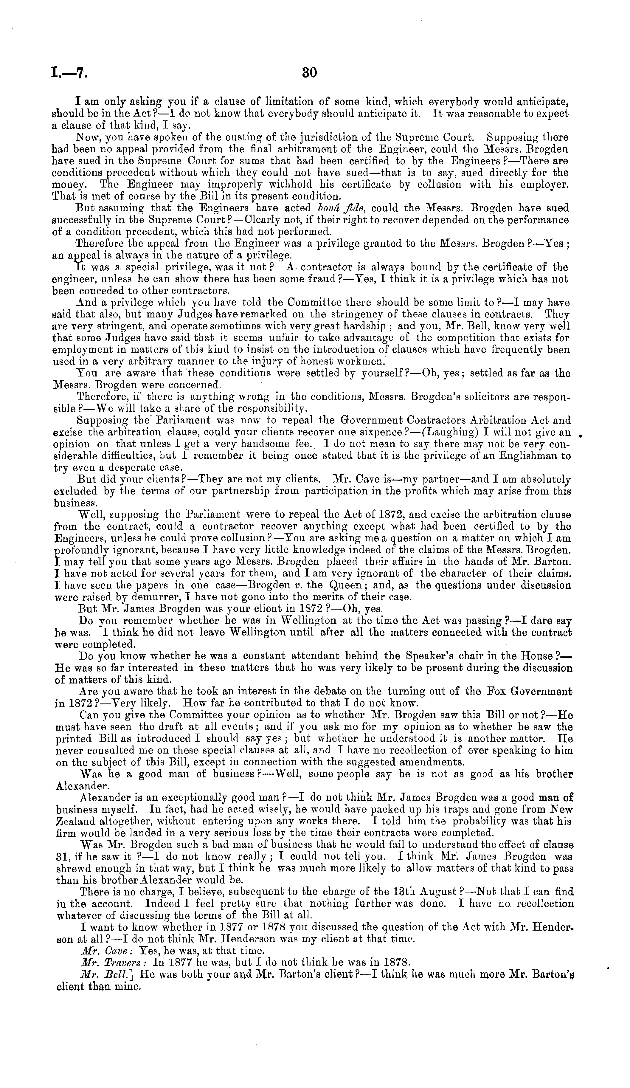 I am only asking you if a clause of limitation of some kind, which everybody would anticipate, should be in the Act?—l do not know that everybody should anticipate it. It was reasonable to expect a clause of that kind, I say. Now, you have spoken of the ousting of the jurisdiction of the Supreme Court. Supposing there had been no appeal provided from the final arbitrament of the Engineer, could the Messrs. Brogden have sued in the Supreme Court for sums that had been certified to by the Engineers ?—There are conditions precedent without which they could not have sued —-that is to say, sued directly for the money. The Engineer may improperly withhold his certificate by collusion with his employer. That is met of course by the Bill in its present condition. But assuming that the Engineers have acted iond fide, could the Messrs. Brogden have sued successfully in the Supreme Court ? —Clearly not, if their right to recover depended on the performance of a condition precedent, which this had not performed. Therefore the appeal from the Engineer was a privilege granted to the Messrs. Brogden ?—Tes ; an appeal is always in the nature of a privilege. It was a special privilege, was it not ? A contractor is always bound by the certificate of the engineer, unless he can show there has been some fraud ? —Tes, I think it is a privilege which has not been conceded to other contractors. And a privilege which you have told the Committee there should bo some limit to ?—I may have said that also, but many Judges have remarked on the stringency of these clauses in contracts. They are very stringent, and operate sometimes with very great hardship ; and you, Mr. Bell, know very well that some Judges have said that it seems unfair to take advantage of the competition that exists for employment in matters of this kind to insist on the introduction of clauses which have frequently been used in a very arbitrary manner to the injury of honest workmen. You are aware that these conditions were settled by yourself?—Oh, yes; settled as far as the Messrs. Brogden were concerned. Therefore, if there is anything wrong in the conditions, Messrs. Brogden's solicitors are responsible ?—We will take a share of the responsibility. Supposing the Parliament was now to repeal the Government Contractors Arbitration Act and excise the arbitration clause, could your clients recover one sixpence?—(Laughing) I will not give an opinion on that unless I get a very handsome fee. Ido not mean to say there may not be very considerable difficulties, but I remember it being once stated that it is the privilege of an Englishman to try even a desperate case. But did your clients? —They are not my clients. Mr. Cave is—my partner —and lam absolutely excluded by the terms of our partnership from participation in the profits which may arise from this business. Well, supposing the Parliament were to repeal the Act of 1872, and excise the arbitration clause from the contract, could a contractor recover anything except what had been certified to by the Engineers, unless he could prove collusion? —Tou are asking me a question on a matter on which I am profoundly ignorant, because I have very little knowledge indeed of the claims of the Messrs. Brogden. I may tell you that some years ago Messrs. Brogden placed their affairs in the hands of Mr. Barton. I have not acted for several years for them, and lam very ignorant of the character of their claims. I have seen the papers in one case—Brogden v. the Queen; and, as the questions under discussion were raised by demurrer, I have not gone into the merits of their case. But Mr. James Brogden was your client in 1872 ? —Oh, yes. Do vou remember whether he was in Wellington at the time the Act was passing ?—I dare say he was. I think he did not leave Wellington until after all the matters connected with the contract were completed. Do you know whether he was a constant attendant behind the Speaker's chair in the House ?— He was so far interested in these matters that he was very likely to be present during the discussion of matters of this kind. Are you aware that ho took an interest in the debate on the turning out of the Pox Government in 1872 ? —Very likely. How far he contributed to that Ido not know. Can you give the Committee your opinion as to whether Mr. Brogden saw this Bill or not ?—He must have seen the draft at all events; and if you ask me for my opinion as to whether he saw the printed Bill as introduced I should say yes ; but whether he understood it is another matter. He never consulted me on these special clauses at all, and I have no recollection of ever speaking to him on the subject of this Bill, except in connection with the suggested amendments. Was he a good man of business ? —Well, some people say he is not as good as his brother Alexander. Alexander is an exceptionally good man ? —I do not think Mr. James Brogden was a good man of business myself. In fact, had he acted wisely, he would have packed up his traps and gone from New Zealand altogether, without entering upon any works there. I told him the probability was that his firm would be landed in a very serious loss by the time their contracts were completed. Was Mr. Brogden such a bad man of business that he would fail to understand the effect of clause 31, if he saw it ?—I do not know really ; I could not tell you. I think Mr. James Brogden was shrewd enough in that way, but I think he was much more likely to allow matters of that kind to pass than his brother Alexander would be. There is no charge, I believe, subsequent to the charge of the 13th August ? —Not that I can find in the account. Indeed I feel pretty sure that nothing further was done. I have no recollection whatever of discussing the terms of the Bill at all. I want to know whether in 1877 or 1878 you discussed the question of the Act with Mr. Henderson at all ? —I do not think Mr. Henderson was my client at that time