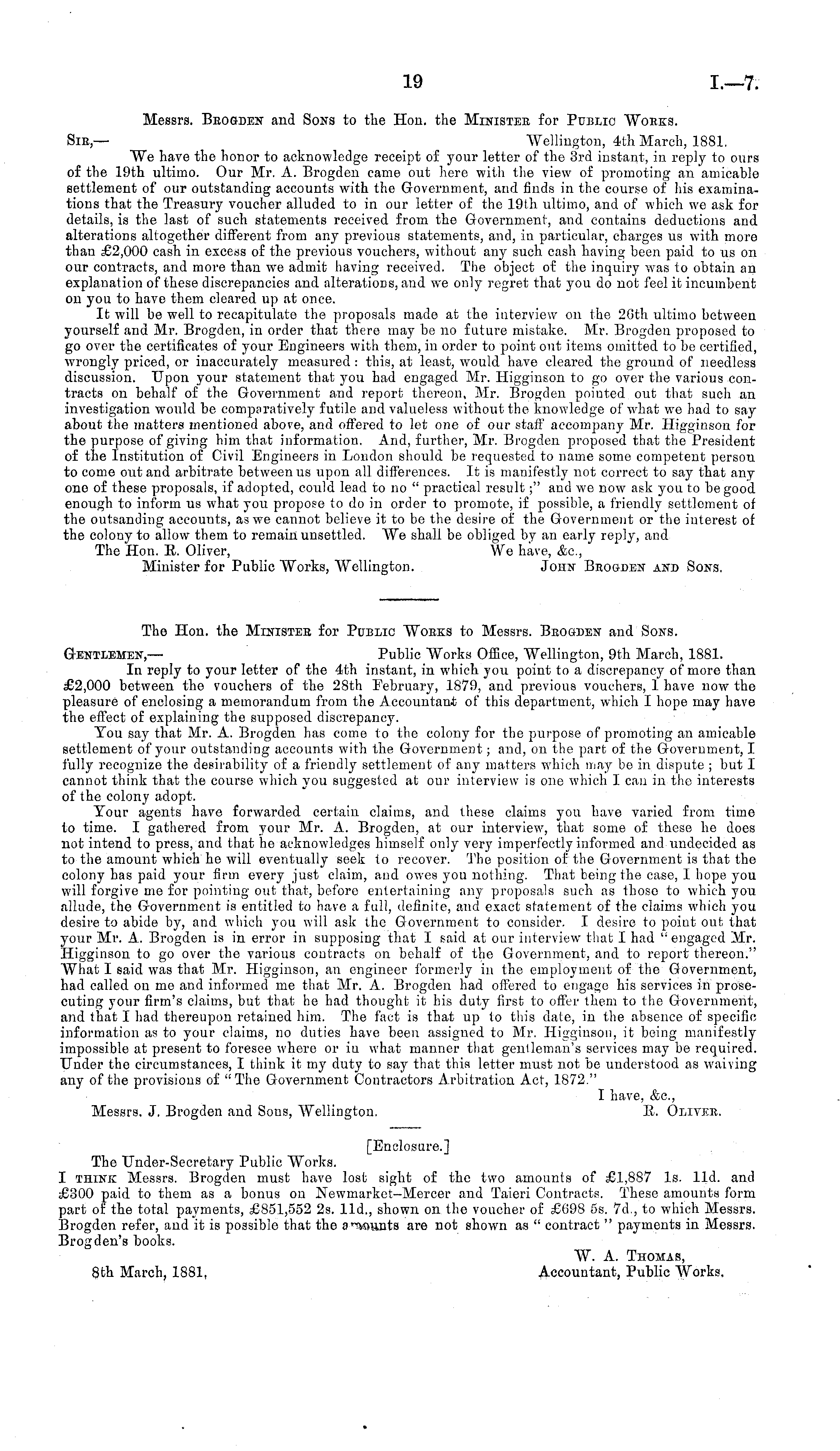 The Hon. the Minister for Public Wokks to Messrs. Beogden and Sons. Gentlemen, — Public "Works Office, Wellington, 9th March, 1881. In reply to your letter of the 4th instant, in which you point to a discrepancy of more than £2,000 between the vouchers of the 28th February, 1879, and previous vouchers, 1 have now the pleasure of enclosing a memorandum from the Accountant of this department, which I hope may have the effect of explaining the supposed discrepancy. Tou say that Mr. A. Brogden has come to the colony for the purpose of promoting an amicable settlement of your outstanding accounts with the Government; and, on the part of the Government, I fully recognize the desirability of a friendly settlement of any matters which may be in dispute ; but I cannot think that the course which you suggested at our interview is one which I can in the interests of the colony adopt. Your agents have forwarded certain claims, and these claims you have varied from time to time. I gathered from your Mr. A. Brogden, at our interview, that some of these he does not intend to press, and that he acknowledges himself only very imperfectly informed and undecided as to the amount which he will eventually seek to recover. The position of the Government is that the colony has paid your firm every just claim, and owes you nothing. That being the case, I hope you will forgive me for pointing out that, before entertaining any proposals such as those to which you allude, the Government is entitled to have a full, definite, and exact statement of the claims which you desire to abide by, and which you will ask the Government to consider. I desire to point out that your Mr. A. Brogden is in error in supposing that I said at our interview that I had '.' engaged Mr. Higginson to go over the various contracts on behalf of the Government, and to report thereon." What I said was that Mr. Higginson, an engineer formerly in the employment of the Government, had called on me and informed me that Mr. A. Brogden had offered to engage his services in prosecuting your firm's claims, but that he had thought it his duty first to offer them to the Government, and that I had thereupon retained him. The fact is that up to this date, in the absence of specific information as to your claims, no duties have been assigned to Mr. Higginson, it being manifestly impossible at present to foresee where or in what manner that gentleman's services may be required. Under the circumstances, I think it my duty to say that this letter must not be understood as waiving any of the provisions of "The Government Contractors Arbitration Act, 1872." I have, &c, Messrs. J. Brogden and Sous, Wellington. B. Oliver.