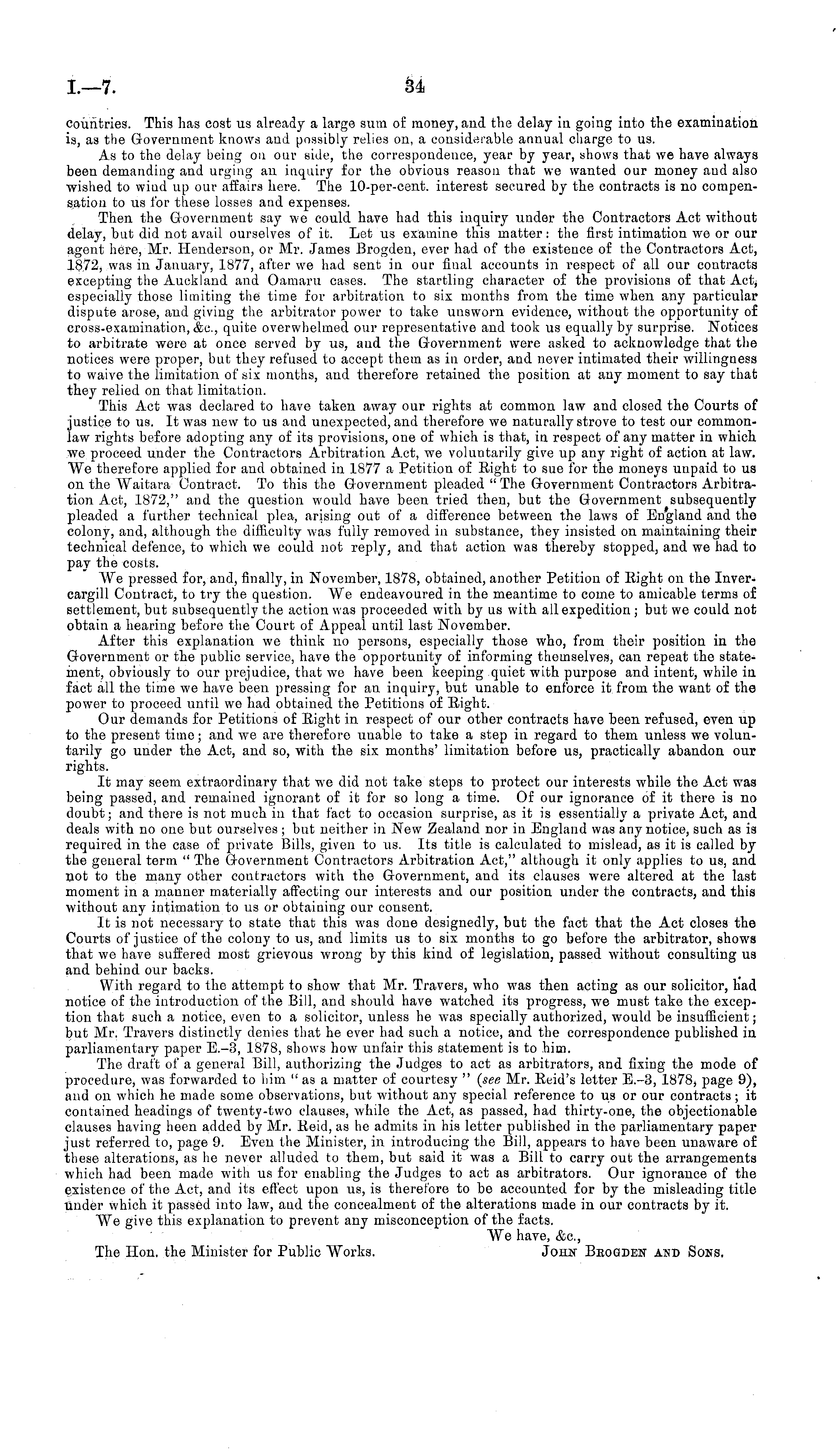 countries. This has cost us already a large sum of money, and the delay in going into the examination is, as the Government knows and possibly relies on, a considerable annual charge to us. As to the delay being on our side, the correspondence, year by year, shows that we have always been demanding and urging an inquiry for the obvious reason that we wanted our money and also wished to wind up our affairs here. The 10-per-cent. interest secured by the contracts is no compensation to us for these losses and expenses. Then the Government say we could have had this inquiry under the Contractors Act without delay, but did not avail ourselves of it. Let us examine this matter: the first intimation we or our agent here, Mr. Henderson, or Mr. James Brogden, ever had of the existence of the Contractors Act, 1872, was in January, 1877, after we had sent in our final accounts in respect of all our contracts excepting the Auckland and Oamaru cases. The startling character of the provisions of that Act, especially those limiting the time for arbitration to six months from the time when any particular dispute arose, and giving the arbitrator power to take unsworn evidence, without the opportunity of cross-examination, &c, quite overwhelmed our representative and took us equally by surprise. Notices to arbitrate were at once served by us, and the Government were asked to acknowledge that the notices were proper, but they refused to accept them as in order, and never intimated their willingness to waive the limitation of six months, and therefore retained the position at any moment to say that they relied on that limitation. This Act was declared to have taken away our rights at common law and closed the Courts of justice to us. It was new to us and unexpected, and therefore we naturally strove to test our commonlaw rights before adopting any of its provisions, one of which is that, in respect of any matter in which we proceed under the Contractors Arbitration Act, we voluntarily give up any right of action at law. We therefore applied for and obtained in 1877 a Petition of Eight to sue for the moneys unpaid to us on the Waitara Contract. To this the Government pleaded " The Government Contractors Arbitration Act, 1872," and the question would have been tried then, but the Government subsequently pleaded a further technical plea, arising out of a difference between the laws of England and the colony, and, although the difficulty was fully removed in substance, they insisted on maintaining their technical defence, to which we could not reply, and that action was thereby stopped, and we had to pay the costs. We pressed for, and, finally, in November, 1878, obtained, another Petition of Eight on the Invercargill Contract, to try the question. We endeavoured in the meantime to come to amicable terms of settlement, but subsequently the action was proceeded with by us with all expedition ; but we could not obtain a hearing before the Court of Appeal until last November. After this explanation we think no persons, especially those who, from their position in the Government or the public service, have the opportunity of informing themselves, can repeat the statement, obviously to our prejudice, that we have been keeping quiet with purpose and intent, while in fact all the time we have been pressing for an inquiry, but unable to enforce it from the want of the power to proceed until we had obtained the Petitions of Eight. Our demands for Petitions of Eight in respect of our other contracts have been refused, even up to the present time; and we are therefore unable to take a step in regard to them unless we voluntarily go under the Act, and so, with the six months' limitation before us, practically abandon our rights. It may seem extraordinary that we did not take steps to protect our interests while the Act was being passed, and remained ignorant of it for so long a time. Of our ignorance of it there is no doubt; and there is not much in that fact to occasion surprise, as it is essentially a private Act, and deals with no one but ourselves ; but neither in New Zealand nor in England was any notice, such as is required in the case of private Bills, given to us. Its title is calculated to mislead, as it is called by the general term " The Government Contractors Arbitration Act," although it only applies to us, and not to the many other contractors with the Government, and its clauses were altered at the last moment in a manner materially affecting our interests and our position under the contracts, and this without any intimation to us or obtaining our consent. It is not necessary to state that this was done designedly, but the fact that the Act closes the Courts of justice of the colony to us, and limits us to six months to go before the arbitrator, shows that we have suffered most grievous wrong by this kind of legislation, passed without consulting us and behind our backs. With regard to the attempt to show that Mr. Travers, who was then acting as our solicitor, had notice of the introduction of the Bill, and should have watched its progress, we must take the exception that such a notice, even to a solicitor, unless he was specially authorized, would be insufficient; but Mr. Travers distinctly denies that he ever had such a notice, and the correspondence published in parliamentary paper E.-3, 1878, shows how unfair this statement is to him. The draft of a general Bill, authorizing the Judges to act as arbitrators, and fixing the mode of procedure, was forwarded to him " as a matter of courtesy " (see Mr. Eeid's letter E.-3, 1878, page 9), and on which he made some observations, but without any special reference to us or our contracts; it contained headings of twenty-two clauses, while the Act, as passed, had thirty-one, the objectionable clauses having heen added by Mr. Eeid, as he admits in his letter published in the parliamentary paper just referred to, page 9. Even the Minister, in introducing the Bill, ap