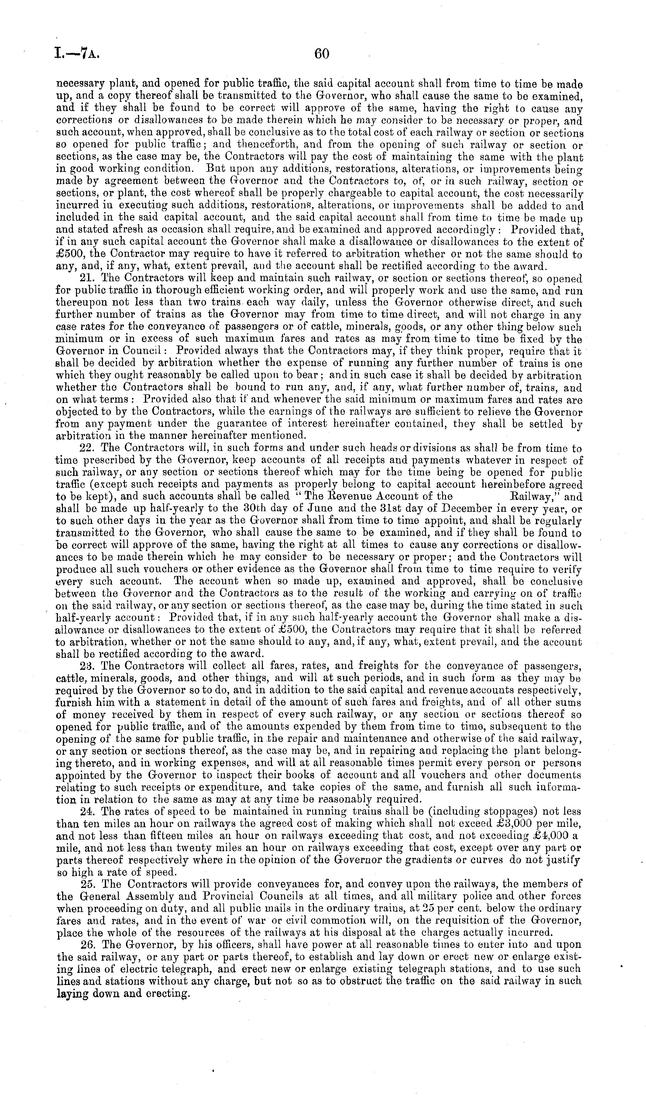 necessary plant, and opened for public traffic, the said capital account shall from time to time be made up, and a copy thereof shall be transmitted to the Governor, who shall cause the same to be examined, and. if they shall be found to be correct will approve of the same, having the right to cause any corrections or disallowances to be made therein which he may consider to be necessary or proper, and such account, when approved, shall be conclusive as to the total cost of each railway or section or sections so opened for public traffic; and thenceforth, and from the opening of such railway or section or sections, as the case may be, the Contractors will pay the cost of maintaining the same with the plant in good working condition. Bat upon any additions, restorations, alterations, or improvements being made by agreement between the Governor and the Contractors to, of, or in such railway, section or sections, or plant, the cost whereof shall be properly chargeable to capital account, the cost necessarily incurred in executing such additions, restorations, alterations, or improvements shall be added to and included in the said capital account, and the said capital account shall from time to time be made up and stated afresh as occasion shall require, and be examined and approved accordingly: Provided that, if in any such capital account the Governor shall make a disallowance or disallowances to the extent of £500, the Contractor may require, to have it referred to arbitration whether or not the same should to any, and, if any, what, extent prevail, and the account shall be rectified according to the award. 21. The Contractors will keep and maintain such railway, or section or sections thereof, so opened for public traffic in thorough efficient working order, and will properly work and use the same, and run thereupon not less than two trains each way daily, unless the Governor otherwise direct, and such further number of trains as the Governor may from time to time direct, and will not charge in any case rates for the conveyance of passengers or of cattle, minerals, goods, or any other thing below such minimum or in excess of such maximum fares and rates as may from time to time be fixed by the Governor in Council: Provided always that the Contractors may, if they think proper, require that it shall be decided by arbitration whether the expense of running any further number of trains is one which they ought reasonably be called upon to bear ; and in such case it shall be decided by arbitration whether the Contractors shall be bound to run any, and, if any, what further number of, trains, and on what terms : Provided also that if and whenever the said minimum or maximum fares and rates are objected to by the Contractors, while the earnings of the railways are sufficient to relieve the Governor from any payment under the guarantee of interest hereinafter contained, they shall be settled by arbitration in the manner hereinafter mentioned. 22. The Contractors will, in such forms and under such heads or divisions as shall be from time to time prescribed by the Governor, keep accounts of all receipts and payments whatever in respect of such railway, or any section or sections thereof which may for the time being be opened for public traffic (except such receipts and payments as properly belong to capital account hereinbefore agreed to be kept), and such accounts shall be called " The fievenue Account of the Kailway," and shall be made up half-yearly to the 30th day of June and the 31st day of December in every year, or to such other days in the year as the Governor shall from time to time appoint, and shall be regularly transmitted to the Governor, who shall cause the same to be examined, and if they shall be found to be correct will approve of the same, having the right at all times to cause any corrections or disallowances to be made therein which he may consider to be necessary or proper; and the Contractors will produce all such vouchers or other evidence as the Governor shall from time to time require to verify every such account. The account when so made up, examined and approved, shall be conclusive between the Governor and the Contractors as to the result of the working and carrying on of traffic on the said railway, or any section or sections thereof, as the case may be, during the time stated in such half-yearly account: Provided that, if in any such half-yearly account the Governor shall make a disallowance or disallowances to the extent of £500, the Contractors may require that it shall be referred to arbitration, whether or not the same should to any, and, if any, what, extent prevail, and the account shall be rectified according to the award. 23. The Contractors will collect all fares, rates, and freights for the conveyance of passengers, cattle, minerals, goods, and other things, and will at such periods, and in such form as they may be required by the Governor so to do, and in addition to the said capital and revenue accounts respectively, furnish him with a statement in detail of the amount of such fares aud freights, and of all other sums of money received by them in respect of every such railway, or any section or sections thereof so opened for public traffic, and of the amounts expended by them from time to time, subsequent to the opening of the same for public traffic, in the repair and maintenance and otherwise of the said railway, or any section or sections thereof, as the case may be, and in repairing and replacing the plant belonging thereto, and in working expenses, and will at all reasonable times permit every person or persons appointed by the Governor to inspect their books of account and all vouchers and other documents relating to such receipts or expenditure, and take copies of the same, and furnish all such information in relation to the same as may at any time be reasonably required. 24. The rates of speed to be maintained in running traius shall be (includin