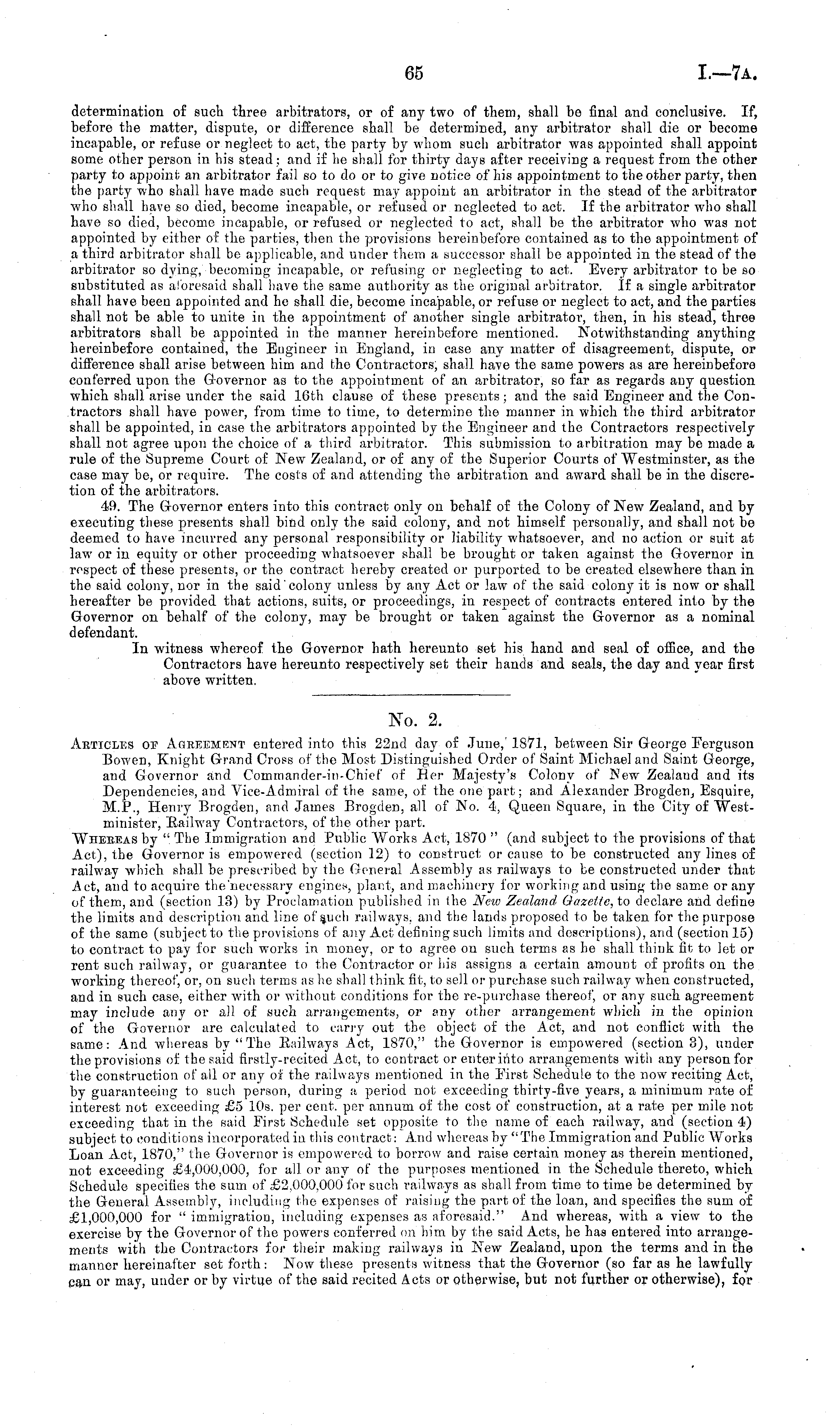 No. 2, Articles of Agreement entered into this 22nd day of June, 1871, between Sir George Ferguson Bowen, Knight Grand Cross of the Most Distinguished Order of Saint Michael and Saint George, and Governor and Commander-in-Chief of Her Majesty's Colony of New Zealaud and its Dependencies, and Vice-Admiral of the same, of the one part; and Alexander Brogden^ Esquire, M.P., Henry Brogden, and James Brogden, all of !N ro. 4, Queen Square, in the City of Westminister, Railway Contractors, of the other part. "Whereas by " The Immigration and Public "Works Act, 1870 " (and subject to the provisions of that Act), the Governor is empowered (section 12) to construct or cause to be constructed any lines of railway which shall be prescribed by the General Assembly as railways to be constructed under that Act, and to acquire the'necessary engines, plant, and machinery for working and using the same or any of them, and (section 13) by Proclamation published in the New Zealand Gazette, to declare and define the limits and description and line of such railways, and the lands proposed to be taken for the purpose of the same (subject to the provisions of any Act defining such limits and descriptions), and (section 15) to contract to pay for such works in money, or to agree on such terms as he shall think fit to let or rent such railway, or guarantee to the Contractor or his assigns a certain amount of profits on the working thereof, or, on such terms as he shall think fit, to sell or purchase such railway when constructed, and in such case, either with or without conditions for the re-purchase thereof, or any such, agreement may include any or all of such arrangements, or any other arrangement which in the opinion of the Governor are calculated to carry out the object of the Act, and not conflict with the same: And whereas by "The Railways Act, 1870," the Governor is empowered (section 3), under the provisions of the said firstly-recited Act, to contract or enter into arrangements with any person for the construction of all or any of the railways mentioned in the First Schedule to the now reciting Act, by guaranteeing to such person, during a period not exceeding thirty-five years, a minimum rate of interest not exceeding £5 10s. per cent, per annum of the cost of construction, at a rate per mile not exceeding that in the said First Schedule set opposite to the name of each railway, and (section 4) subject to conditions incorporated in this contract: And whereas by "The Immigration and Public Works Loan Act, 1870," the Governor is empowered to borrow and raise certain money as therein mentioned, not exceeding £4,000,000, for all or any of the purposes mentioned in the Schedule thereto, which Schedule specifies the sum of ,£2,000,000 for such railways as shall from time to time be determined by the General Assembly, including the expenses of raising the part of the loan, and specifies the sum of £1,000,000 for " immigration, including expenses as aforesaid." And whereas, with a view to the exercise by the Governor of the powers conferred on him by the said Acts, he has entered into arrangements with the Contractors for their making railways in New Zealand, upon the terms and in the manner hereinafter set forth: Now these presents witness that the Governor (so far as he lawfully can or may, under or by virtue of the said recited Acts or otherwise, but not further or otherwise), for