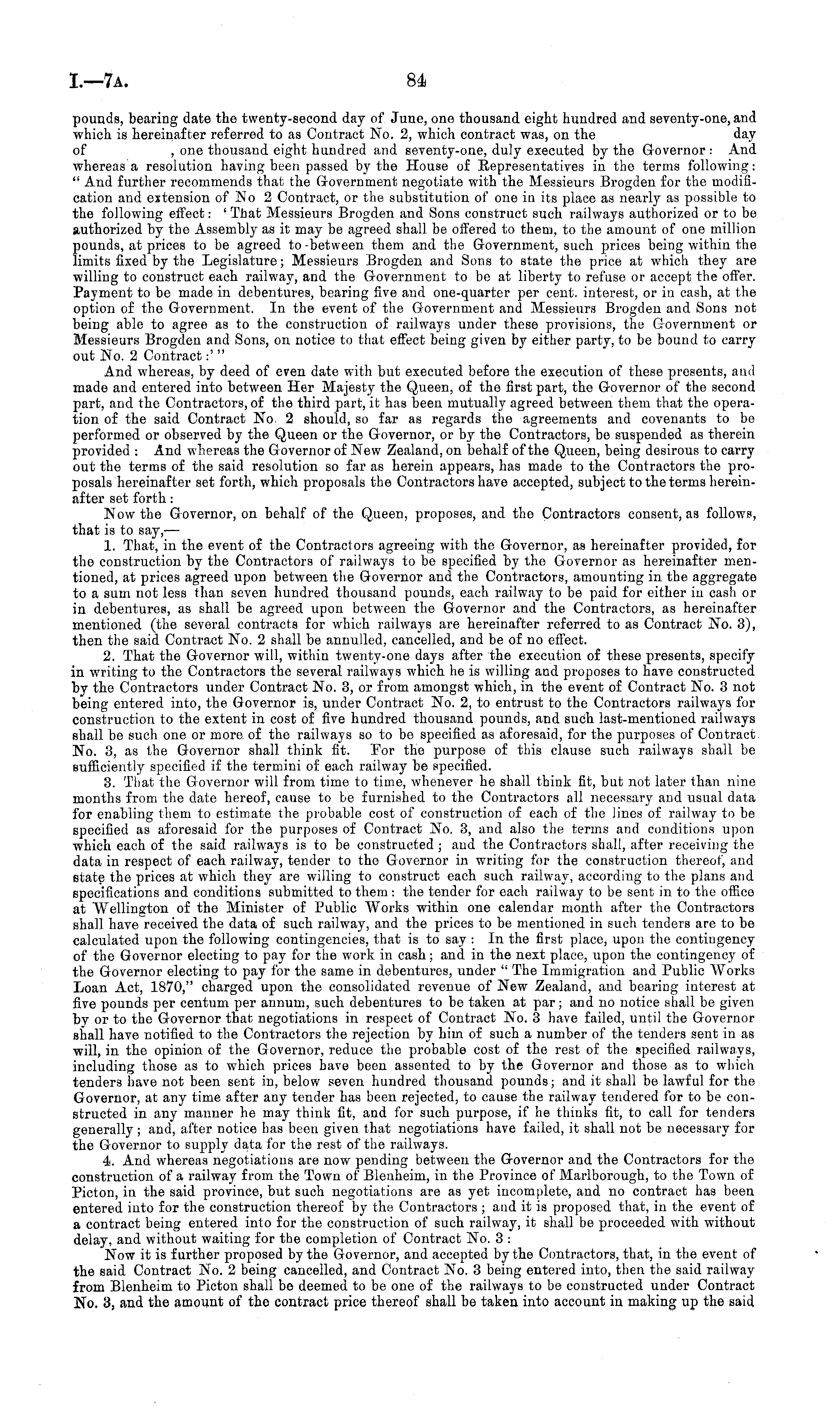pounds, bearing date the twenty-second day of June, one thousand eight hundred and seventy-one, and which is hereinafter referred to as Contract No. 2, which contract was, on the day of , one thousand eight hundred and seventy-one, duly executed by the Governor : And whereas a resolution having been passed by the House of Representatives in the terms following: " And further recommends that the Government negotiate with the Messieurs Brogden for the modification and extension of No 2 Contract, or the substitution of one in its place as nearly as possible to the following effect: 'That Messieurs Brogden and Sons construct such railways authorized or to be authorized by the Assembly as it may be agreed shall be offered to them, to the amount of one million pounds, at prices to be agreed to between them and the Government, such prices being within the limits fixed by the Legislature; Messieurs Brogden and Sons to state the price at which they are willing to construct each railway, and the Government to be at liberty to refuse or accept the offer. Payment to be made in debentures, bearing five and one-quarter per cent, interest, or in cash, at the option of the Government. In the event of the Government and Messieurs Brogden and Sons not being able to agree as to the construction of railways under these provisions, the Government or Messieurs Brogden and Sons, on notice to that effect being given by either party, to be bound to carry out No. 2 Contract:' " And whereas, by deed of even date with but executed before the execution of these presents, and made and entered into between Her Majesty the Queen, of the first part, the Governor of the second part, and the Contractors, of the third part, it has been mutually agreed between them that the operation of the said Contract No. 2 should, so far as regards the agreements and covenants to be performed or observed by the Queen or the Governor, or by the Contractors, be suspended as therein provided : And whereas the Governor of New Zealand, on behalf of the Queen, being desirous to carry out the terms of the said resolution so far as herein appears, has made to the Contractors the proposals hereinafter set forth, which proposals the Contractors have accepted, subject to the terms hereinafter set forth : Now the Governor, on behalf of the Queen, proposes, and the Contractors consent, as follows, that is to say, — 1. That, in the event of the Contractors agreeing with the Governor, as hereinafter provided, for the construction by the Contractors of railways to be specified by the Governor as hereinafter mentioned, at prices agreed upon between the Governor and the Contractors, amounting in the aggregate to a sum not less than seven hundred thousand pounds, each railway to be paid for either in cash or in debentures, as shall be agreed upon between the Governor and the Contractors, as hereinafter mentioned (the several contracts for which railways are hereinafter referred to as Contract No. 3), then the said. Contract No. 2 shall be annulled, cancelled, and be of no effect. 2. That the Governor will, within twenty-one days after the execution of these presents, specify in writing to the Contractors the several railways which he is willing and proposes to have constructed by the Contractors under Contract No. 3, or from amongst which, in the event of Contract No. 3 not being entered into, the Governor is, under Contract No. 2, to entrust to the Contractors railways for construction to the extent in cost of five hundred thousand pounds, and such last-mentioned railways shall be such one or more, of the railways so to be specified as aforesaid, for the purposes of Contract No. 3, as the Governor shall think fit. For the purpose of this clause such railways shall be sufficiently specified if the termini of each railway be specified. 3. That the Governor will from time to time, whenever he shall think fit, but not later than nine months from the date hereof, cause to be furnished to the Contractors all necessary and usual data for enabling them to estimate the probable cost of construction of each of the lines of railway to be specified as aforesaid for the purposes of Contract No. 3, and also the terms and conditions upon which each of the said railways is to be constructed ; and the Contractors shall, after receiving the data in respect of each railway, tender to the Governor in writing for the construction thereof, and state the prices at which they are willing to construct each such railway, according to the plans and specifications and conditions submitted to them : the tender for each railway to be sent in to the office at Wellington of the Minister of Public Works within one calendar month after the Contractors shall have received the data of such railway, and the prices to be mentioned in such tenders are to be calculated upon the following contingencies, that is to say : In the first place, upon the contingency of the Governor electing to pay for the work in cash; and in the next place, upon the contingency of the Governor electing to pay for the same in debentures, under " The Immigration and Public Works Loan Act, 1870," charged upon the consolidated revenue of New Zealand, and bearing interest at five pounds per centum per annum, such debentures to be taken at par; and no notice shall be given by or to the Governor that negotiations in respect of Contract No. 3 have failed, until the Governor shall have notified to the Contractors the rejection by him of such a number of the tenders sent in as will, in the opinion of the Governor, reduce the probable cost of the rest of the specified railways, including those as to which prices have been assented to by the Governor and those as to which tenders have not been sent in, below seven hundred thousand pounds; and it shall be lawful for the Governor, at any time after any tender has been rejected, to cause the railway tendered for to be constructed in any manner he may think fit, and for such purp