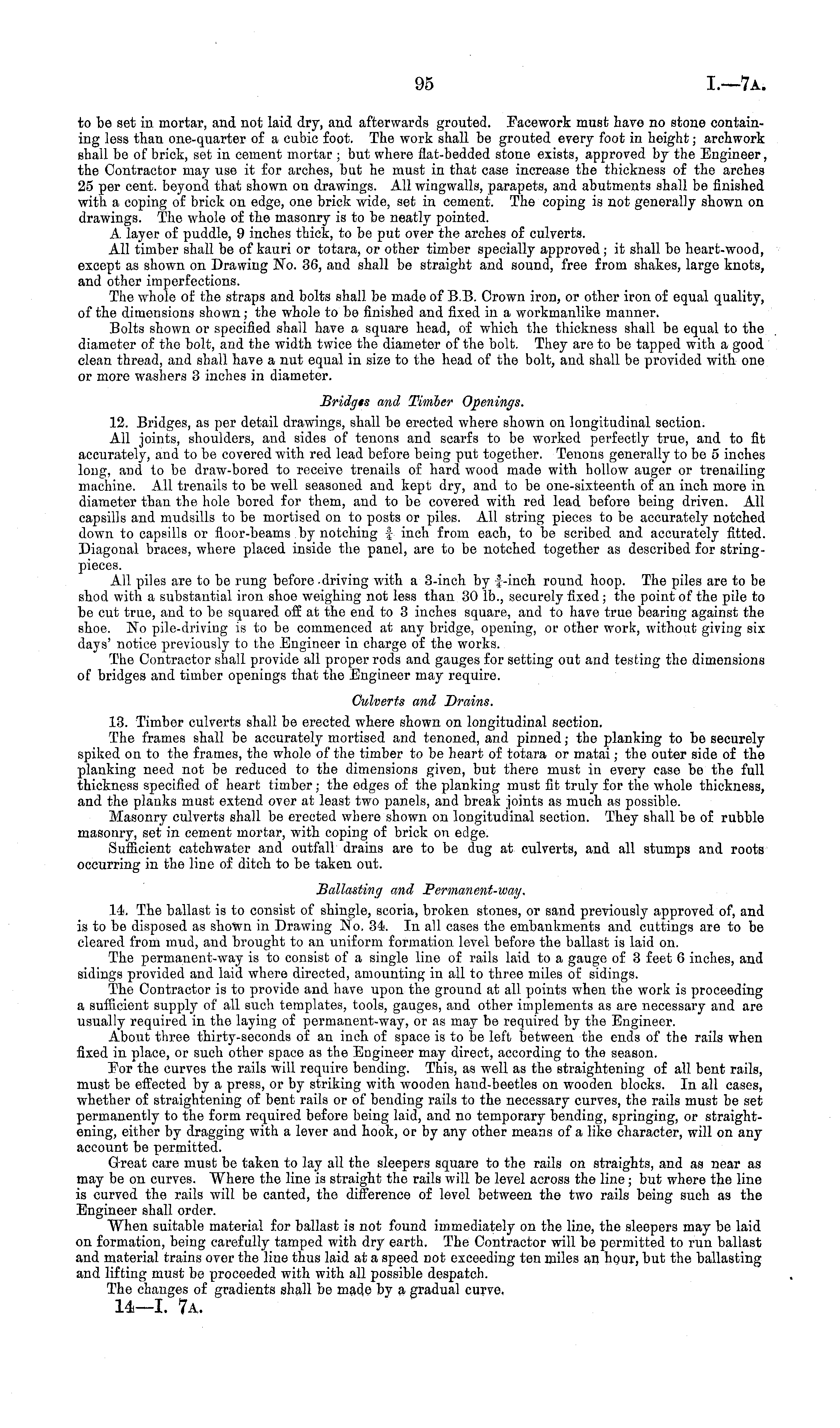 to be set in mortar, and not laid dry, and afterwards grouted. Facework must have no stone containing less than one-quarter of a cubic foot. The work shall be grouted every foot in height; archwork shall be of brick, set in cement mortar ; but where flat-bedded stone exists, approved by the Engineer, the Contractor may use it for arches, but he must in that case increase the thickness of the arches 25 per cent, beyond, that shown on drawings. All wingwalls, parapets, and abutments shall be finished with a coping of brick on edge, one brick wide, set in cement. The coping is not generally shown on drawings. The whole of the masonry is to be neatly pointed. A layer of puddle, 9 inches thick, to be put over the arches of culverts. All timber shall be of kauri or totara, or other timber specially approved; it shall be heart-wood, except as shown on Drawing No. 36, and shall be straight and sound, free from shakes, large knots, and other imperfections. The whole of the straps and bolts shall be made of 8.8. Crown iron, or other iron of equal quality, of the dimensions shown; the whole to be finished and fixed in a workmanlike manner. Bolts shown or specified shall have a square head, of which the thickness shall be equal to the diameter of the bolt, and the width twice the diameter of the bolt. They are to be tapped with a good clean thread, and shall have a nut equal in size to the head of the bolt, and shall be provided with one or more washers 3 inches in diameter. Bridgts and Timber Openings. 12. Bridges, as per detail drawings, shall be erected where shown on longitudinal section. All joints, shoulders, and sides of tenons and scarfs to be worked perfectly true, and to fit accurately, and to be covered with red lead before being put together. Tenons generally to be 5 inches long, and to be draw-bored to receive trenails of hard wood made with hollow auger or trenailing machine. All trenails to be well seasoned and kept dry, and to be one-sixteenth of an inch more in diameter than the hole bored for them, and to be covered with rod lead before being driven. All capsills and mudsills to be mortised on to posts or piles. All string pieces to be accurately notched down to capsills or floor-beams by notching f inch from each, to be scribed and accurately fitted. Diagonal braces, where placed inside the panel, are to be notched together as described for stringpieces. All piles are to be rung before -driving with a 3-inch by -f-inch round hoop. The piles are to be shod with a substantial iron shoe weighing not less than 30 lb., securely fixed; the point of the pile to be cut true, and to be squared off at the end to 3 inches square, and to have true bearing against the shoe. No pile-driving is to be commenced at any bridge, opening, or other work, without giving six days' notice previously to the Engineer in charge of the works. The Contractor shall provide all proper rods and gauges for setting out and testing the dimensions of bridges and timber openings that the Engineer may require. Culverts and Drains. 13. Timber culverts shall be erected where shown on longitudinal section. The frames shall be accurately mortised and tenoned, and pinned; the planking to be securely spiked on to the frames, the whole of the timber to be heart of totara or matai; the outer side of the planking need not be reduced to the dimensions given, but there must in every case be the full thickness specified of heart timber; the edges of the planking must fit truly for the whole thickness, and the planks must extend over at least two panels, and break joints as much as possible. Masonry culverts shall be erected where shown on longitudinal section. They shall be of rubble masonry, set in cement mortar, with coping of brick on edge. Sufficient catchwater and outfall drains are to be dug at culverts, and all stumps and roots occurring in the line of ditch to be taken out. Ballasting and Permanent-way. 14. The ballast is to consist of shingle, scoria, broken stones, or sand previously approved of, and is to be disposed as shown in Drawing No, 34. In all cases the embankments and cuttings are to be cleared from mud, and brought to an uniform formation level before the ballast is laid on. The permanent-way is to consist of a single line of rails laid to a gauge of 3 feet 6 inches, and sidings provided and laid where directed, amounting in all to three miles of sidings. The Contractor is to provide and have upon the ground at all points when the work is proceeding a sufficient supply of all such templates, tools, gauges, and other implements as are necessary and are usually required in the laying of permanent-way, or as may be required by the Engineer. About three thirty-seconds of an inch of space is to be left between the ends of the rails when fixed in place, or such other space as the Engineer may direct, according to the season. !Por the curves the rails will require bending. This, as well as the straightening of all bent rails, must be effected by a press, or by striking with wooden hand-beetles on wooden blocks. In all cases, whether of straightening of bent rails or of bending rails to the necessary curves, the rails must be set permanently to the form required before being laid, and no temporary bending, springing, or straightening, either by dragging with a lever and hook, or by any other means of a like character, will on any account be permitted. Great care must be taken to lay all the sleepers square to the rails on straights, and as near as may be on curves. Where the line is straight the rails will be level across the line ; but where the line is curved the rails will be canted, the difference of level between the two rails being such as the Engineer shall order. When suitable material for ballast is not found immediately on the line, the sleepers may be laid on formation, being carefully tamped with dry earth. The Contractor will be permitted to run ballast and material trains over the line thus laid at a sp
