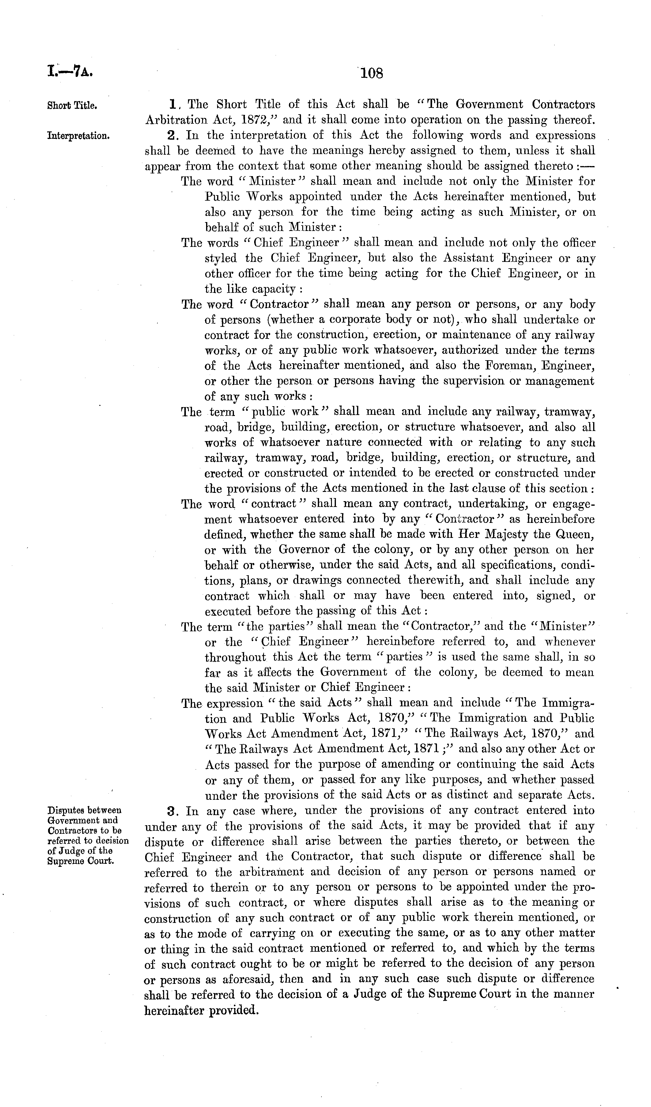 1. The Short Title of this Act shall be " The Government Contractors Arbitration Act, 1872," and it shall come into operation on the passing thereof. 2. In the interpretation of this Act the following words and expressions shall be deemed to have the meanings hereby assigned to them, unless it shall appear from the context that some other meaning should be assigned thereto : — The word " Minister" shall mean and include not only the Minister for Public Works appointed under the Acts hereinafter mentioned, but also any person for the time being acting as such Minister, or on behalf of such Minister : The words " Chief Engineer " shall mean and include not only the officer styled the Chief Engineer, but also the Assistant Engineer or any other officer for the time being acting for the Chief Engineer, or in the like capacity : The word " Contractor " shall mean any person or persons, or any body of persons (whether a corporate body or not), who shall undertake or contract for the construction, erection, or maintenance of any railway works, or of any public work whatsoever, authorized under the terms of the Acts hereinafter mentioned, and also the Foreman, Engineer, or other the person or persons having the supervision or management of any such works : The term "public work" shall mean and include any railway, tramway, road, bridge, building, erection, or structure whatsoever, and also all works of whatsoever nature connected with or relating to any such railway, tramway, road, bridge, building, erection, or structure, and erected or constructed or intended to be erected or constructed under the provisions of the Acts mentioned in the last clause of this section : The word " contract" shall mean any contract, undertaking, or engagement whatsoever entered into by any " Contractor" as hereinbefore denned, whether the same shall be made with Her Majesty the Queen, or with the Governor of the colony, or by any other person on her behalf or otherwise, under the said Acts, and all specifications, conditions, plans, or drawings connected therewith, and shall include any contract which shall or may have been entered into, signed, or executed before the passing of this Act •. The term "the parties" shall mean the "Contractor," and the "Minister" or the " Chief Engineer" hereinbefore referred to, and whenever throughout this Act the term " parties " is used the same shall, in so far as it affects the Government of the colony, be deemed to mean the said Minister or Chief Engineer: The expression " the said Acts " shall mean and include " The Immigration and Public Works Act, 1870," "The Immigration and Public Works Act Amendment Act, 1871," "The Railways Act, 1870," and " The Railways Act Amendment Act, 1871 •" and also any other Act or Acts passed for the purpose of amending or continuing the said Acts or any of them, or passed for any like purposes, and whether passed under the provisions of the said Acts or as distinct and separate Acts. 3. In any case where, under the provisions of any contract entered into under any of the provisions of the said Acts, it may be provided that if any dispute or difference shall arise between the parties thereto, or between the Chief Engineer and the Contractor, that such dispute or difference shall be referred to the arbitrament and decision of any person or persons named or referred to therein or to any person or persons to be appointed under the provisions of such contract, or where disputes shall arise as to the meaning or construction of any such contract or of any public work therein mentioned, or as to the mode of carrying on or executing the same, or as to any other matter or thing in the said contract mentioned or referred to, and which by the terms of such contract ought to be or might be referred to the decision of any person or persons as aforesaid, then and in any such case such dispute or difference shall be referred to the decision of a Judge of the Supreme Court in the manner hereinafter provided.