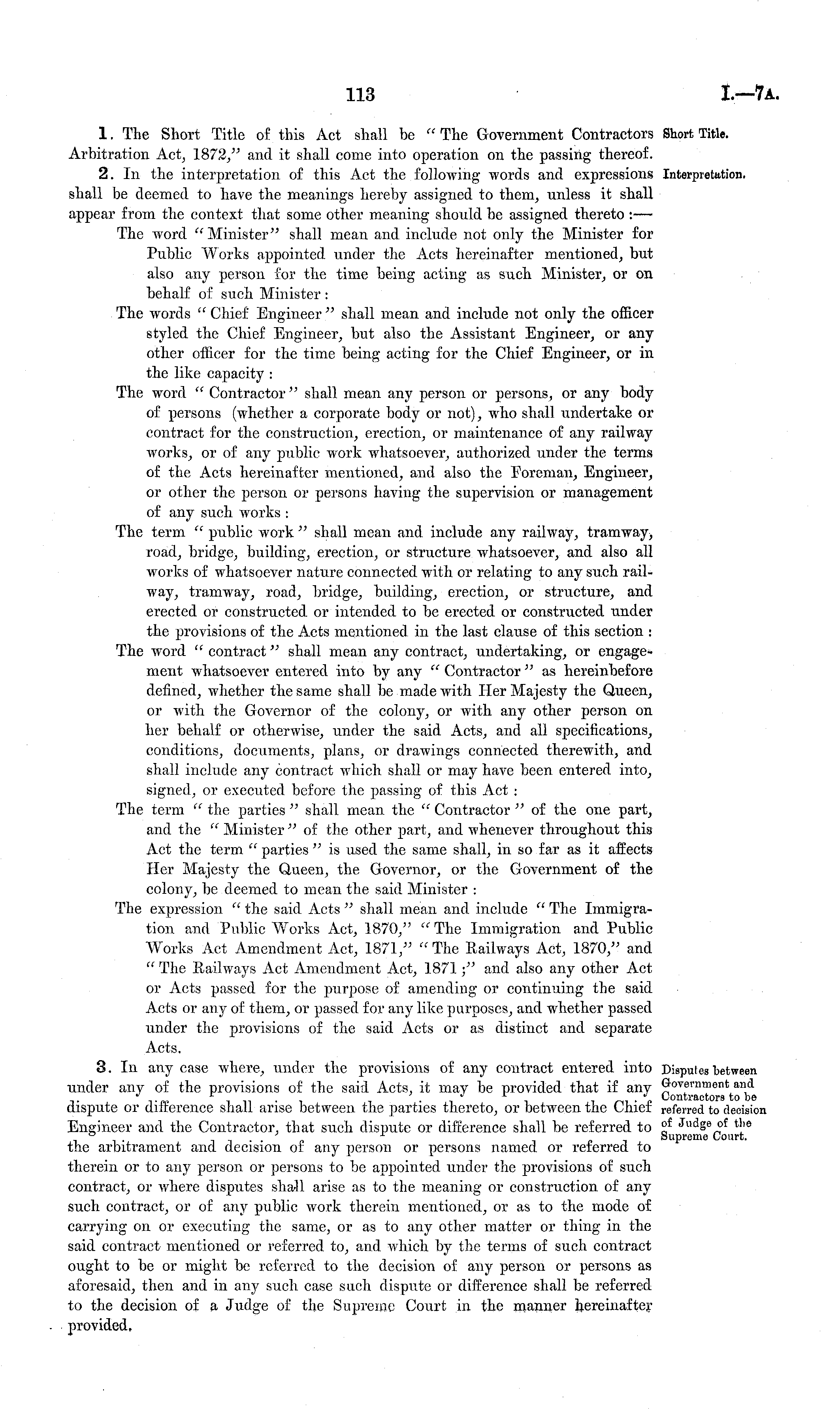 1. The Short Title of this Act shall be " The Government Contractors Arbitration Act, 1872," and it shall come into operation on the passing thereof. 2. In the interpretation of this Act the following words and expressions shall be deemed to have the meanings hereby assigned to them, unless it shall appear from the context that some other meaning should be assigned thereto : —■ The word "Minister" shall mean and include, not only the Minister for Public Works appointed under the Acts hereinafter mentioned, but also any person for the time being acting as such Minister, or on behalf of such Minister : The words " Chief Engineer " shall mean and include not only the officer styled the Chief Engineer, but also the Assistant Engineer, or any other officer for the time being acting for the Chief Engineer, or in the like capacity : The word " Contractor" shall mean any person or persons, or any body of persons (whether a corporate body or not), who shall undertake or contract for the construction, erection, or maintenance of any railway works, or of any public work whatsoever, authorized under the terms of the Acts hereinafter mentioned, and also the Foreman, Engineer, or other the person or persons having the supervision or management of any such works : The term " public work " shall mean and include any railway, tramway, road, bridge, building, erection, or structure whatsoever, and also all works of whatsoever nature connected with or relating to any such railway, tramway, road, bridge, building, erection, or structure, and erected or constructed or intended to be erected or constructed under the provisions of the Acts mentioned in the last clause of this section : The word " contract" shall mean any contract, undertaking, or engagement whatsoever entered into by any " Contractor" as hereinbefore denned, whether the same shall be made with Her Majesty the Queen, or with the Governor of the colony, or with any other person on her behalf or otherwise, under the said Acts, and all specifications, conditions, documents, plans, or drawings connected therewith, and shall include any contract which shall or may have been entered into, signed, or executed before the passing of this Act : The term " the parties " shall mean the " Contractor " of the one part, and the " Minister " of the other part, and whenever throughout this Act the term " parties " is used the same shall, in so far as it affects Her Majesty the Queen, the Governor, or the Government of the colony, be deemed to mean the said Minister : The expression " the said Acts " shall mean and include " The Immigration and Public Works Act, 1870," " The Immigration and Public Works Act Amendment Act, 1871," " The Railways Act, 1870," and " The Railways Act Amendment Act, 1871 ;" and also any other Act or Acts passed for the purpose of amending or continuing the said Acts or any of them, or passed for any like purposes, and whether passed under the provisions of the said Acts or as distinct and separate Acts. 8. In any case where, under the provisions of any contract entered into under any of the provisions of the said Acts, it may be provided that if any dispute or difference shall arise between the parties thereto, or between the Chief Engineer and the Contractor, that such dispute or difference shall be referred to the arbitrament and decision of any person or persons named or referred to therein or to any person or persons to be appointed under the provisions of such contract, or where disputes shall arise as to the meaning or construction of any such contract, or of any public work therein mentioned, or as to the mode of carrying on or executing the same, or as to any other matter or thing in the said contract mentioned or referred to, and which by the terms of such contract ought to be or might be referred to the decision of any person or persons as aforesaid, then and in any such case such dispute or difference shall be referred to the decision of a Judge of the Supreme Court in the manner hereinafter provided.
