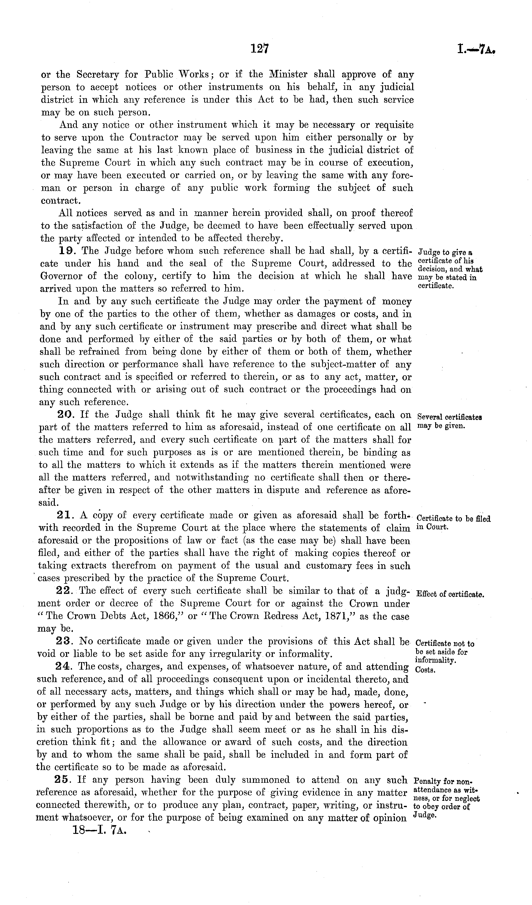 or the Secretary for Public Works; or if the Minister shall approve of any person to accept notices or other instruments on his behalf, in any judicial district in which any reference is under this Act to be had, then such service may be on such person. And any notice or other instrument which it may be necessary or requisite to serve upon the Contractor may be served upon him either personally or by leaving the same at his last known place of business in the judicial district of the Supreme Court in which any such contract may be in course of execution, or may have been executed or carried on, or by leaving the same with any foreman or person in charge of any public work forming the subject of such contract. All notices served as and in manner herein provided shall, on proof thereof to the satisfaction of the Judge, be deemed to have been effectually served upon the party affected or intended to be affected thereby. 19. The Judge before whom such reference shall be had shall, by a certificate under his hand and the seal of the Supreme Court, addressed to the Governor of the colony, certify to him the decision at which he shall have arrived upon the matters so referred to him. In and by any such certificate the Judge may order the payment of money by one of the parties to the other of them, whether as damages or costs, and in and by any such certificate or instrument may prescribe and direct what shall be done and performed by either of the said parties or by both of them, or whai shall be refrained from being done by either of them or both of them, whether such direction or performance shall have reference to the subject-matter of any such contract and is specified or referred to therein, or as to any act, matter, 01 thing connected with or arising out of such contract or the proceedings had on any such reference. 20. If the Judge shall think fit he may give several certificates, each on part of the matters referred to him as aforesaid, instead of one certificate on all the matters referred, and every such certificate on part of the matters shall for such time and for such purposes as is or are mentioned therein, be binding as to all the matters to which it extends as if the matters therein mentioned were all the matters referred, and notwithstanding no certificate shall then or thereafter be given in respect of the other matters in dispute and reference as aforesaid. 21. A copy of every certificate made or given as aforesaid shall be forthwith recorded in the Supreme Court at the place where the statements of claim aforesaid or the propositions of law or fact (as the case may be) shall have been filed, and either of the parties shall have the right of making copies thereof or taking extracts therefrom on payment of the usual and customary fees in such cases prescribed by the practice of the Supreme Court. 22. The effect of every such certificate shall be similar to that of a judgment order or decree of the Supreme Court for or against the Crown under "The Crown Debts Act, 1866," or "The Crown Redress Act, 1871," as the case may be. 23. No certificate made or given under the provisions of this Act shall be void or liable to be set aside for any irregularity or informality. 24. The costs, charges, and expenses, of whatsoever nature, of and attending such reference, and of all proceedings consequent upon or incidental thereto, and of all necessary acts, matters, and things which shall or may be had, made, done, or performed by any such Judge or by his direction under the powers hereof, or by either of the parties, shall be borne and paid by and between the said parties, in such proportions as to the Judge shall seem meet or as he shall in his discretion think fit; and the allowance or award of such costs, and the direction by and to whom the same shall be paid, shall be included in and form part of the certificate so to be made as aforesaid. 25. If any person having been duly summoned to attend on any such reference as aforesaid, whether for the purpose of giving evidence in any matter connected therewith, or to produce any plan, contract, paper, writing, or instrument whatsoever, or for the purpose of being examined on any matter of opinion 18—1. 7a.