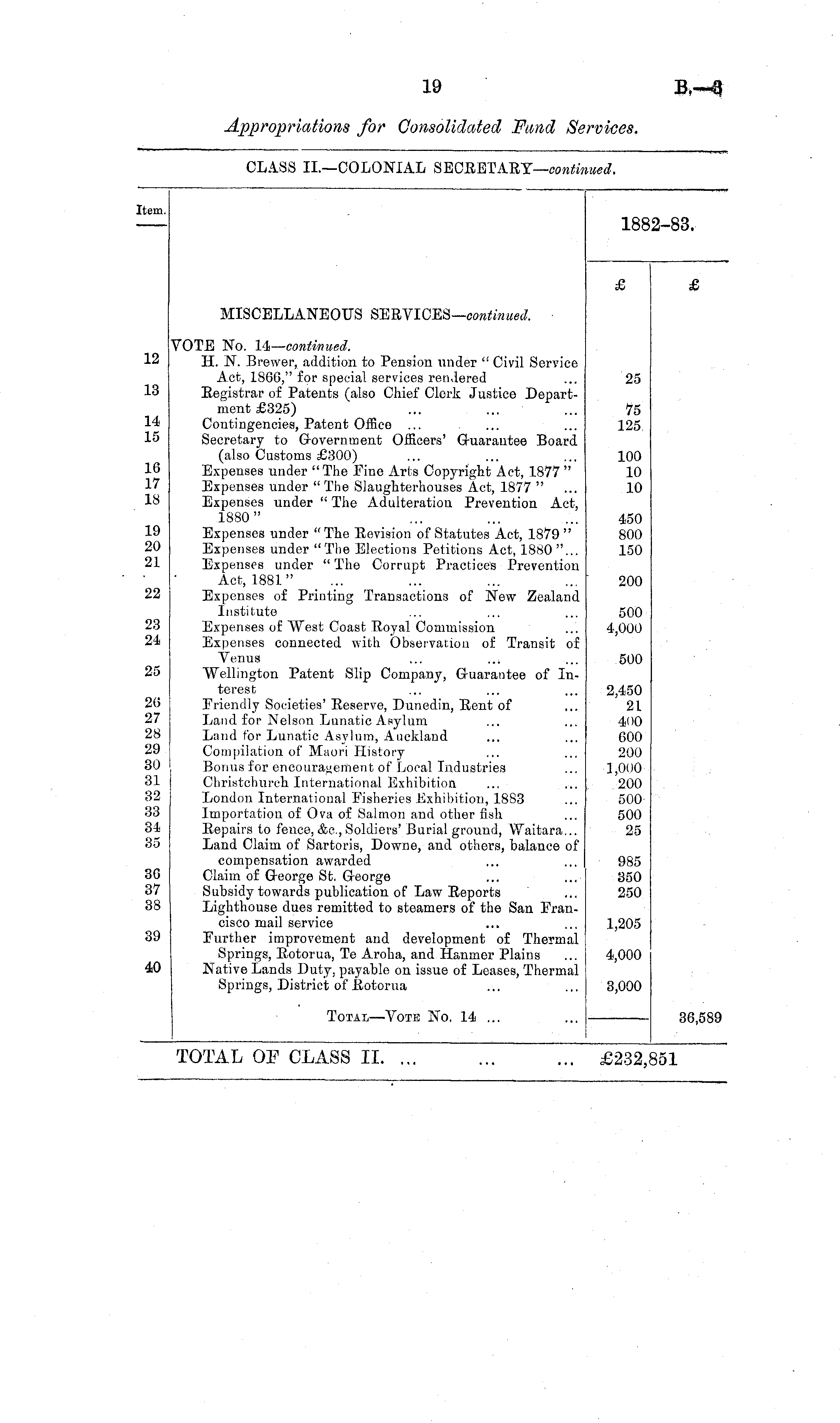 "tern. 18, 2-83. MISCELLANEOUS SERVICES— continued. 12 13 14 15 16 17 18 19 20 21 22 23 24 25 VOTE No. 14— continued. H. N. Brewer, addition to Pension under " Civil Service Act, 1866," for special services rendered Registrar of Patents (also Chief Clerk Justice Department £325) Contingencies, Patent Office Secretary to Government Officers' Guarantee Board (also Customs £300) Expenses under " The Fine Arts Copyright Act, 1877 " Expenses under " The Slaughterhouses Act, 1877 " Expenses under " The Adulteration Prevention Act, 1880" Expenses under "The Revision of Statutes Act, 1879" Expenses under "The Elections Petitions Act, 1880 "... Expenses under " The Corrupt Practices Prevention Act, 1.881" Expenses of Printing Transactions of New Zealand Institute Expenses of West Coast Royal Commission Expenses connected with Observation of Transit of Venus Wellington Patent Slip Company, Guarantee of Interest Friendly Societies' Reserve, Dunedin, Rent of Land for Nelson Lunatic Asylum Land for Lunatic Asylum, Auckland Compilation of Maori History Bonus for encouragement of Local Industries Christchurch International Exhibition London International Fisheries Exhibition, 1883 Importation of Ova of Salmon and other fish Repairs to fence, &c, Soldiers' Burial ground, Waitara... Land Claim of Sartoris, Downe, and others, balance of compensation awarded Claim of George St. George Subsidy towards publication of Law Reports Lighthouse dues remitted to steamers of the San Francisco mail service Further improvement and development of Thermal Springs, Rotorua, To Aroha, and Hanmer Plains Native Lands Duty, payable on issue of Leases, Thermal Springs, District of Rotorua 25 75 125 100 10 10 450 800 150 200 500 4,000 500 26 27 28 29 30 31 32 33 34 35 2,450 21 400 600 200 1,000 200 500 500 25 36 37 38 985 350 250 39 1,205 40 4,000 3,000 Total—Vote No. 14 ... 36,589 TOTAL OE CLASS II. £232,851