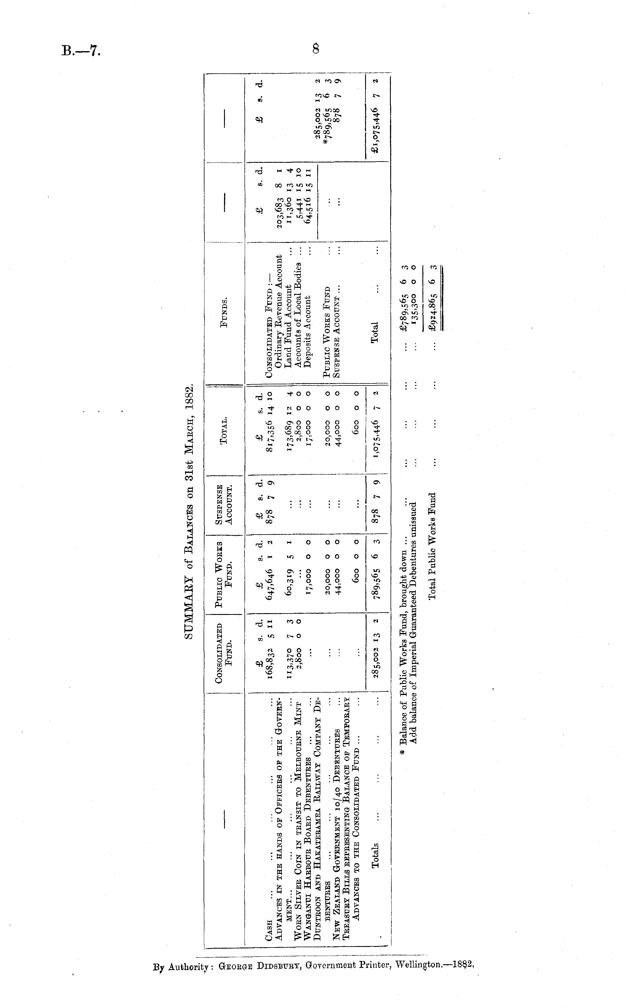 Consolidated Fund. Public Woees Fund. Suspense Account. Total. Funds. Cash Advances in the hands op Officebs op the G-oveen-MENT... Woen Silvee Coin in teansit to Melbouene Mikt Wanqanfi Haebotte Boaed Dbbentubes DUNTEOON AND HaKATEEAMEA RAILWAY COMPANY Debentuees jS"ew Zealand Govebnment 10/40 Debentuees Teeasuey Bills eepeesentino Balance of Tempoeaby Advances to the Consolidated Fund ... £ s. d. 168,832 5 11 s s. a. 647,646 I 2 £ s. d. 878 7 9 £ s. d. 817,356 14 10 Consolidated Fund : — Ordinary Revenue Account Land Fund Account Accounts of Local Bodies ... Deposits Account £ s. d. £ s. d. "3,37o 7 3 2,800 o o 6°,3i9 5 1 173,689 12 4 2,800 o o 17,000 o o 203,683 8 1 11,360 13 4 5,441 15 10 64,516 15 11 285,002 13 a *?89,S65 6 3 878 7 9 17,000 o o 20,000 o o 44,000 o o 1 ... 20,000 O O 44,000 o o Public Woeks Fukd Suspense Account ... 600 o o ... 600 o o £i,o75.446 7 2 Totals 878 7 9 i Total 285,002 13 2 789>5 6 5 6 3 1,075,446 7 2