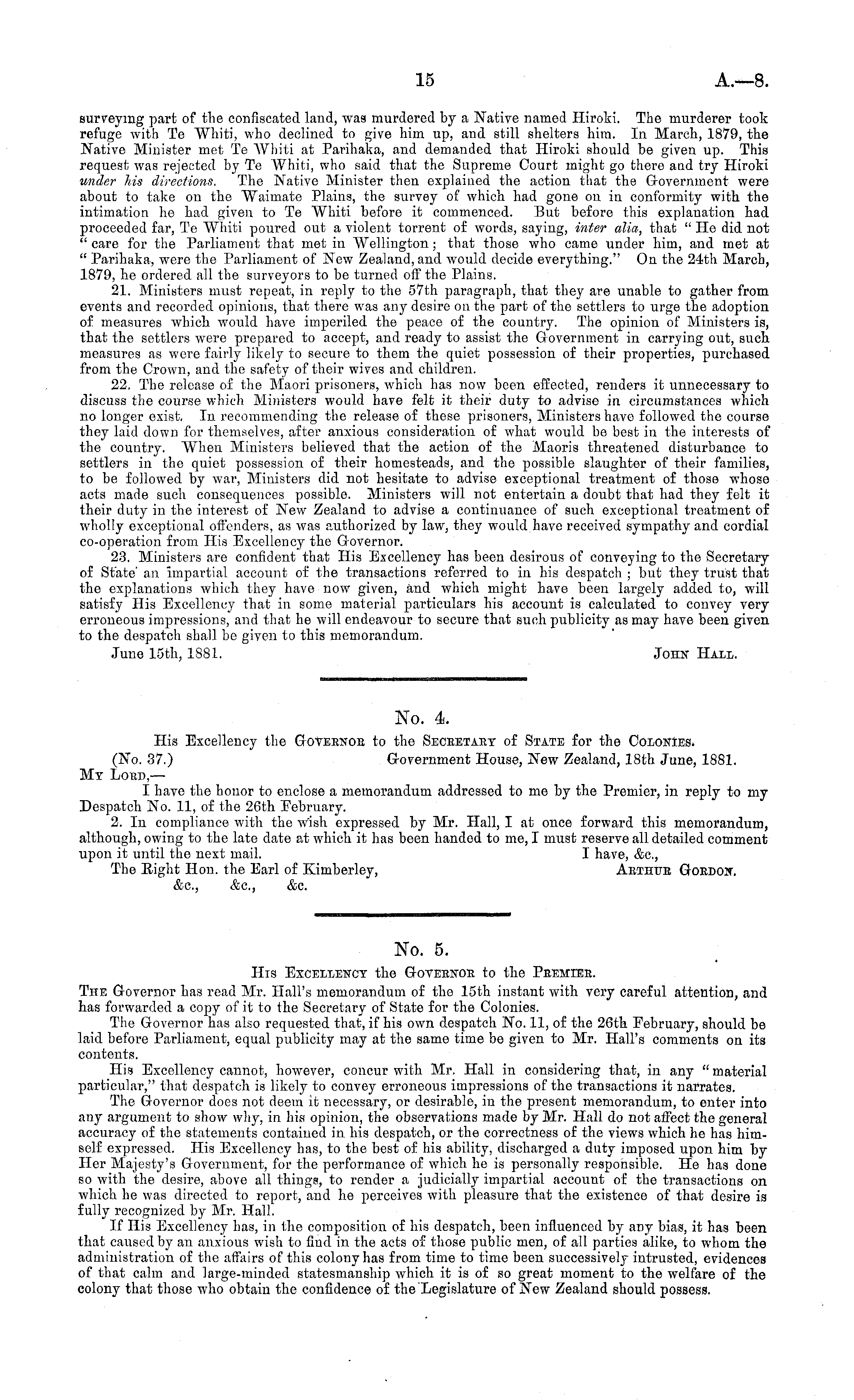 surveying part of the confiscated land, was murdered by a Native named Hiroki. The murderer took refuge with Te Whiti, who declined to give him up, and still shelters him. In March, 1879, the Native Minister met Te Whiti at Parihaka, and demanded that Hiroki should be given up. This request was rejected by Te Whiti, who said that the Supreme Court might go there and try Hiroki under Ms directions. The Native Minister then explained the action that the Government were about to take on the Waimate Plains, the survey of which had gone on in conformity with the intimation he had given to Te Whiti before it commenced. But before this explanation had proceeded far, Te Whiti poured out a violent torrent of words, saying, inter alia, that " He did not " care for the Parliament that met in Wellington; that those who came under him, and met at " Parihaka, were the Parliament of New Zealand, and would decide everything." On the 24th March, 1879, he ordered all the surveyors to be turned off the Plains. 21. Ministers must repeat, in reply to the 57th paragraph, that they are unable to gather from events and recorded opinions, that there was any desire on the part of the settlers to urge the adoption of measures which would have imperiled the peace of the country. The opinion of Ministers is, that the settlers were prepared to accept, and ready to assist the Government in carrying out, such measures as were fairly likely to secure to them the quiet possession of their properties, purchased from the Crown, and the safety of their wives and children. 22. The release of the Maori prisoners, which has now been effected, renders it unnecessary to discuss the course which Ministers would have felt it their duty to advise in circumstances which no longer exist, In recommending the release of these prisoners, Ministers have followed the course they laid down for themselves, after anxious consideration of what would be best in the interests of the country. When Ministers believed that the action of the Maoris threatened disturbance to settlers in the quiet possession of their homesteads, and the possible slaughter of their families, to be followed by war, Ministers did not hesitate to advise exceptional treatment of those whose acts made such consequences possible. Ministers will not entertain a doubt that had they felt it their duty in the interest of New Zealand to advise a continuance of such exceptional treatment of wholly exceptional offenders, as was authorized by law, they would have received sympathy and cordial co-operation from His Excellency the Governor. 23. Ministers are confident that His Excellency has been desirous of conveying to the Secretary of State' an impartial account of the transactions referred to in his despatch ; but they trust that the explanations which they have now given, and which might have been largely added to, will satisfy His Excellency that in some material particulars his account is calculated to convey very erroneous impressions, and that he will endeavour to secure that such publicity as may have been given to the despatch shall be given to this memorandum. June 15th, 1881. John Hall.