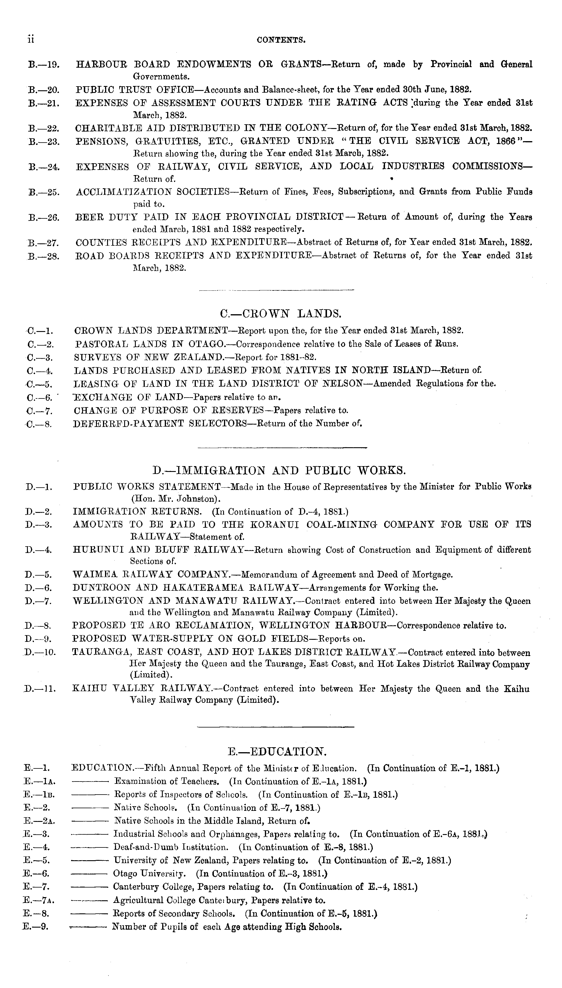D.—IMMIGRATION AND PUBLIC WORKS. D.—1. PUBLIC WORKS STATEMENT—Made in the House of Representatives by the Minister for Public Works (Hon. Mr. Johnston). D.—2. IMMIGRATION RETURNS. (In Continuation of D.-4, 18S1.) D.—3. AMOUNTS TO BE PAID TO THE KORANUI COAL-MINING COMPANY FOE, USE OF ITS RAILWAY—Statement of. D.—4. HURUNUI AND BLUFF RAILWAY—Return showing Cost of Construction and Equipment of different Sections of. D.—5. WAIMEA RAILWAY COMPANY.—Memorandum of Agreement and Deed of Mortgage. D.—6. DUNTR00N AND HAKATERAMEA RAILWAY—Arrangements for Working the. D.—7. WELLINGTON AND MANAWATU RAILWAY.—Contract entered into between Her Majesty the Queen and the Wellington and Manawatu Railway Company (Limited). D.—8. PROPOSED TE ARO RECLAMATION, WELLINGTON HARBOUR—Correspondence relative to. D.—9. PROPOSED WATER-SUPPLY ON GOLD FIELDS—Reports on. D.—10. TAURANGA, EAST COAST, AND HOT LAKES DISTRICT RAILWAY—Contract entered into between Her Majesty the Queen and the Tauranga, East Coast, and Hot Lakes District Railway Company (Limited). D.—11. KAIHU VALLEY RAILWAY.—Contract entered into between Her Majesty the Queen and the Kaihu Valley Railway Company (Limited).